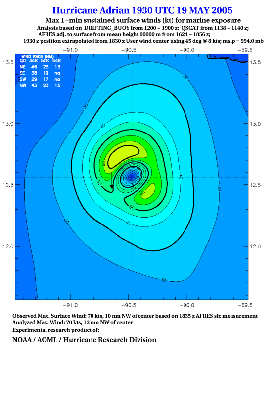 As a public service we are hosting the legacy H*wind archive that was formerly available through NOAA. Most of the archive was conducted in real-time so data collected after the analysis time were not available. Methods used to conduct the analyses evolved over the years. Grid spacing is on the order of 6 km and maximum domain size varies but is typically 8 x 8 degrees. There are known errors in some of the data coverage, mapping, and gridded products. For more information on the archive please go here. For realtime and post storm analysis of the 2014 season and a revised historical archive go here. |
