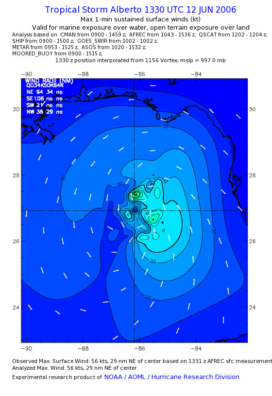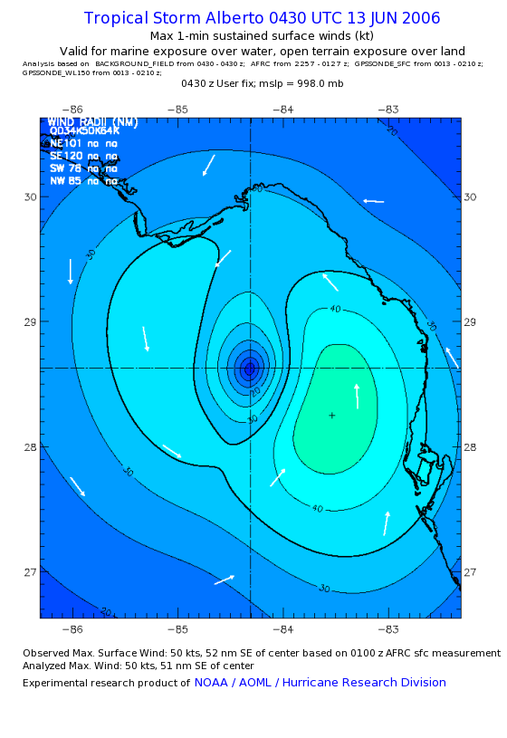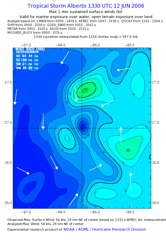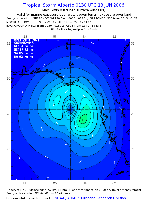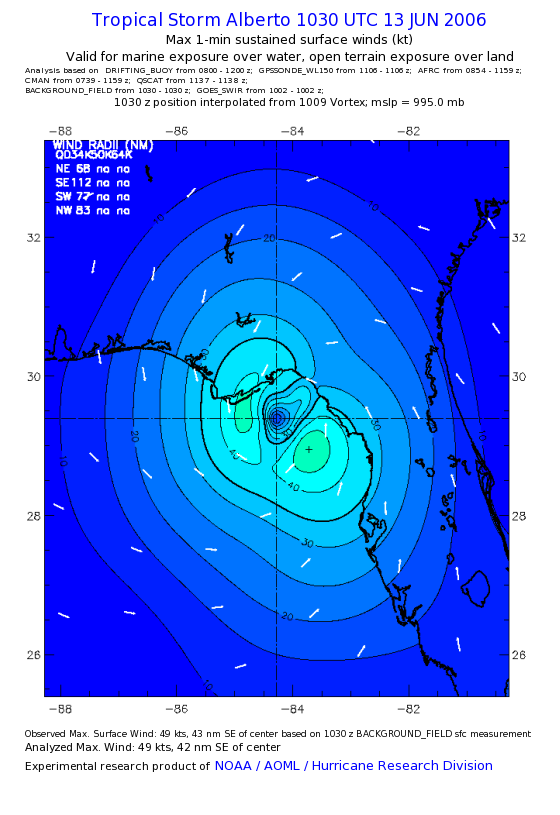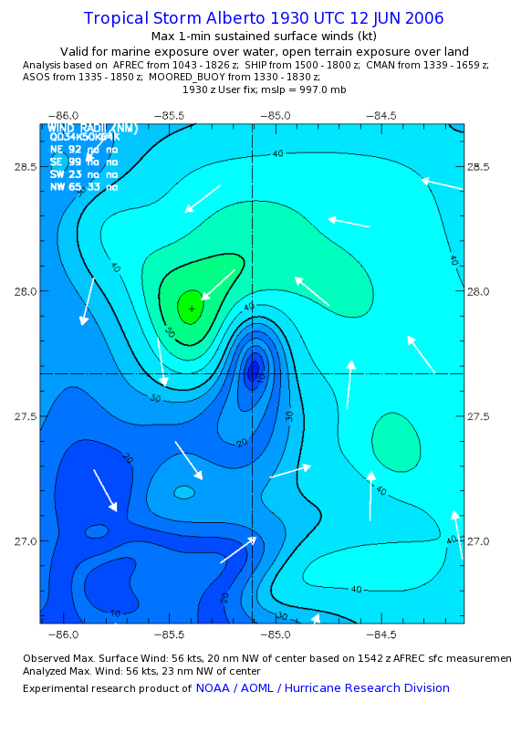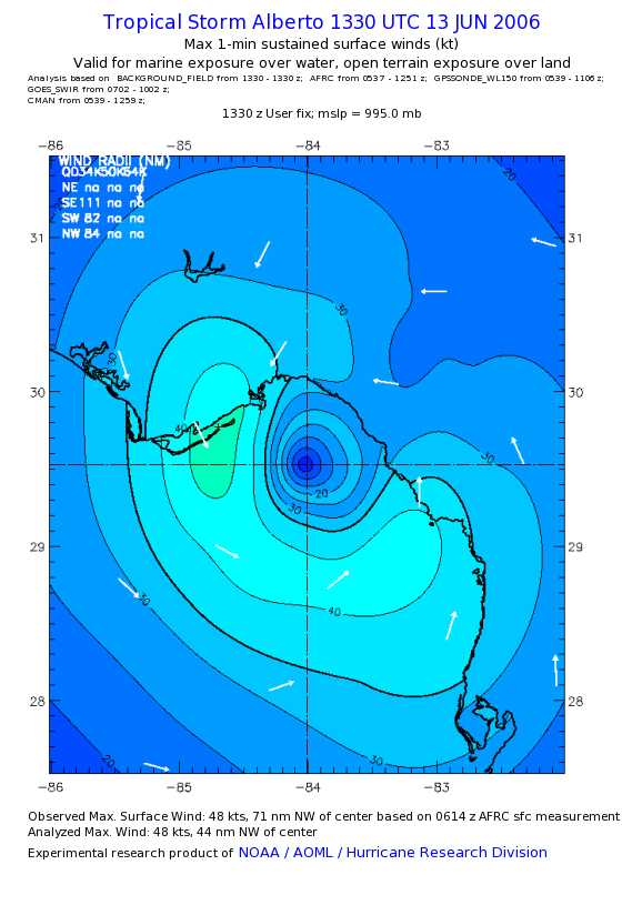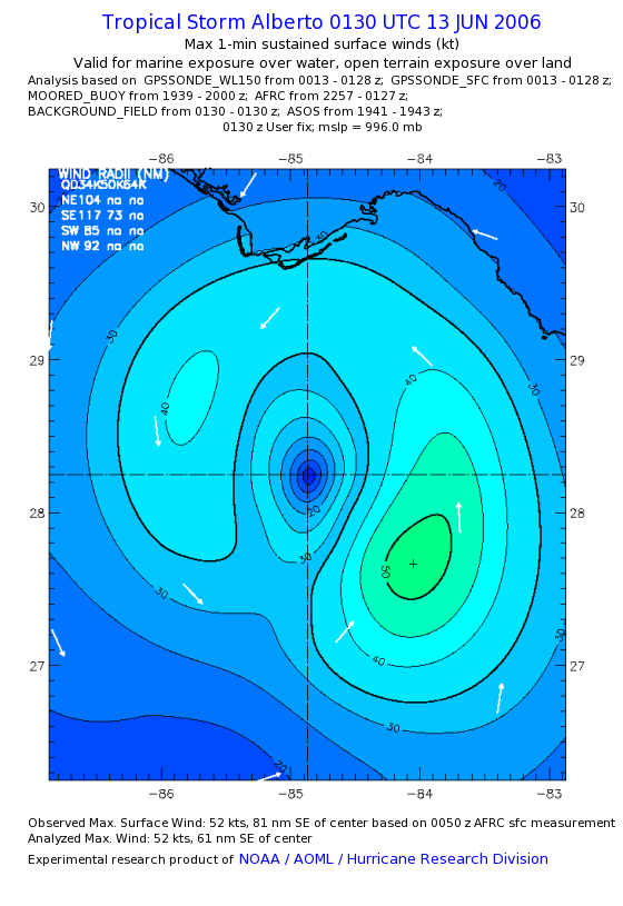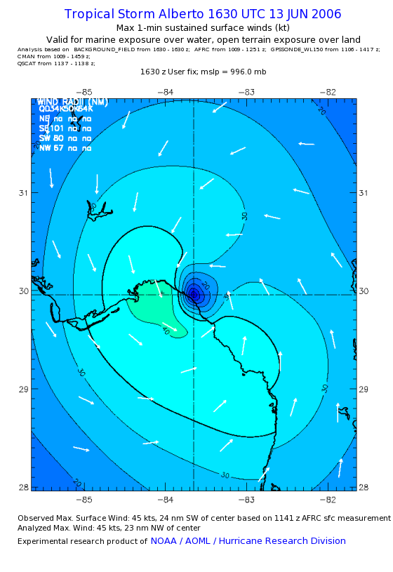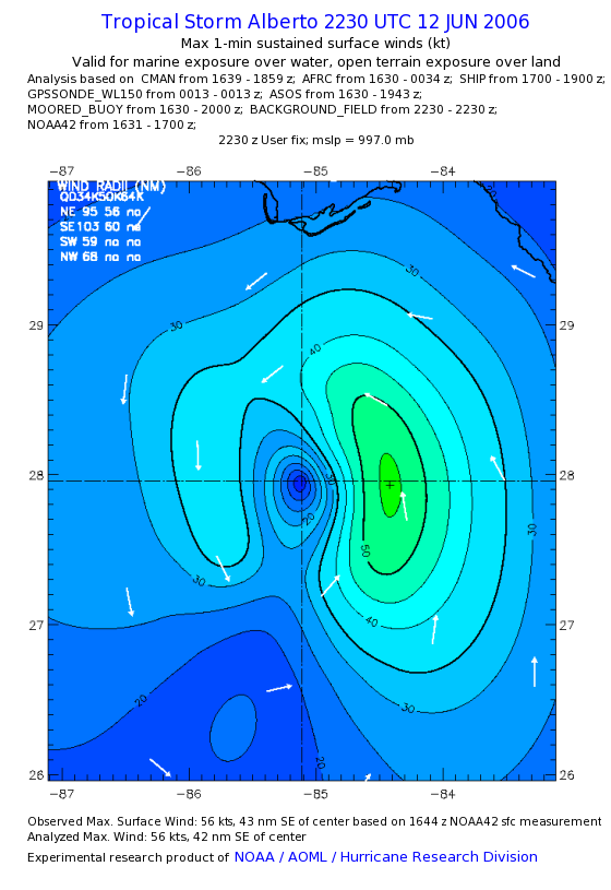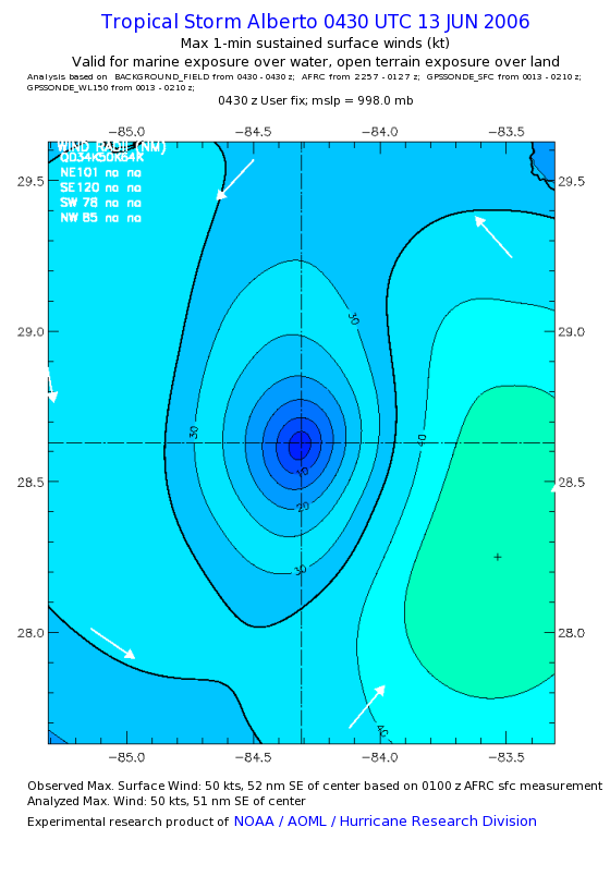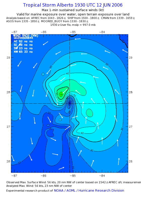 As a public service we are hosting the legacy H*wind archive that was formerly available through NOAA. Most of the archive was conducted in real-time so data collected after the analysis time were not available. Methods used to conduct the analyses evolved over the years. Grid spacing is on the order of 6 km and maximum domain size varies but is typically 8 x 8 degrees. There are known errors in some of the data coverage, mapping, and gridded products. For more information on the archive please go here. For realtime and post storm analysis of the 2014 season and a revised historical archive go here.