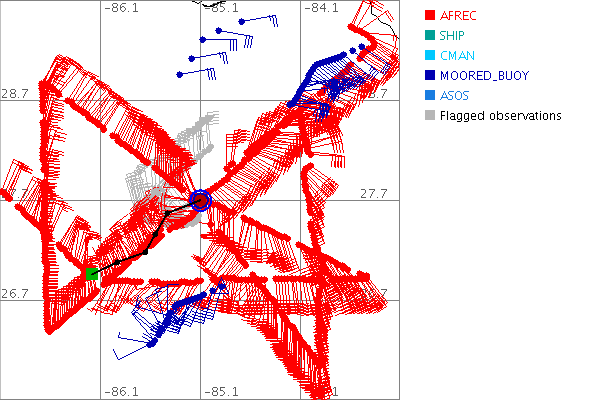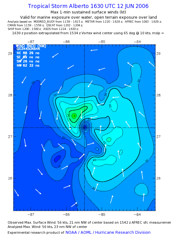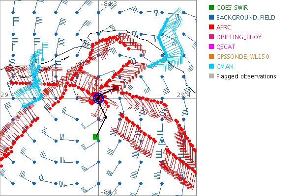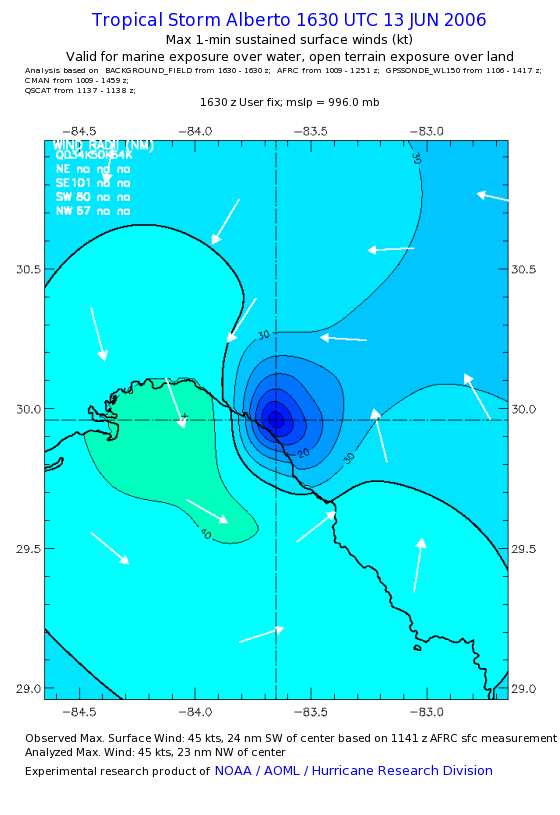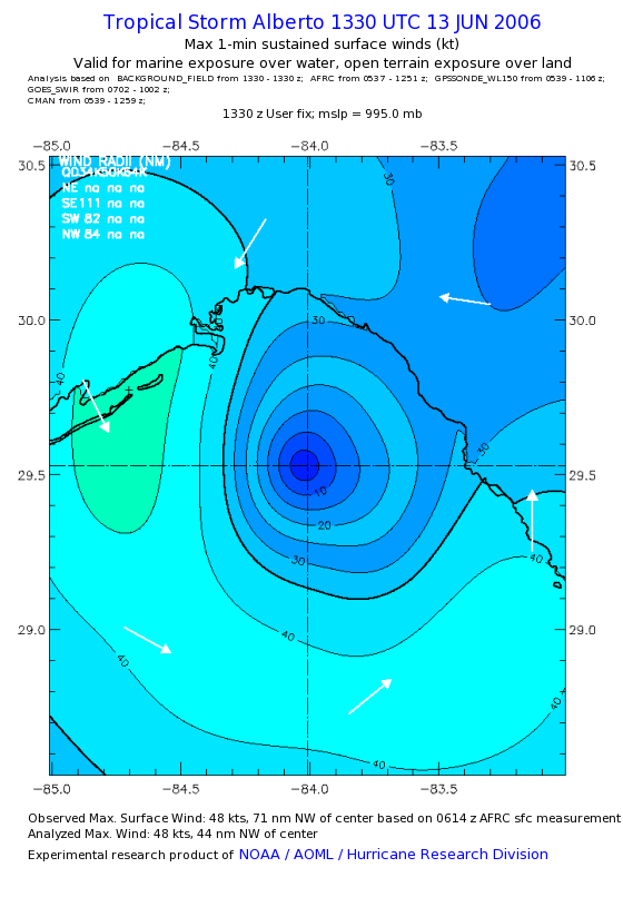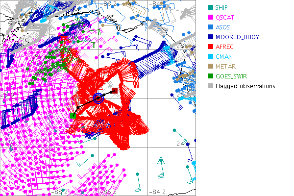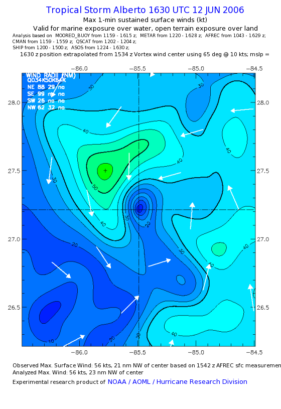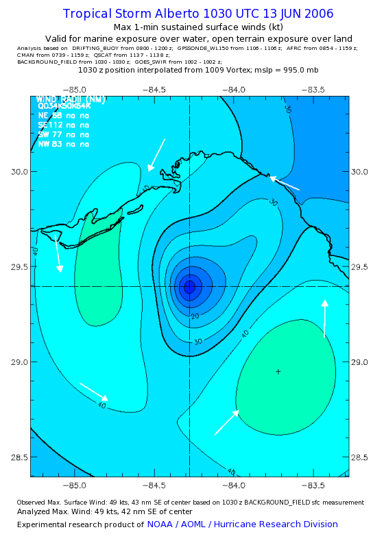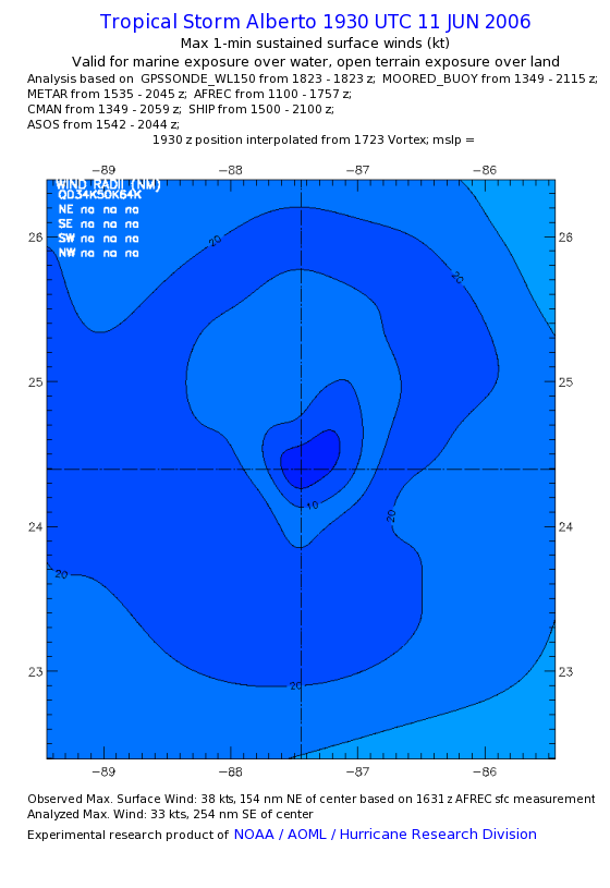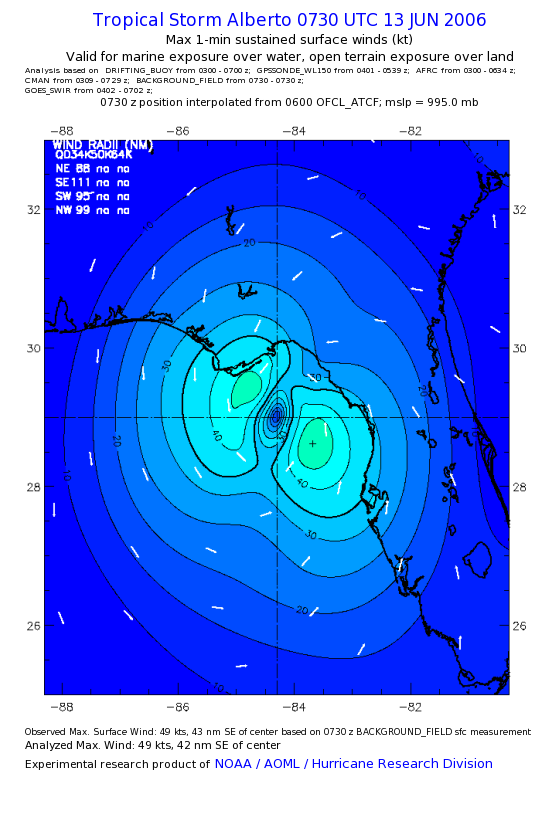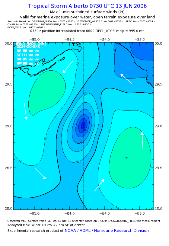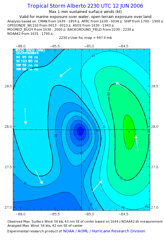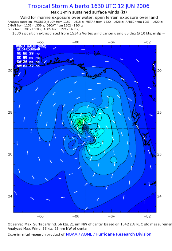 As a public service we are hosting the legacy H*wind archive that was formerly available through NOAA. Most of the archive was conducted in real-time so data collected after the analysis time were not available. Methods used to conduct the analyses evolved over the years. Grid spacing is on the order of 6 km and maximum domain size varies but is typically 8 x 8 degrees. There are known errors in some of the data coverage, mapping, and gridded products. For more information on the archive please go here. For realtime and post storm analysis of the 2014 season and a revised historical archive go here.