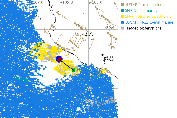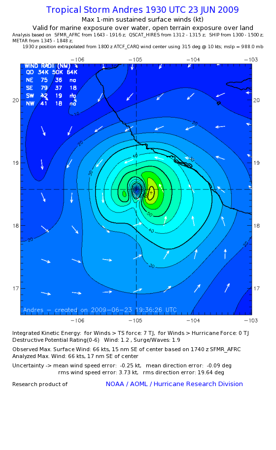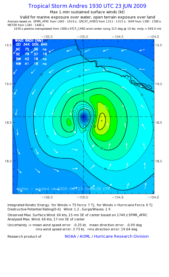 As a public service we are hosting the legacy H*wind archive that was formerly available through NOAA. Most of the archive was conducted in real-time so data collected after the analysis time were not available. Methods used to conduct the analyses evolved over the years. Grid spacing is on the order of 6 km and maximum domain size varies but is typically 8 x 8 degrees. There are known errors in some of the data coverage, mapping, and gridded products. For more information on the archive please go here. For realtime and post storm analysis of the 2014 season and a revised historical archive go here.