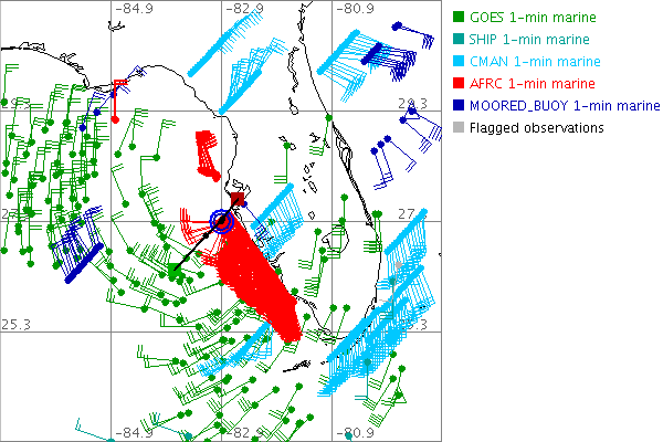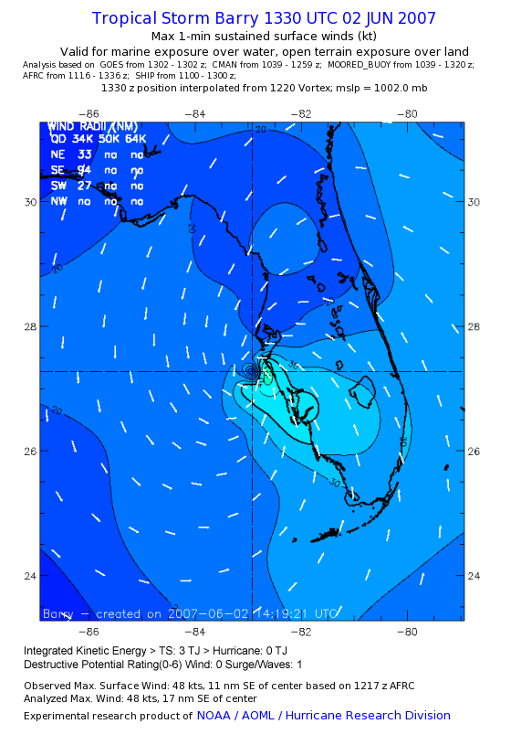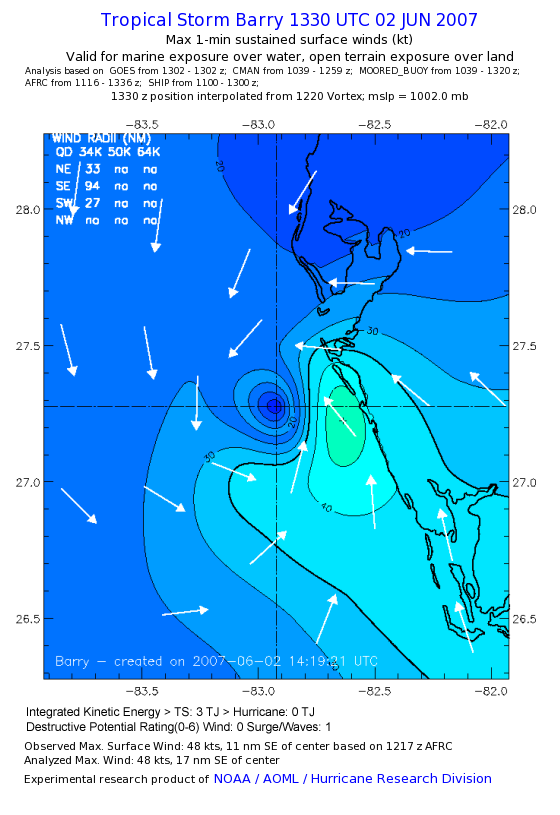 As a public service we are hosting the legacy H*wind archive that was formerly available through NOAA. Most of the archive was conducted in real-time so data collected after the analysis time were not available. Methods used to conduct the analyses evolved over the years. Grid spacing is on the order of 6 km and maximum domain size varies but is typically 8 x 8 degrees. There are known errors in some of the data coverage, mapping, and gridded products. For more information on the archive please go here. For realtime and post storm analysis of the 2014 season and a revised historical archive go here.