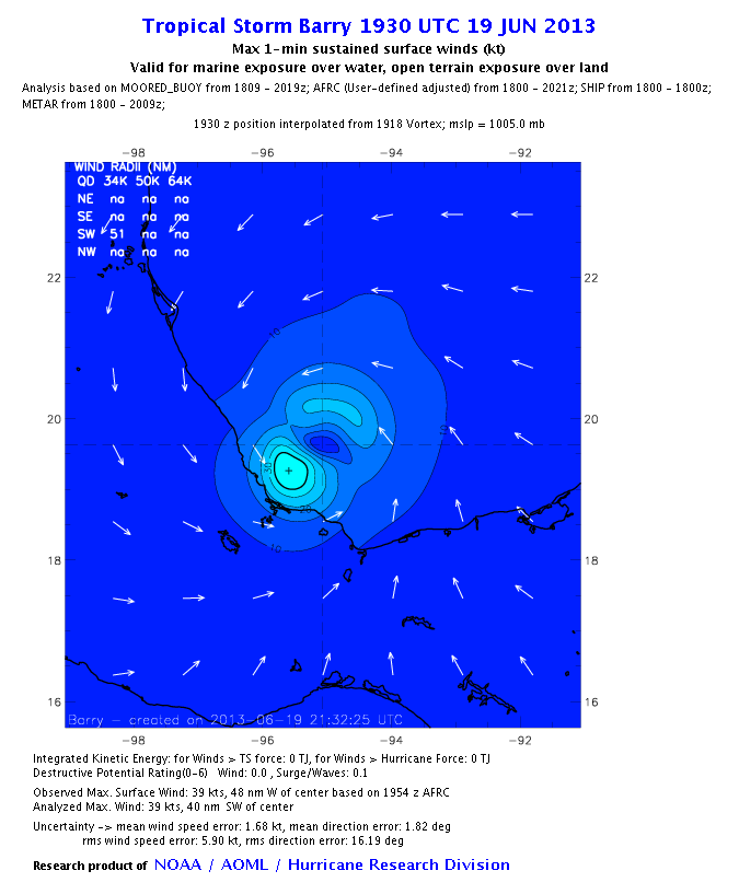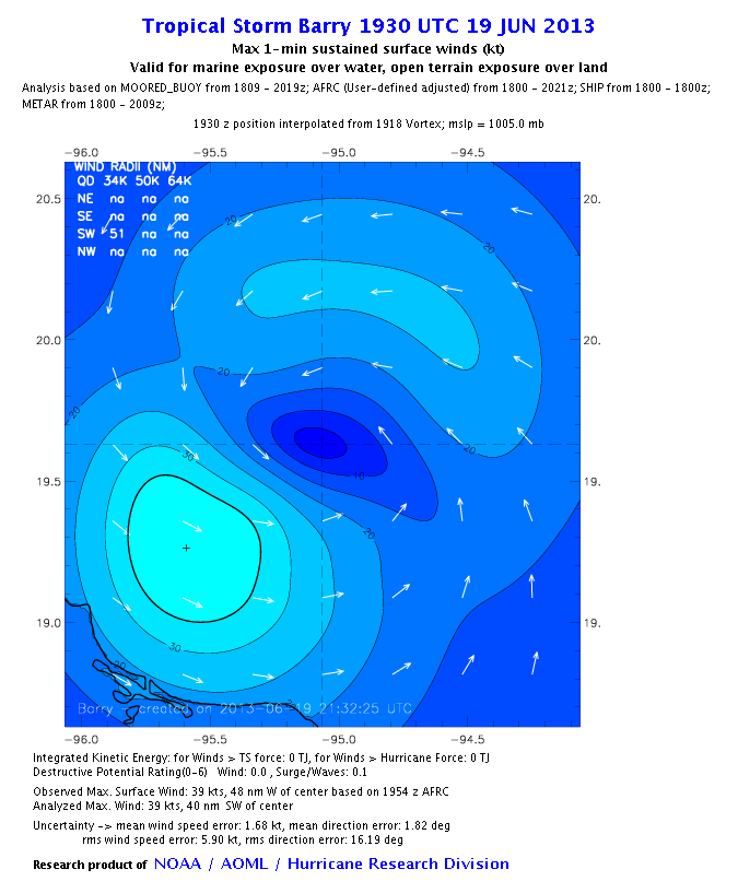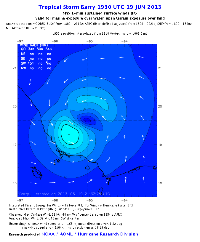 As a public service we are hosting the legacy H*wind archive that was formerly available through NOAA. Most of the archive was conducted in real-time so data collected after the analysis time were not available. Methods used to conduct the analyses evolved over the years. Grid spacing is on the order of 6 km and maximum domain size varies but is typically 8 x 8 degrees. There are known errors in some of the data coverage, mapping, and gridded products. For more information on the archive please go here. For realtime and post storm analysis of the 2014 season and a revised historical archive go here.