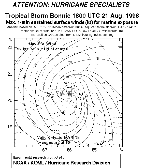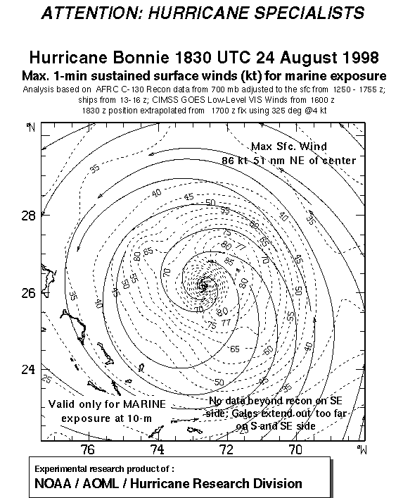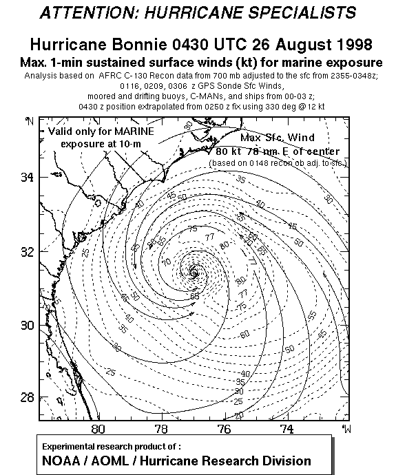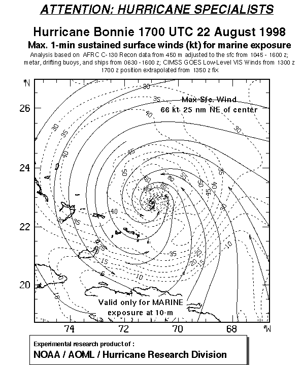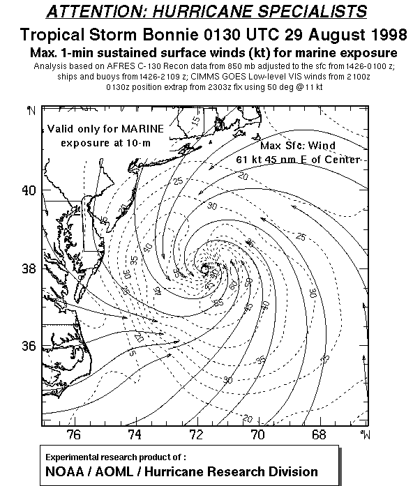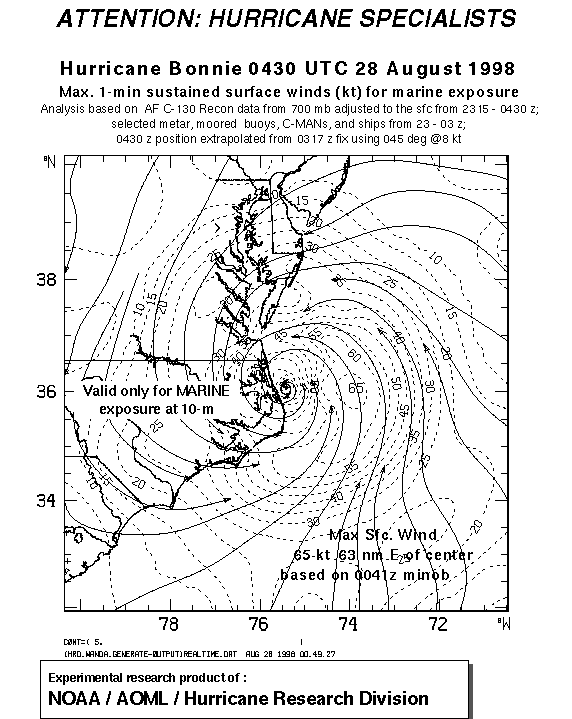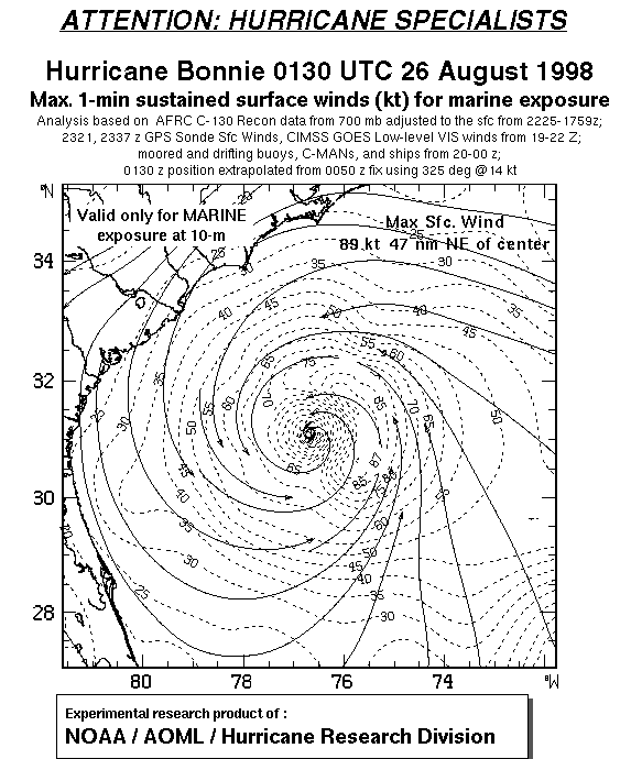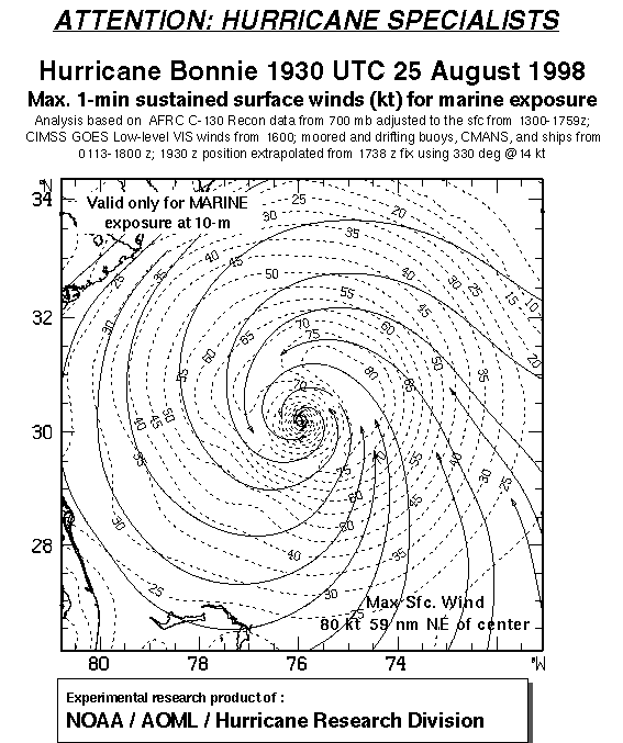 As a public service we are hosting the legacy H*wind archive that was formerly available through NOAA. Most of the archive was conducted in real-time so data collected after the analysis time were not available. Methods used to conduct the analyses evolved over the years. Grid spacing is on the order of 6 km and maximum domain size varies but is typically 8 x 8 degrees. There are known errors in some of the data coverage, mapping, and gridded products. For more information on the archive please go here. For realtime and post storm analysis of the 2014 season and a revised historical archive go here.