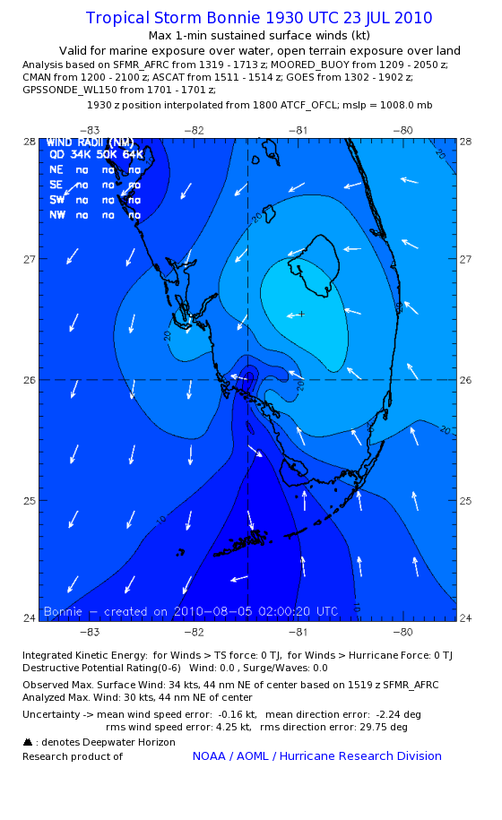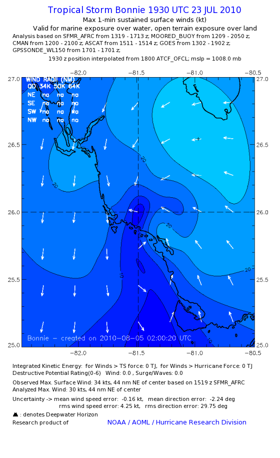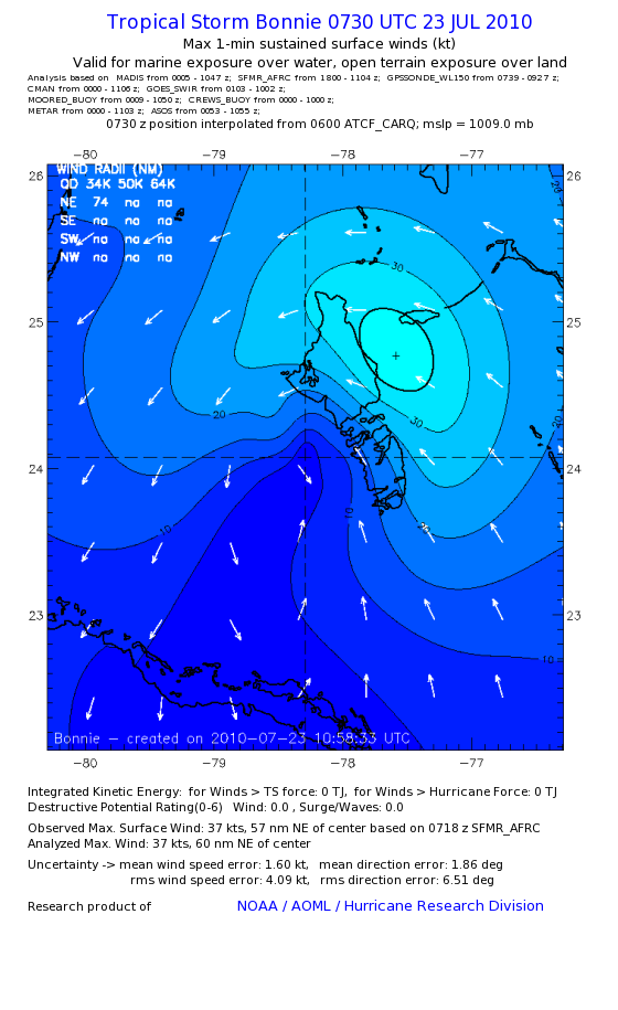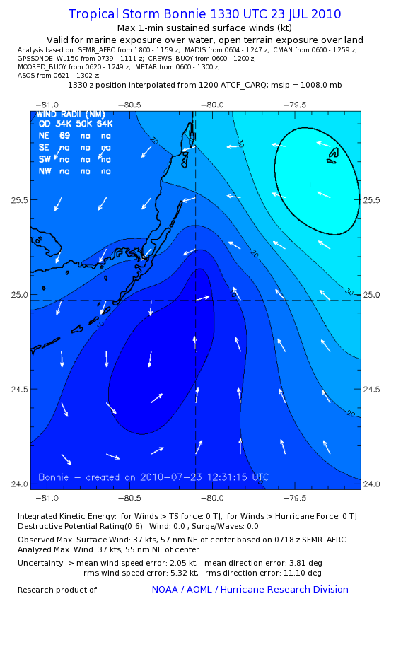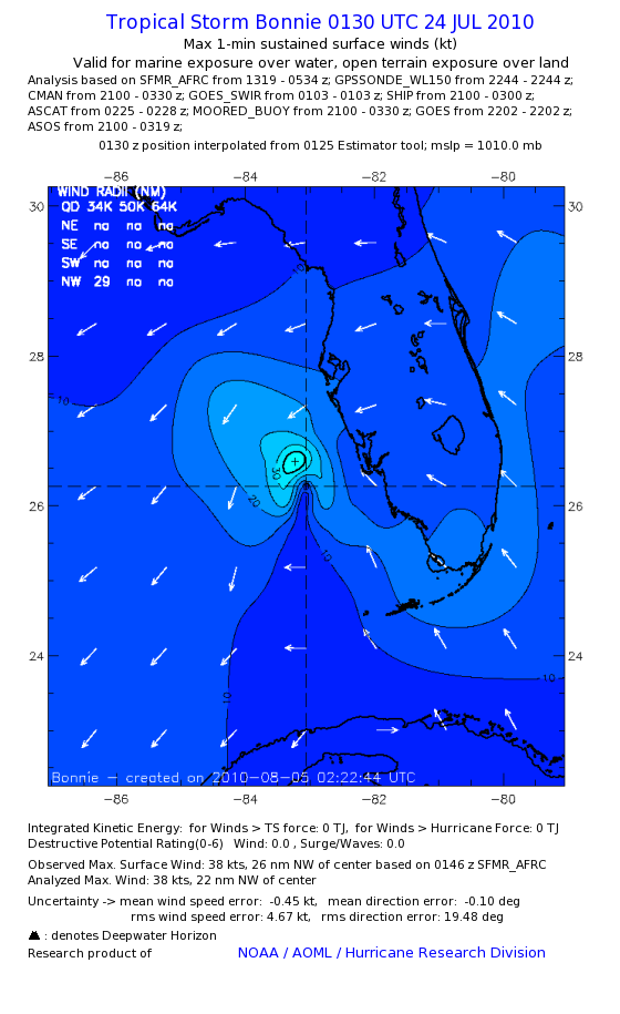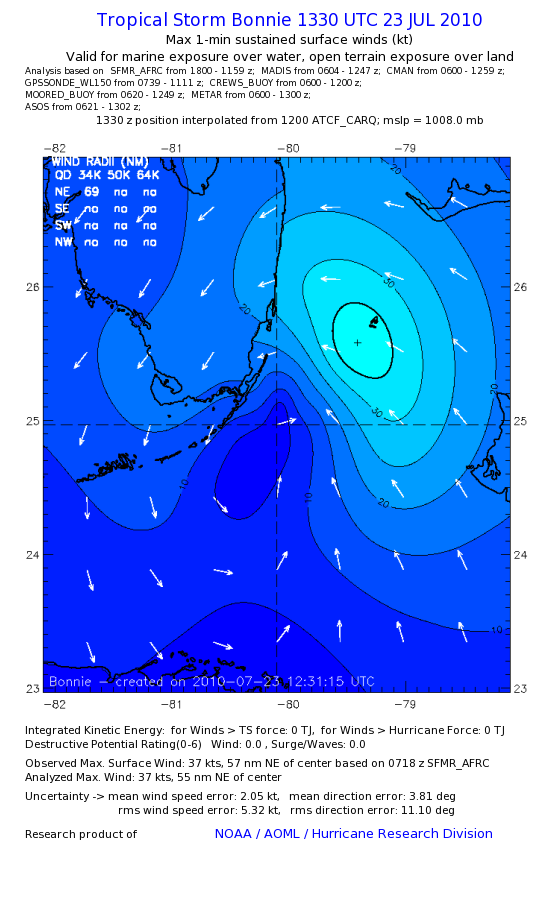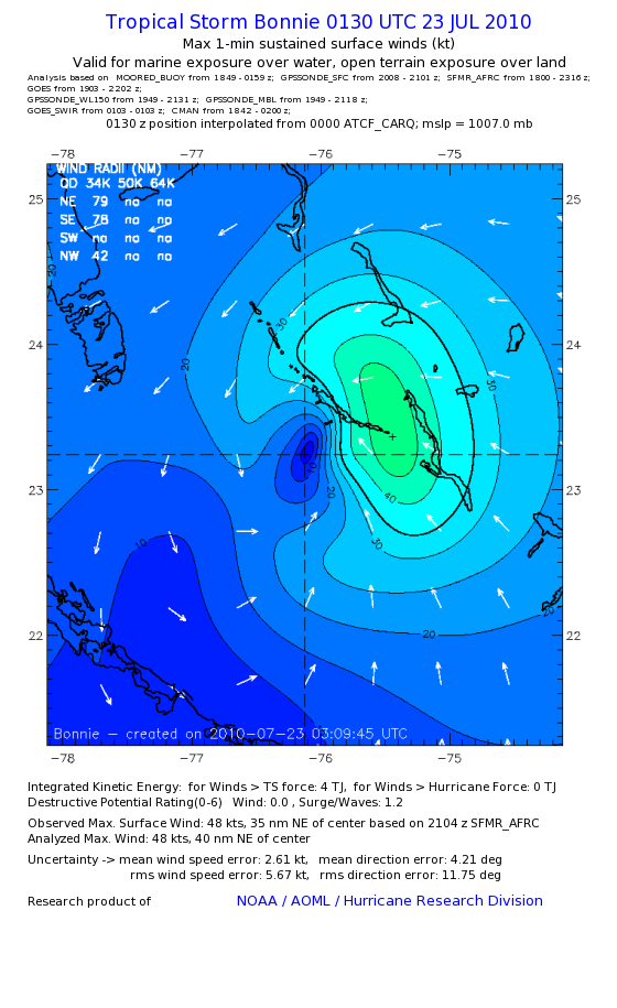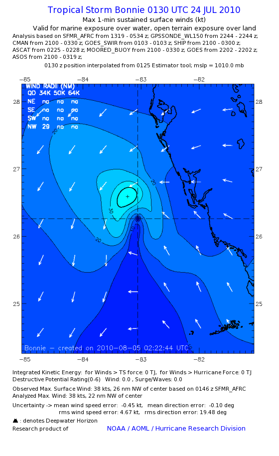 | The following maximum sustained wind swaths for Bonnie are preliminary results and will be subject to further modifications as new data become available. | |||||||||||