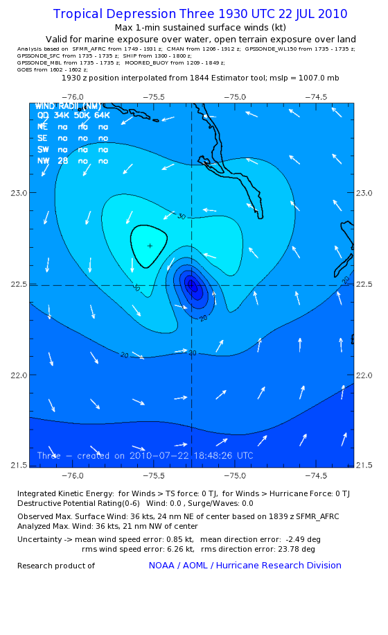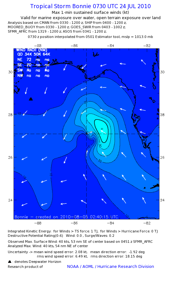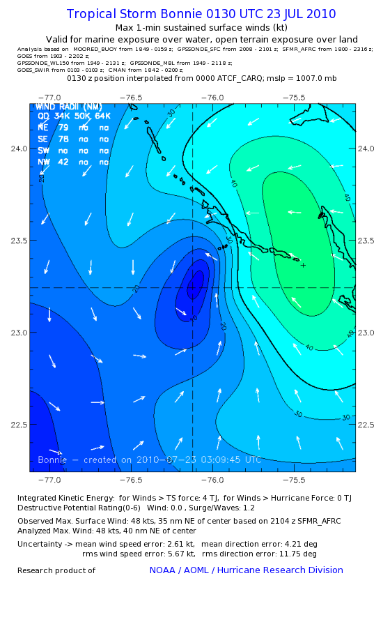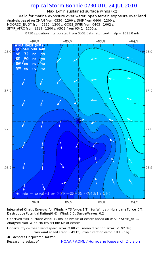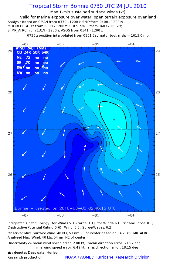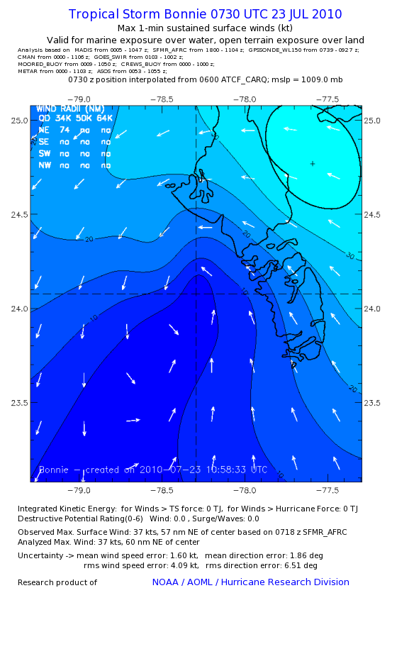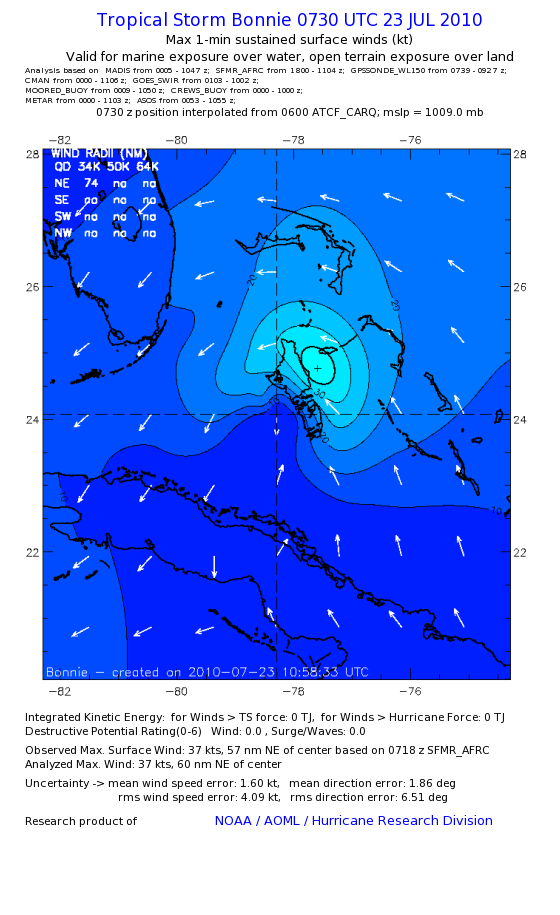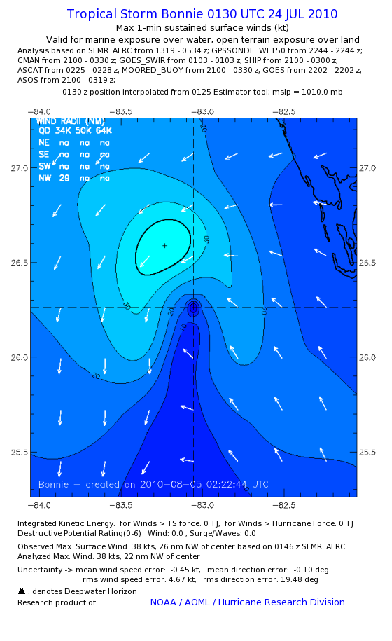 | The following maximum sustained wind swaths for Bonnie are preliminary results and will be subject to further modifications as new data become available. | |||||||||||
