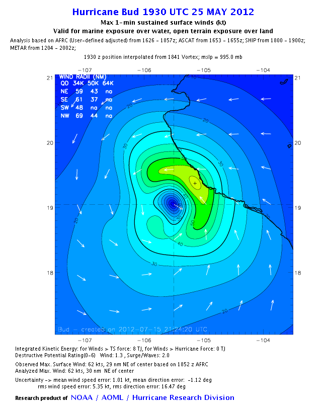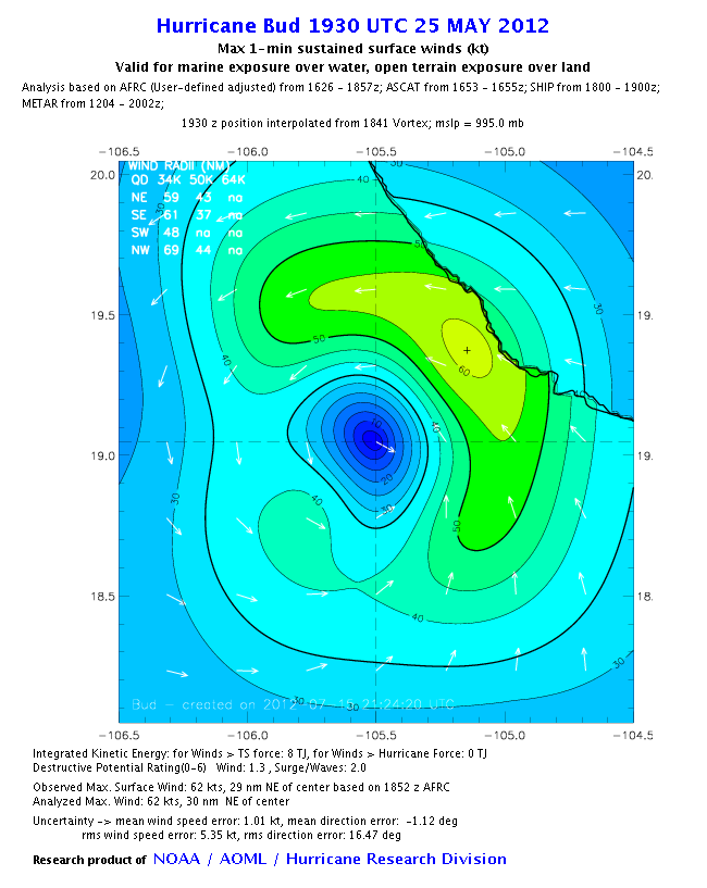 As a public service we are hosting the legacy H*wind archive that was formerly available through NOAA. Most of the archive was conducted in real-time so data collected after the analysis time were not available. Methods used to conduct the analyses evolved over the years. Grid spacing is on the order of 6 km and maximum domain size varies but is typically 8 x 8 degrees. There are known errors in some of the data coverage, mapping, and gridded products. For more information on the archive please go here. For realtime and post storm analysis of the 2014 season and a revised historical archive go here.