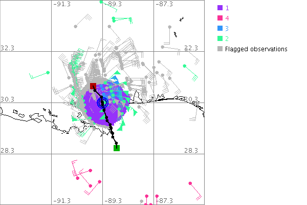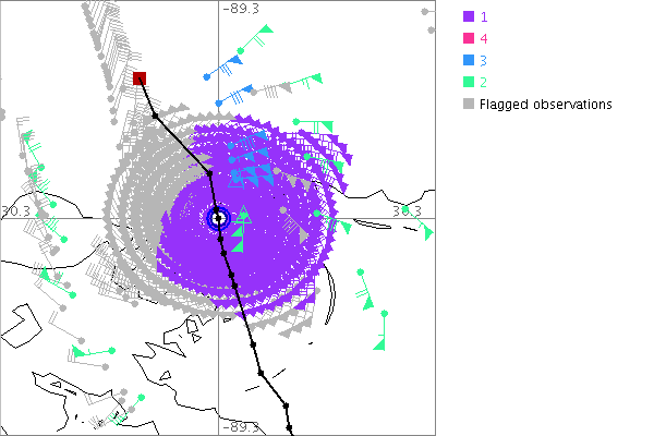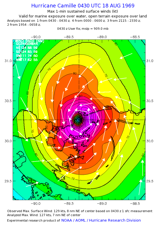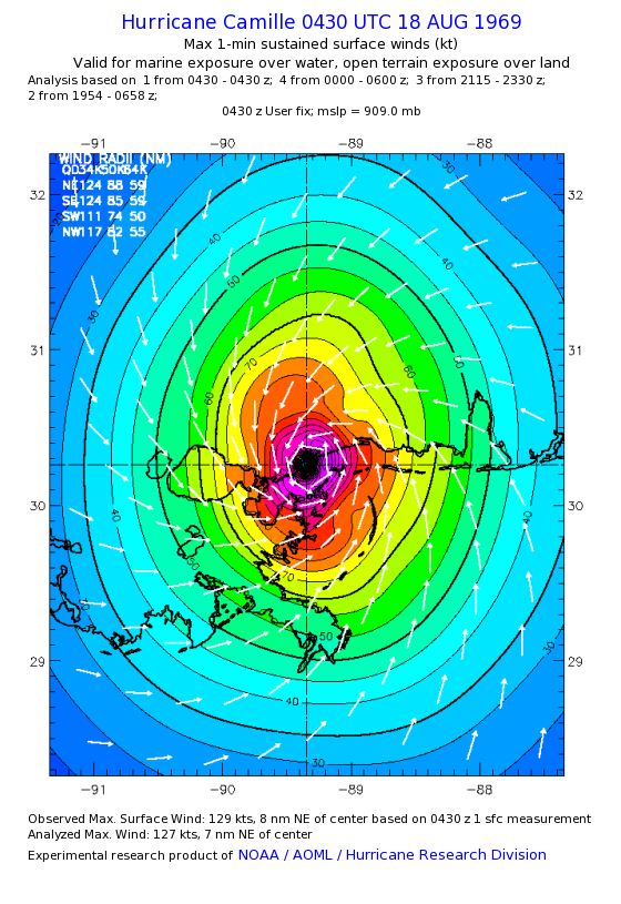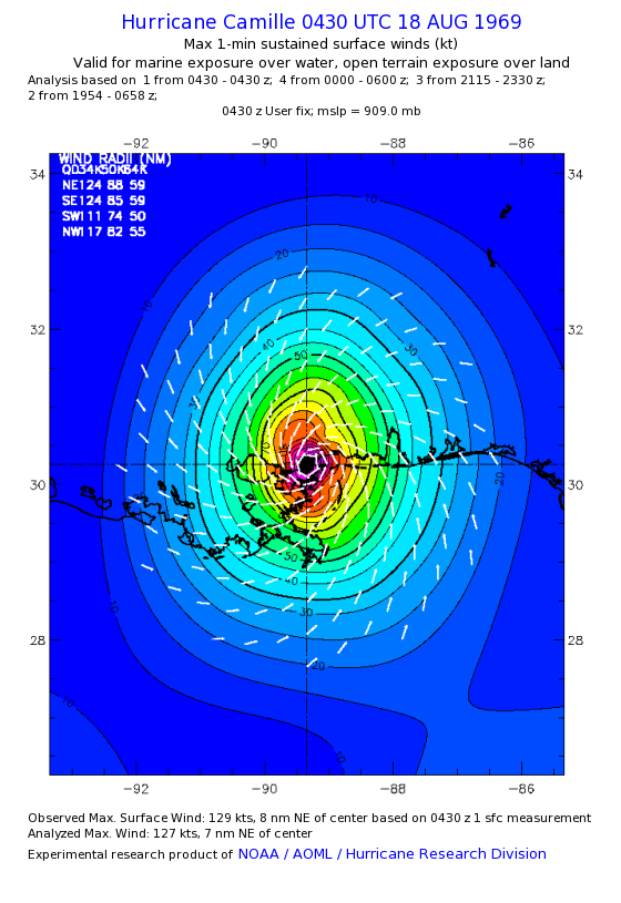 As a public service we are hosting the legacy H*wind archive that was formerly available through NOAA. Most of the archive was conducted in real-time so data collected after the analysis time were not available. Methods used to conduct the analyses evolved over the years. Grid spacing is on the order of 6 km and maximum domain size varies but is typically 8 x 8 degrees. There are known errors in some of the data coverage, mapping, and gridded products. For more information on the archive please go here. For realtime and post storm analysis of the 2014 season and a revised historical archive go here.