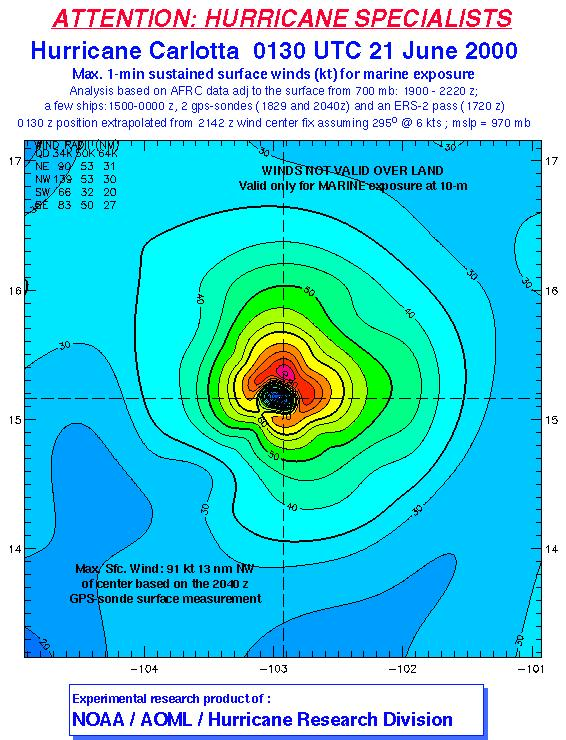 As a public service we are hosting the legacy H*wind archive that was formerly available through NOAA. Most of the archive was conducted in real-time so data collected after the analysis time were not available. Methods used to conduct the analyses evolved over the years. Grid spacing is on the order of 6 km and maximum domain size varies but is typically 8 x 8 degrees. There are known errors in some of the data coverage, mapping, and gridded products. For more information on the archive please go here. For realtime and post storm analysis of the 2014 season and a revised historical archive go here.
