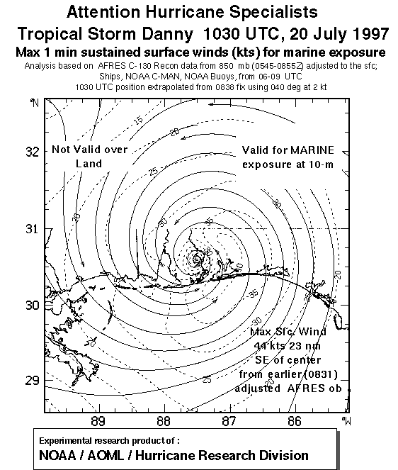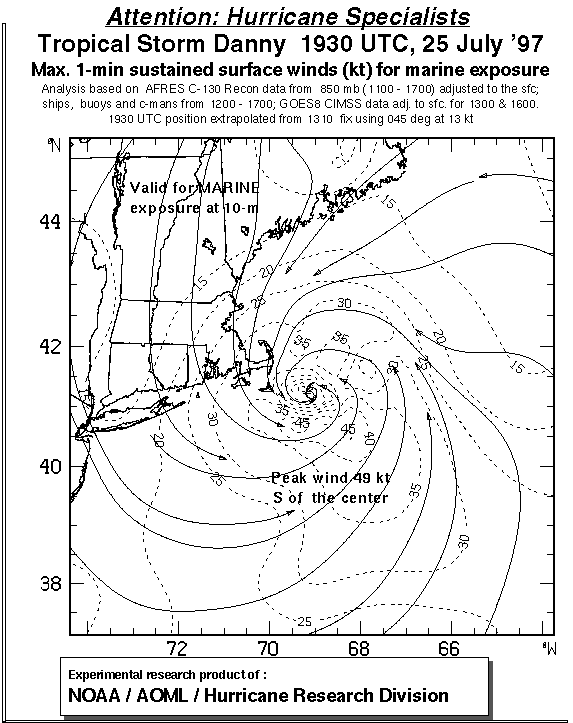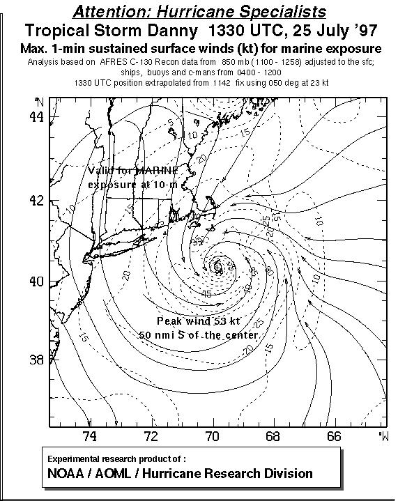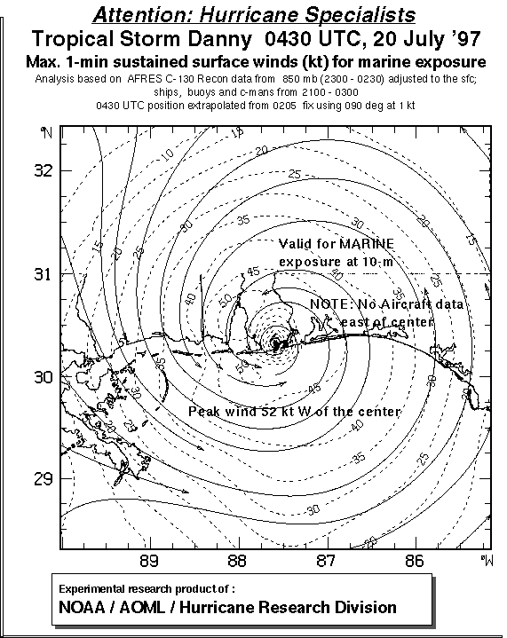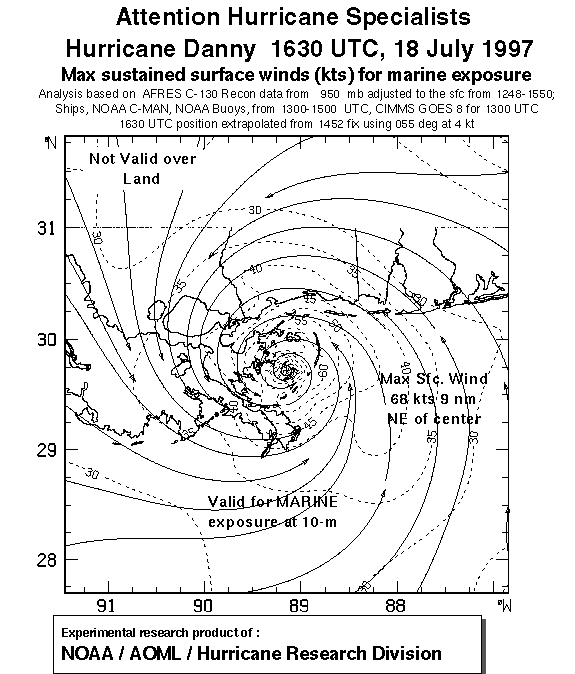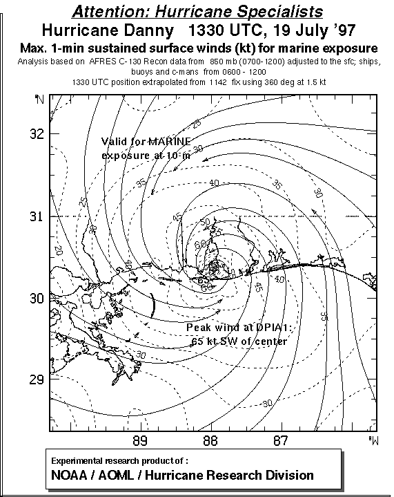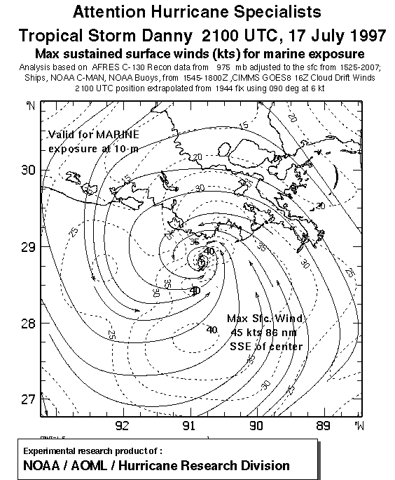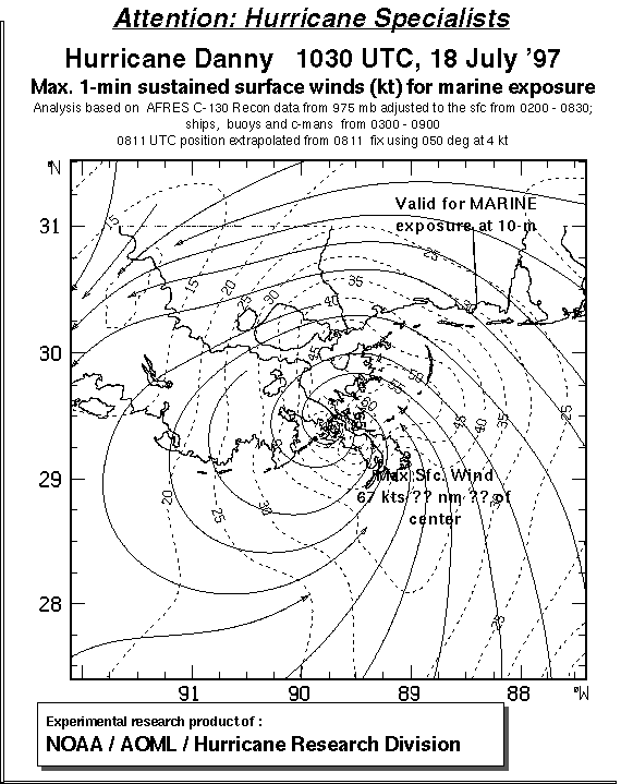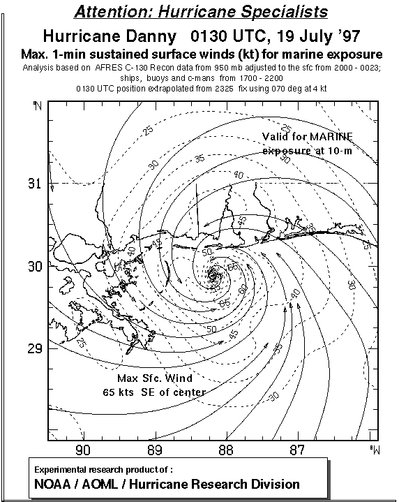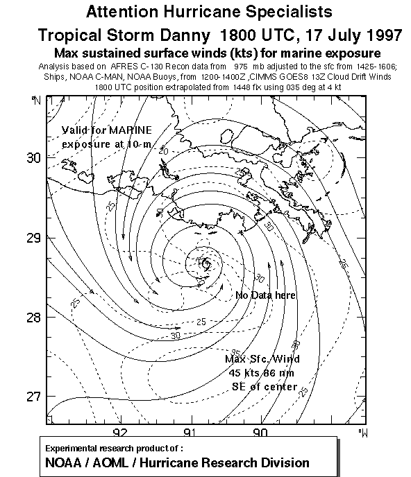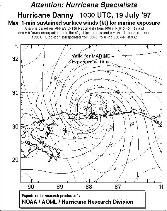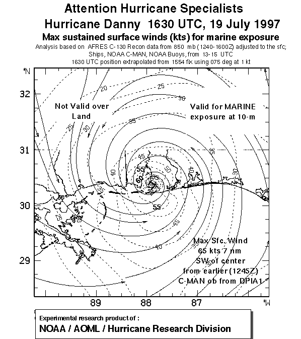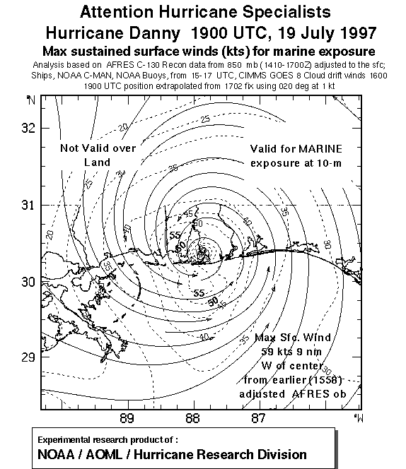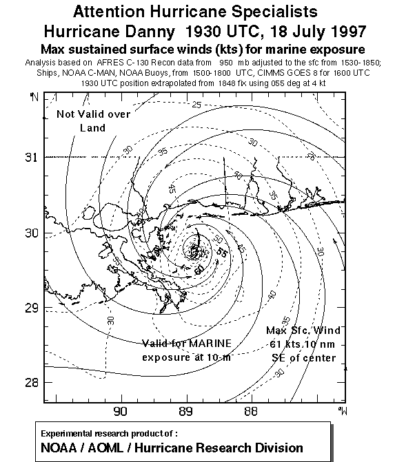 As a public service we are hosting the legacy H*wind archive that was formerly available through NOAA. Most of the archive was conducted in real-time so data collected after the analysis time were not available. Methods used to conduct the analyses evolved over the years. Grid spacing is on the order of 6 km and maximum domain size varies but is typically 8 x 8 degrees. There are known errors in some of the data coverage, mapping, and gridded products. For more information on the archive please go here. For realtime and post storm analysis of the 2014 season and a revised historical archive go here.
