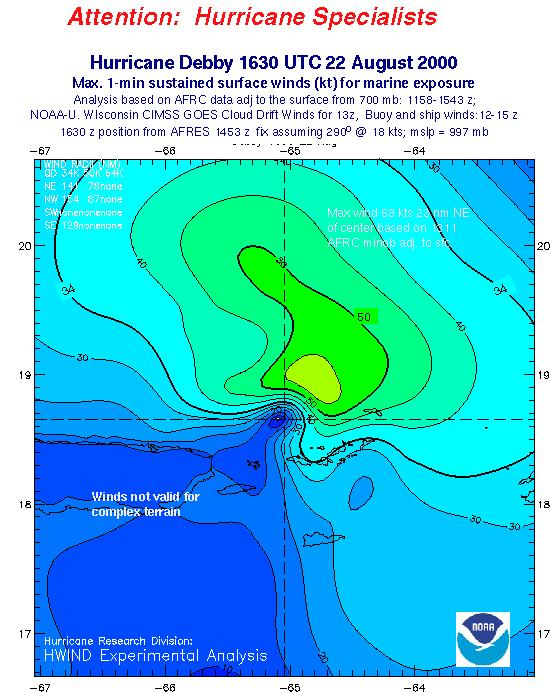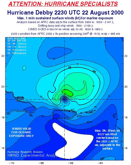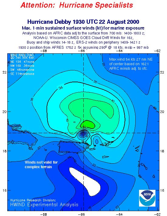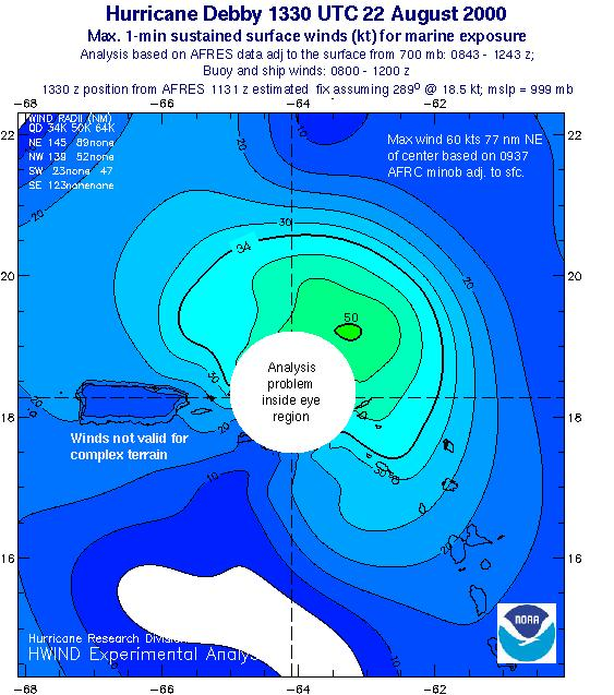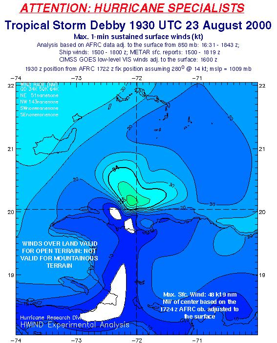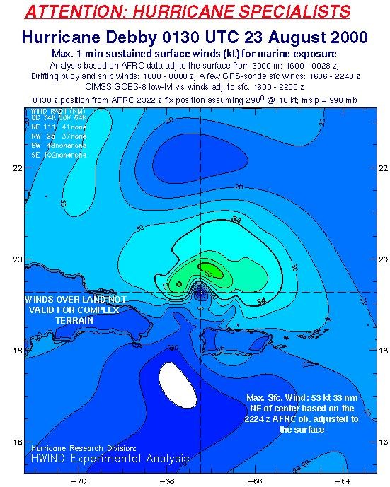 As a public service we are hosting the legacy H*wind archive that was formerly available through NOAA. Most of the archive was conducted in real-time so data collected after the analysis time were not available. Methods used to conduct the analyses evolved over the years. Grid spacing is on the order of 6 km and maximum domain size varies but is typically 8 x 8 degrees. There are known errors in some of the data coverage, mapping, and gridded products. For more information on the archive please go here. For realtime and post storm analysis of the 2014 season and a revised historical archive go here.