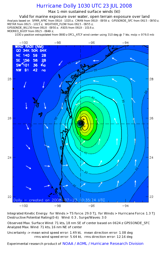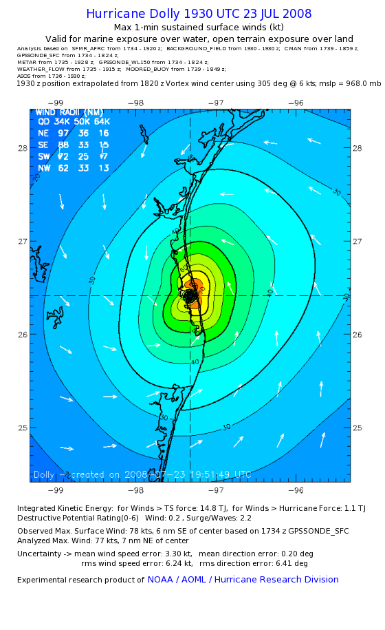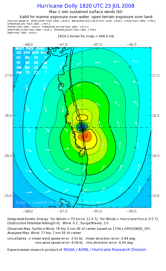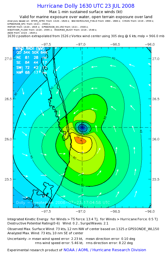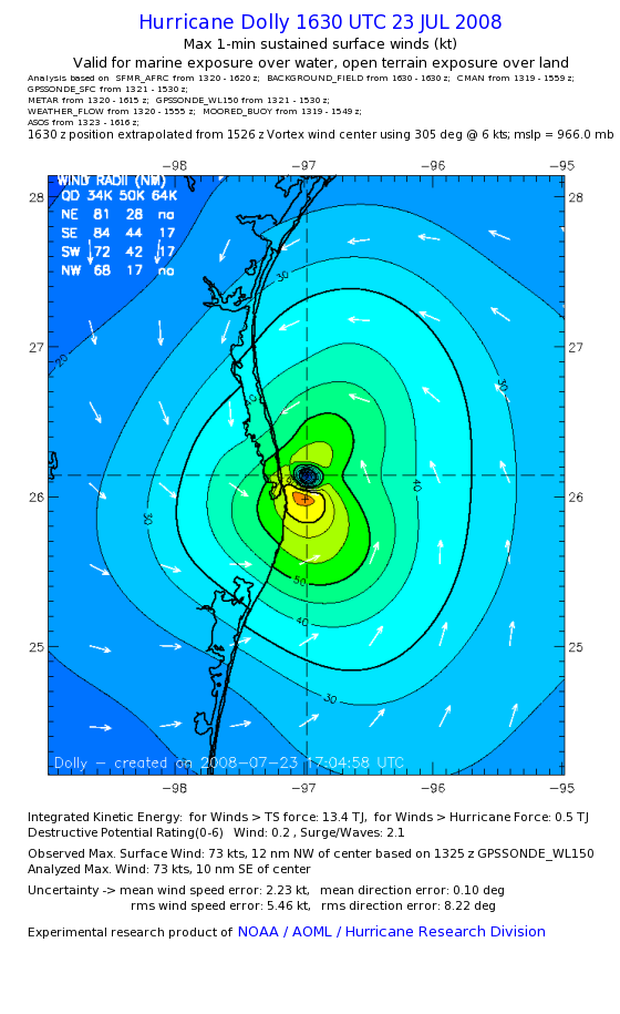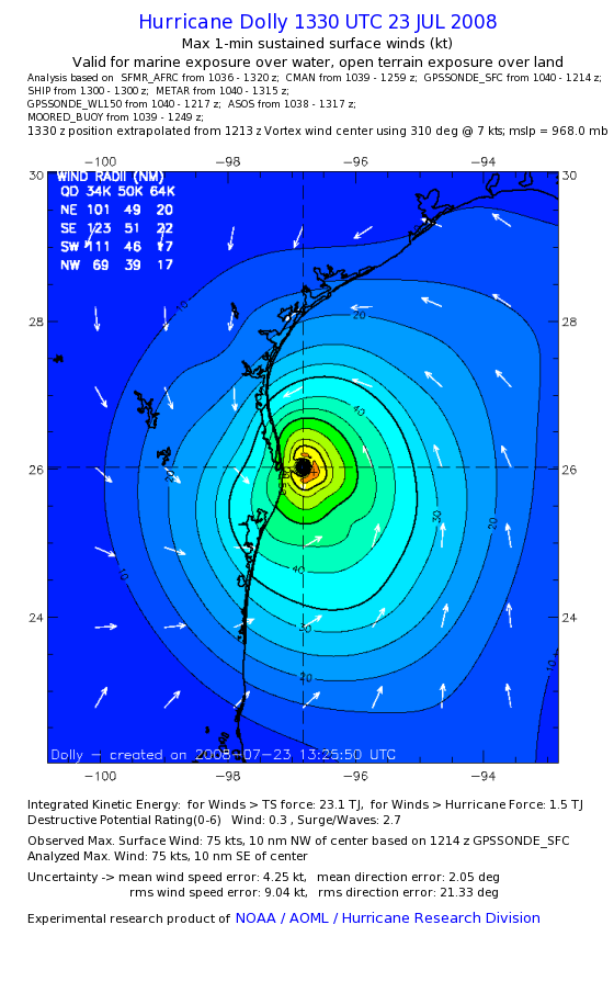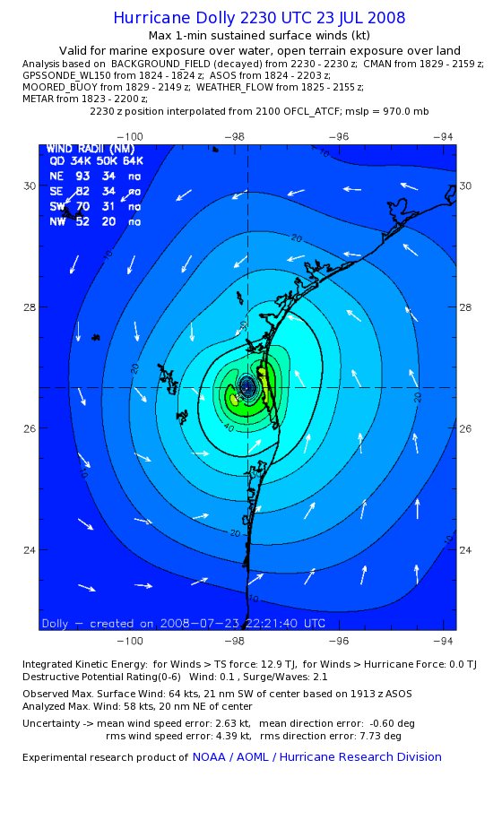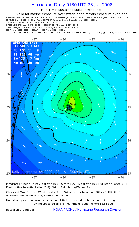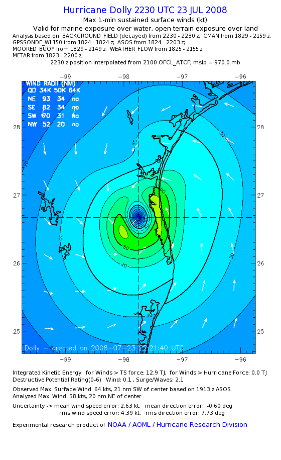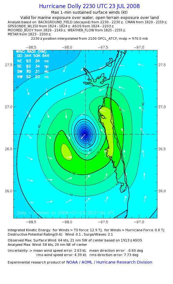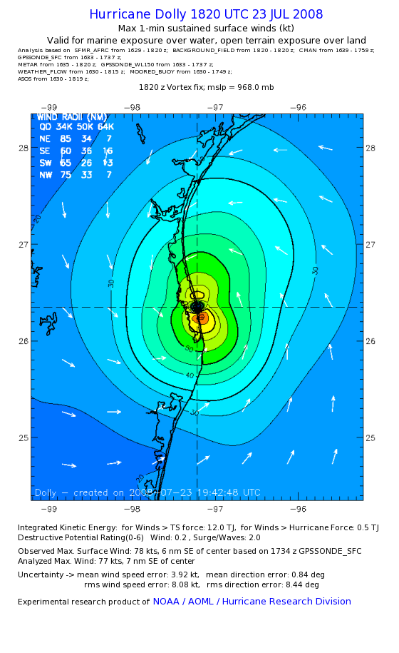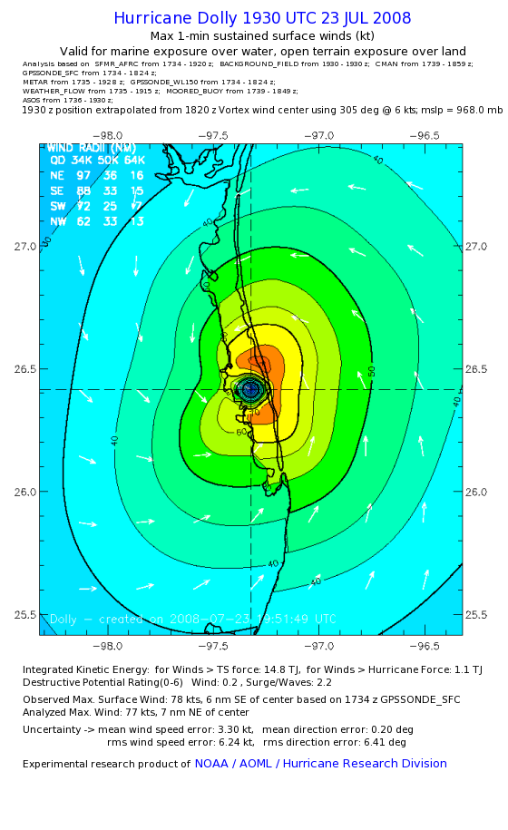 | The following maximum sustained wind swaths for Dolly are preliminary results and will be subject to further modifications as new data become available. | |||||||||||