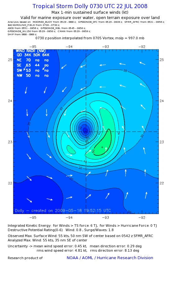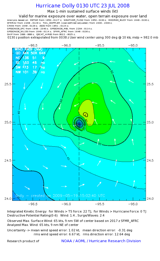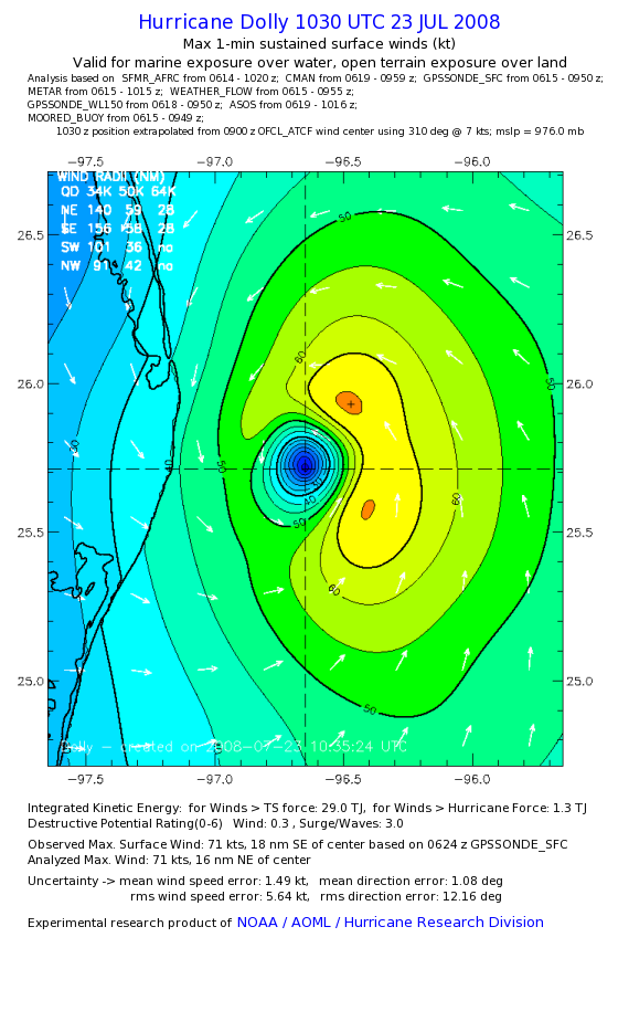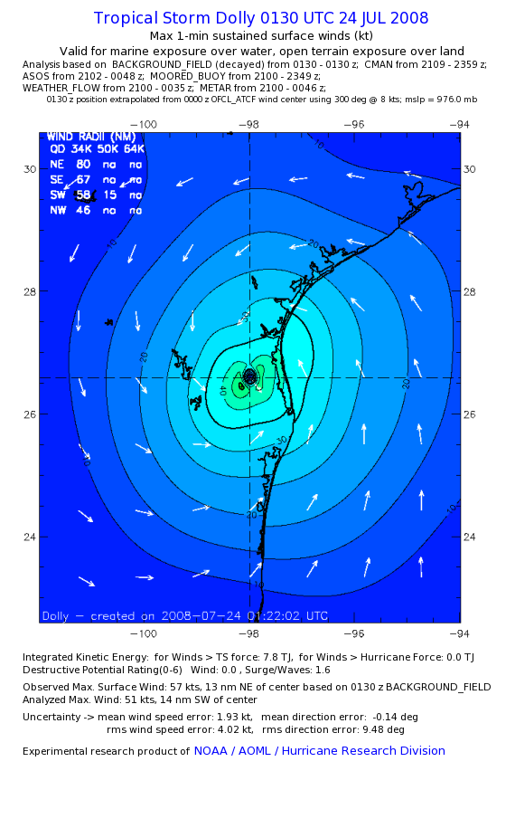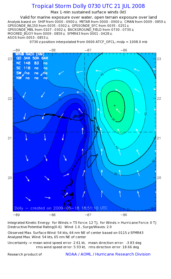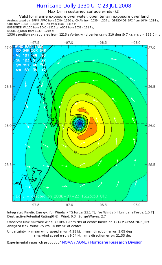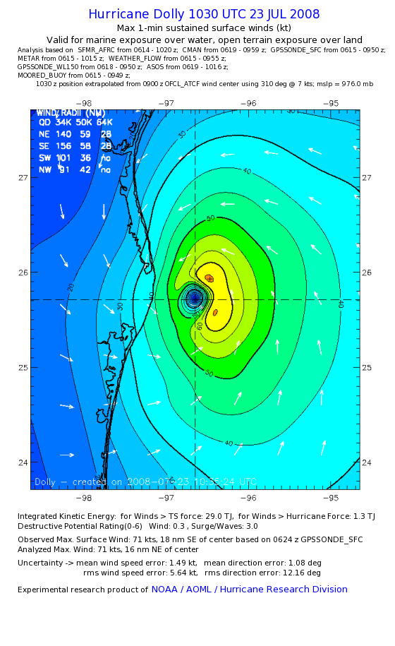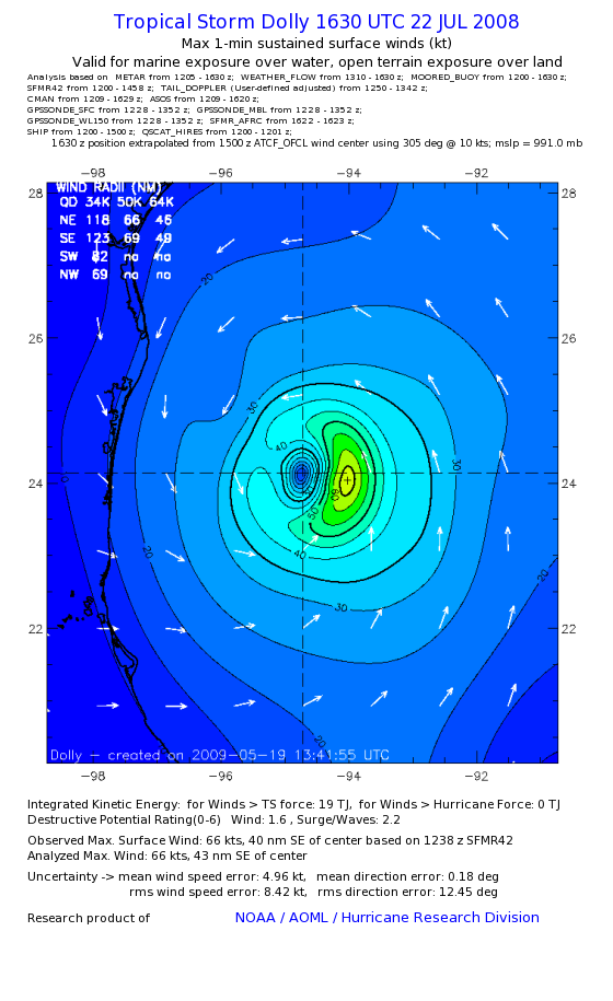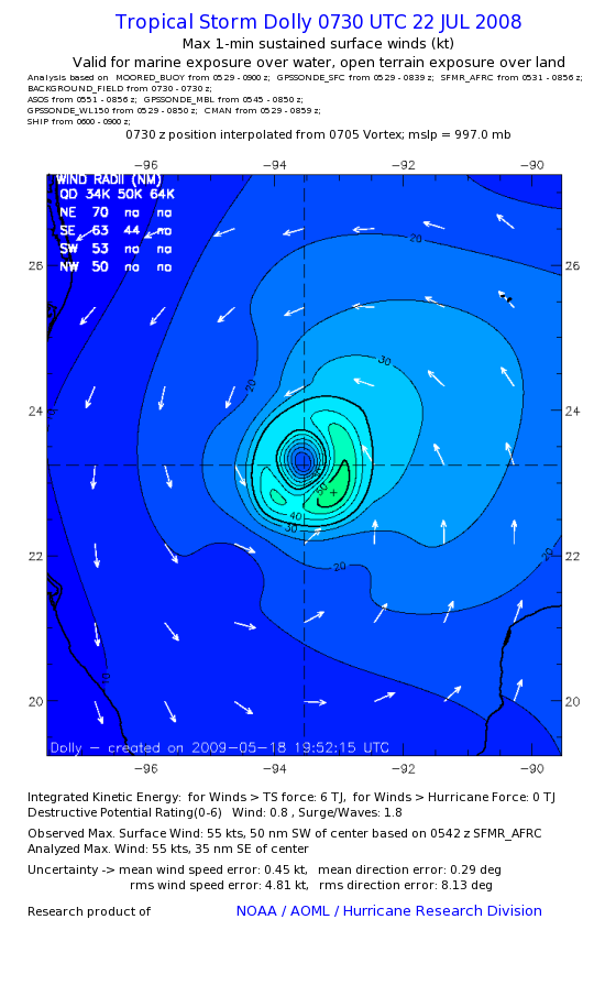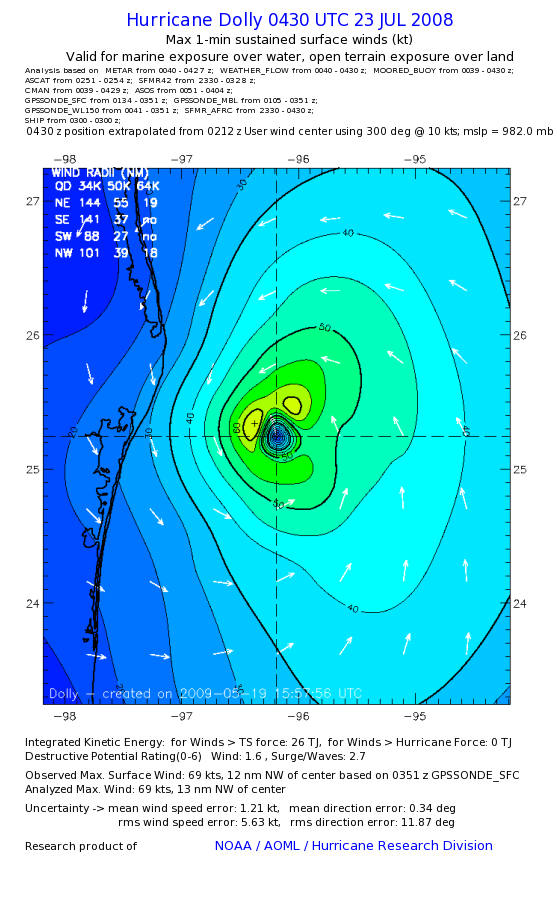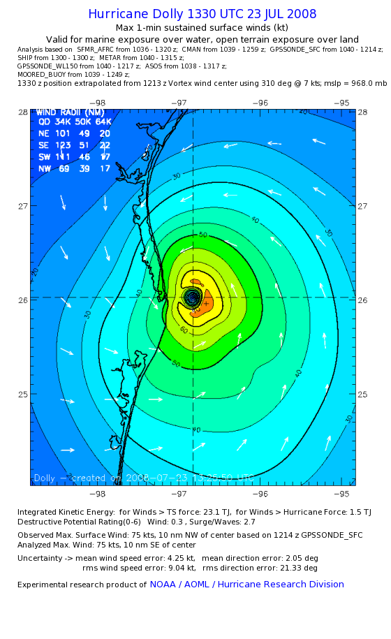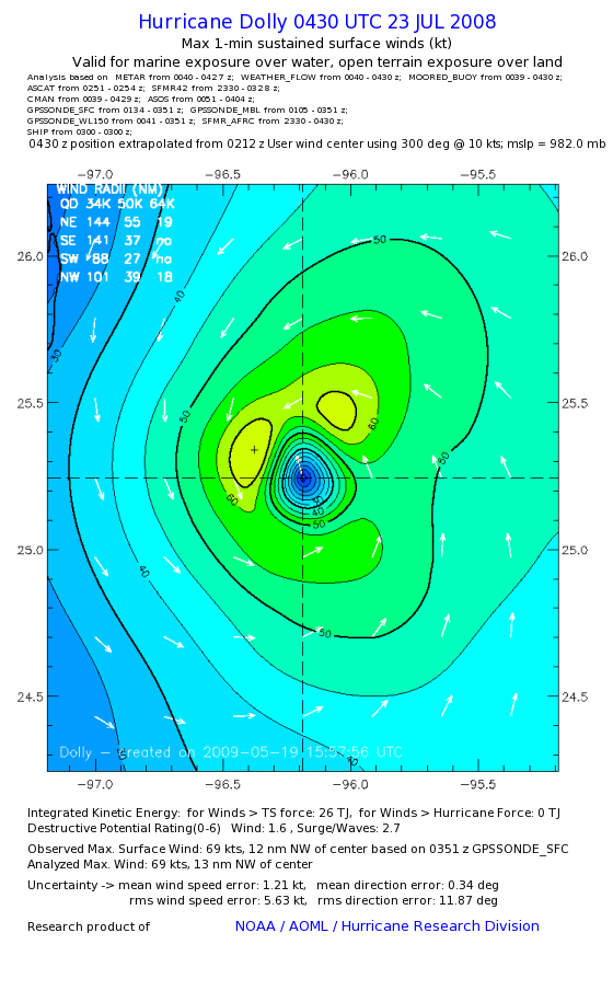 | The following maximum sustained wind swaths for Dolly are preliminary results and will be subject to further modifications as new data become available. | |||||||||||