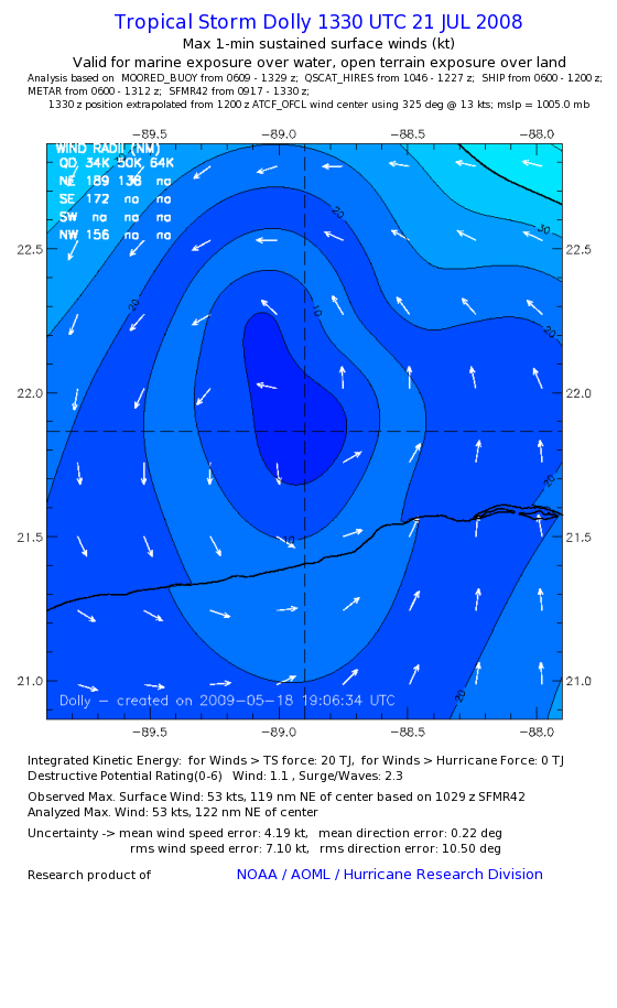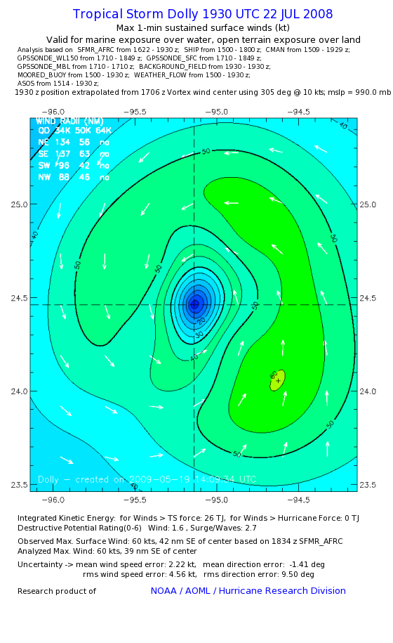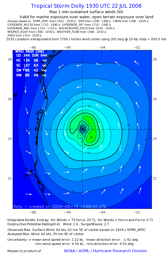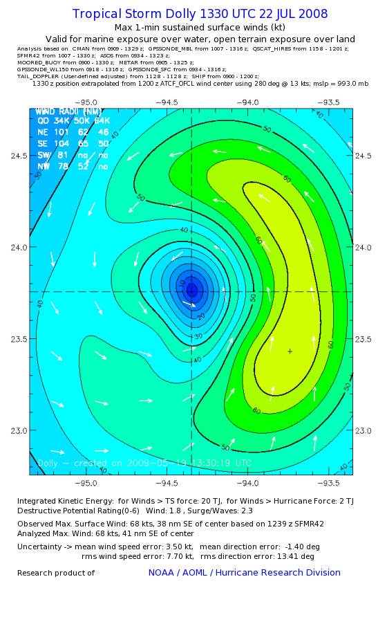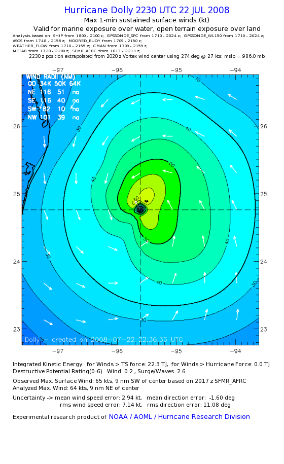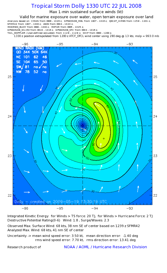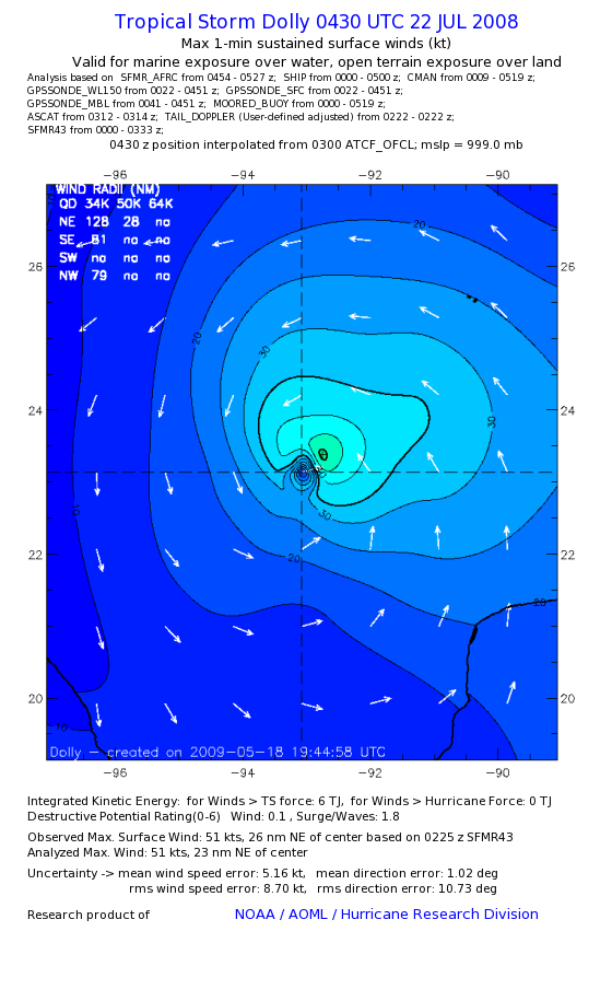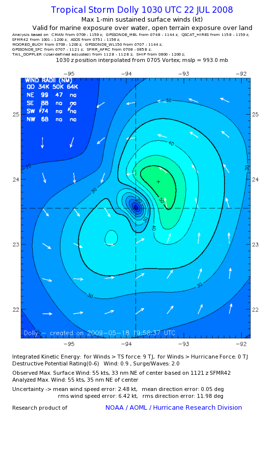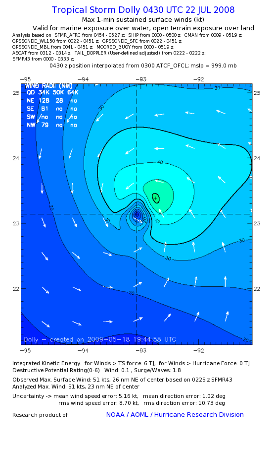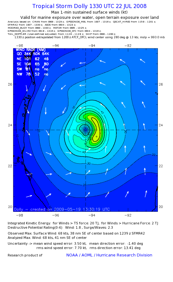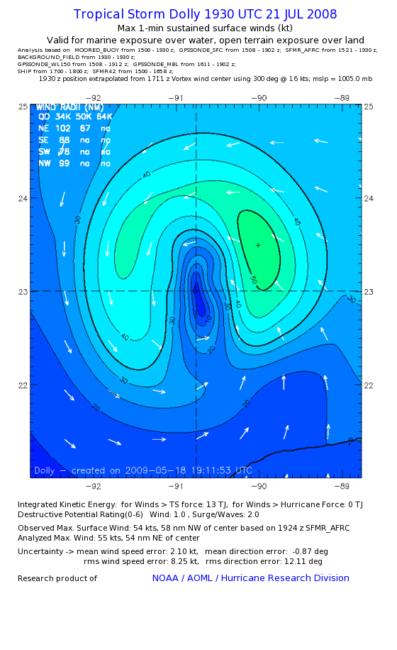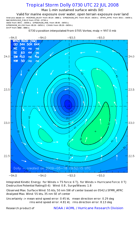 | The following maximum sustained wind swaths for Dolly are preliminary results and will be subject to further modifications as new data become available. | |||||||||||