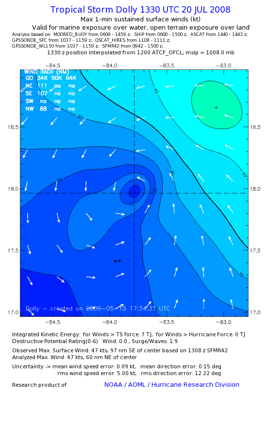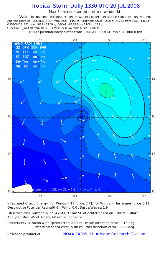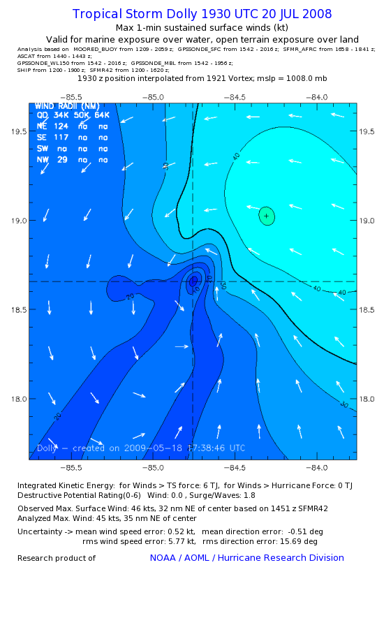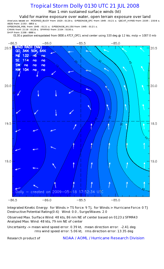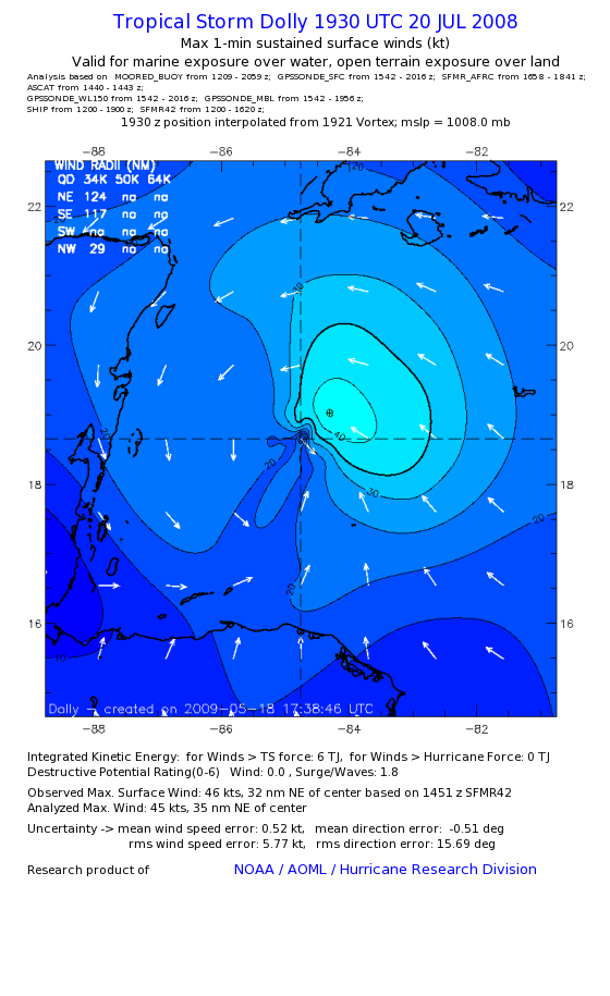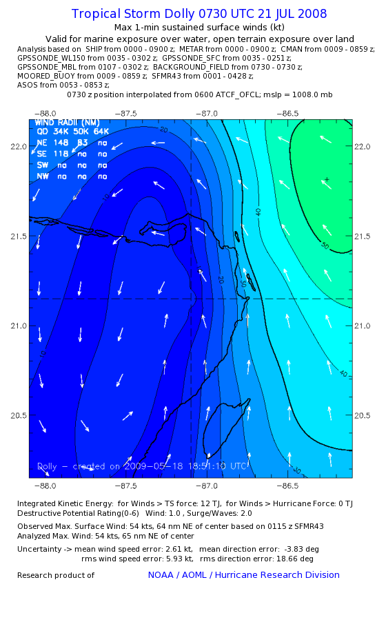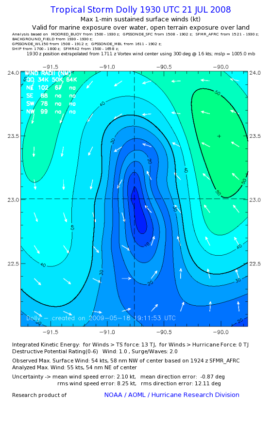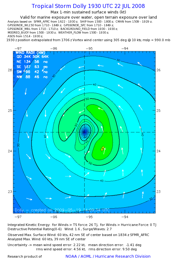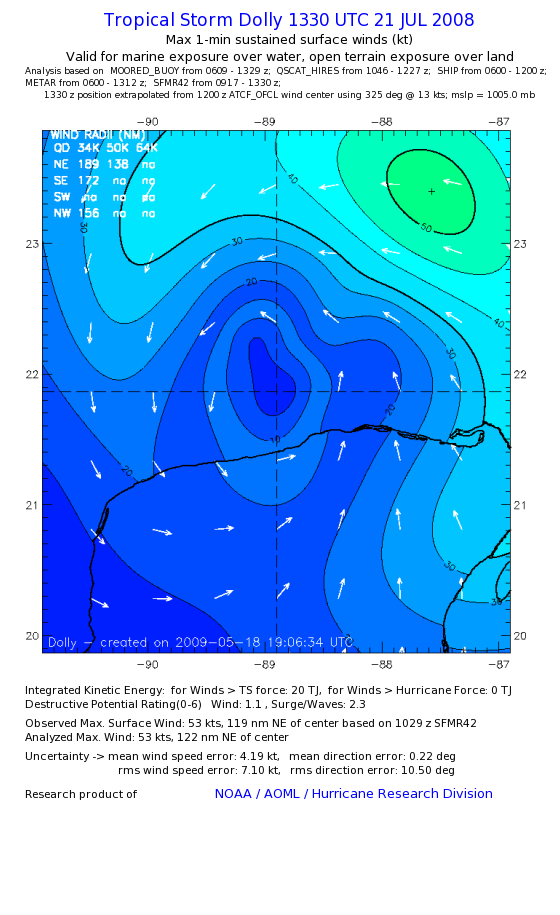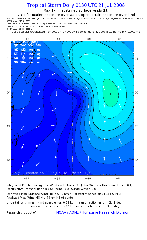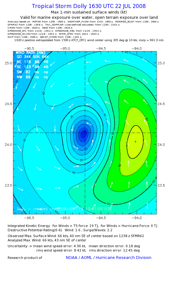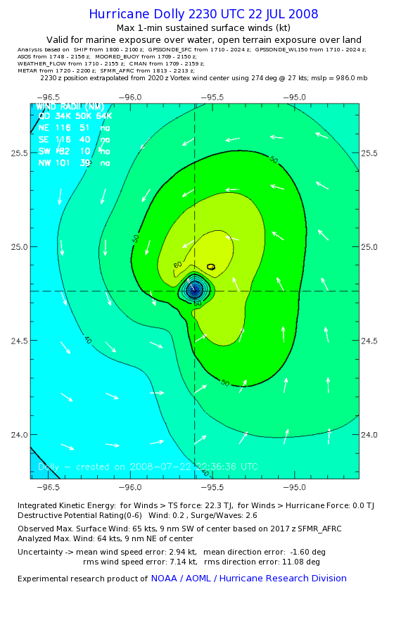| The following maximum sustained wind swaths for Dolly are preliminary results and will be subject to further modifications as new data become available. | |||||||||||