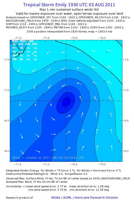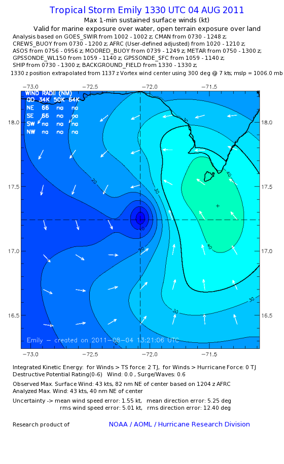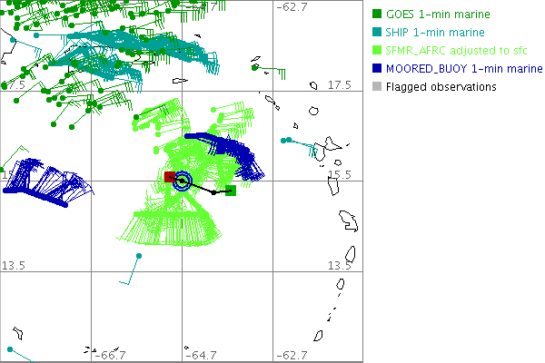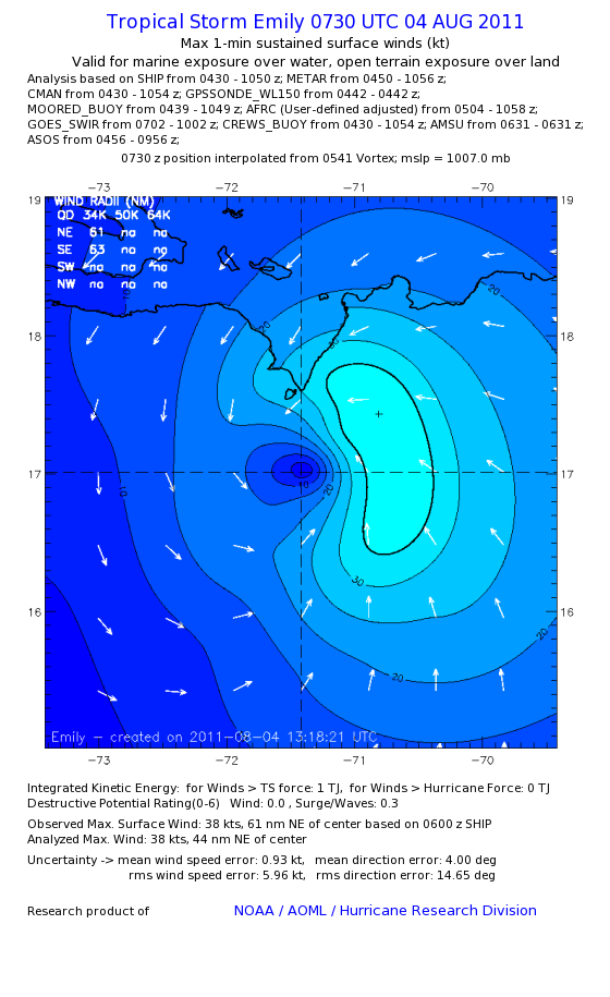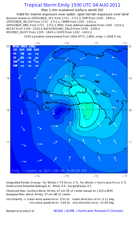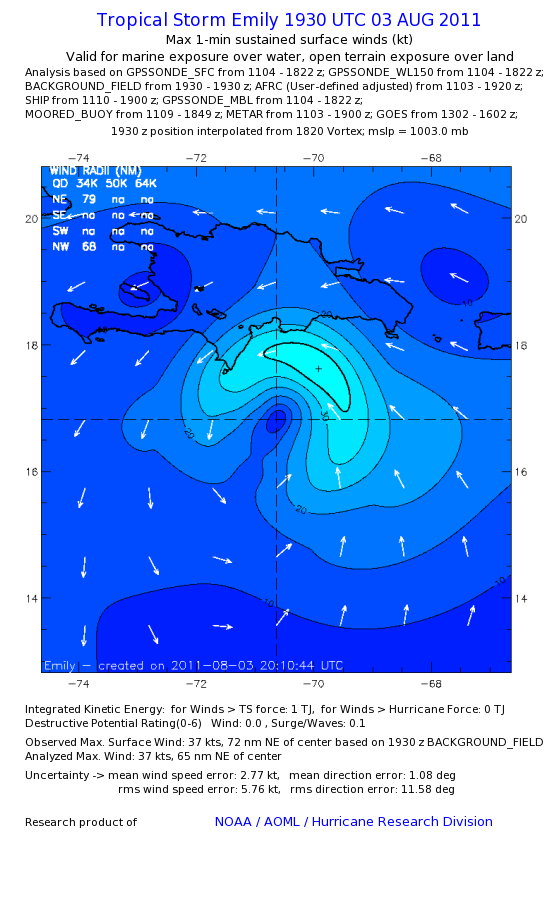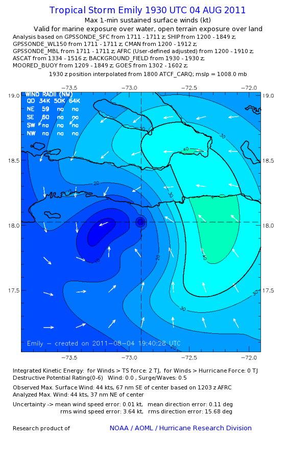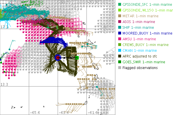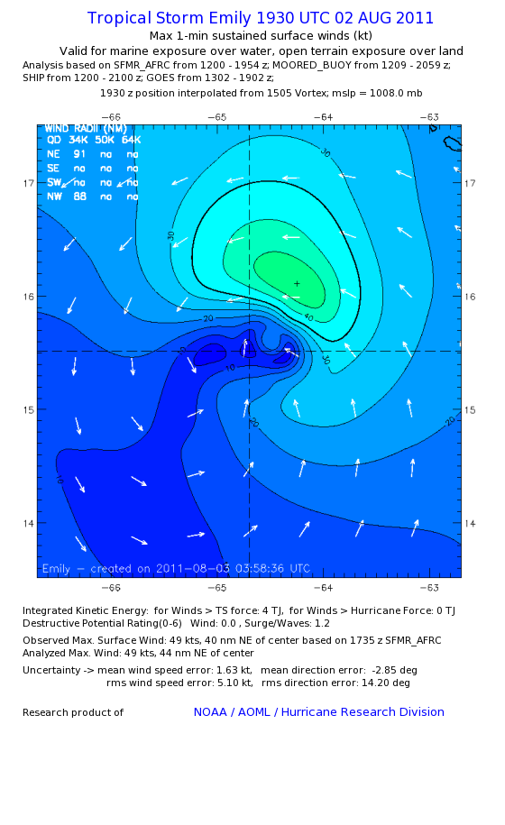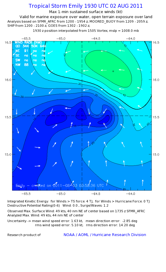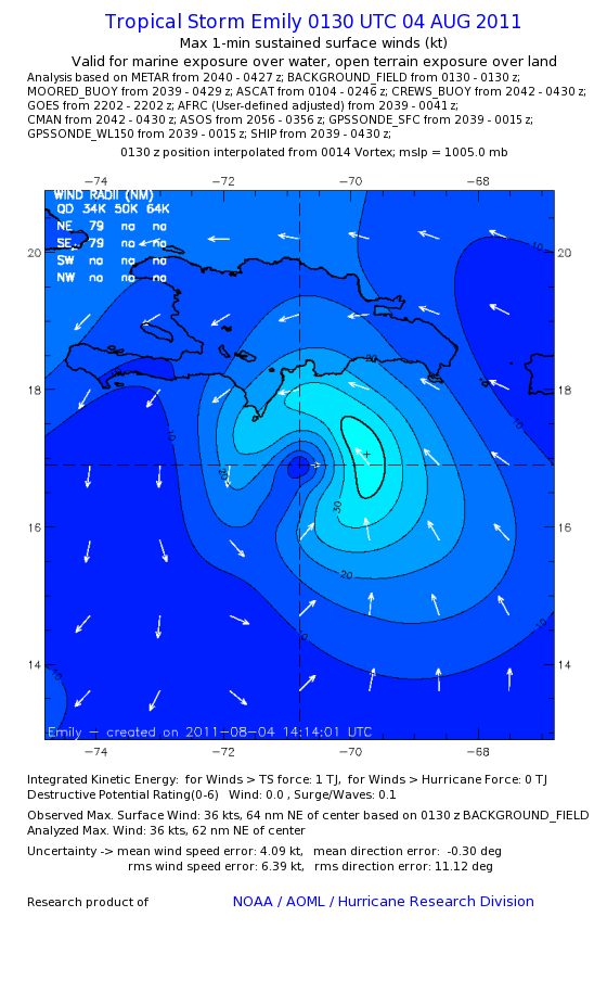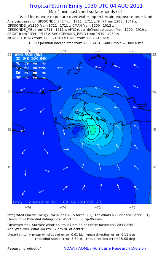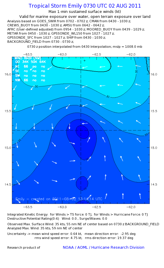 As a public service we are hosting the legacy H*wind archive that was formerly available through NOAA. Most of the archive was conducted in real-time so data collected after the analysis time were not available. Methods used to conduct the analyses evolved over the years. Grid spacing is on the order of 6 km and maximum domain size varies but is typically 8 x 8 degrees. There are known errors in some of the data coverage, mapping, and gridded products. For more information on the archive please go here. For realtime and post storm analysis of the 2014 season and a revised historical archive go here.