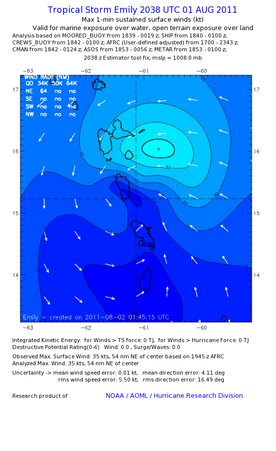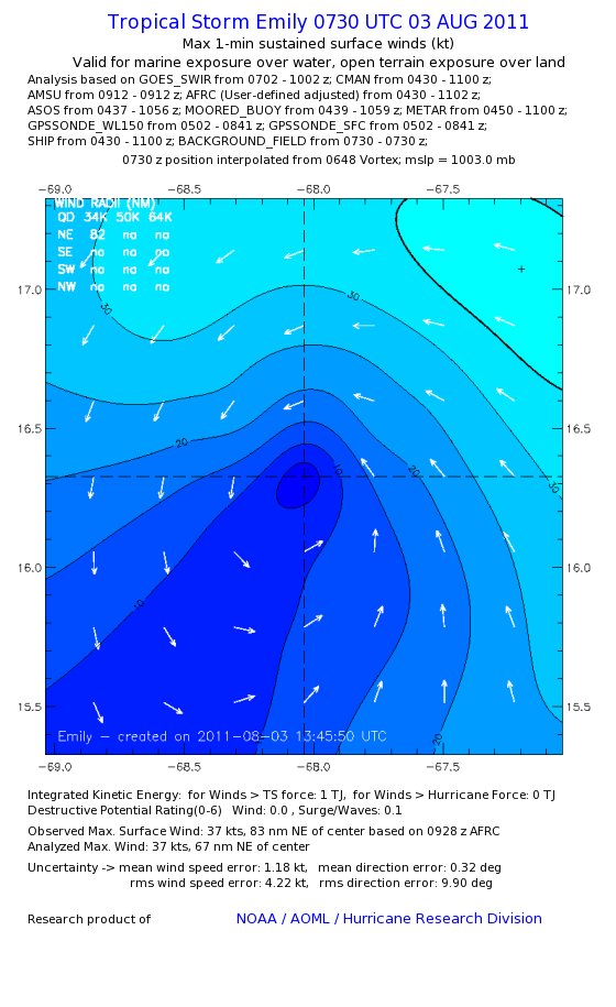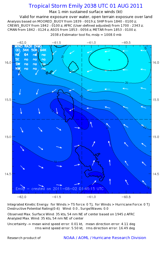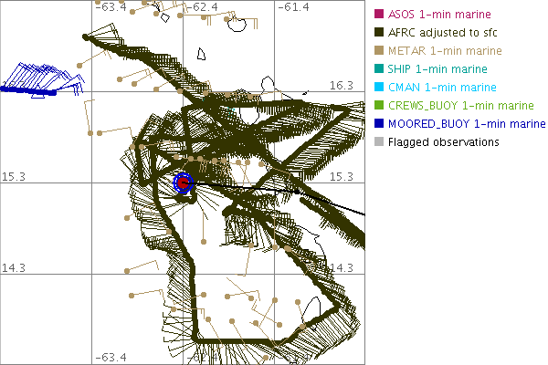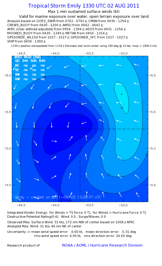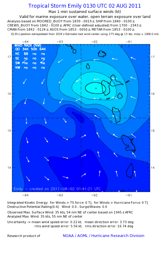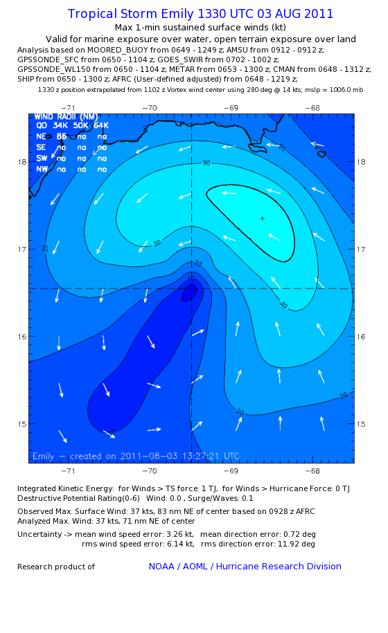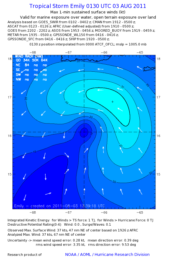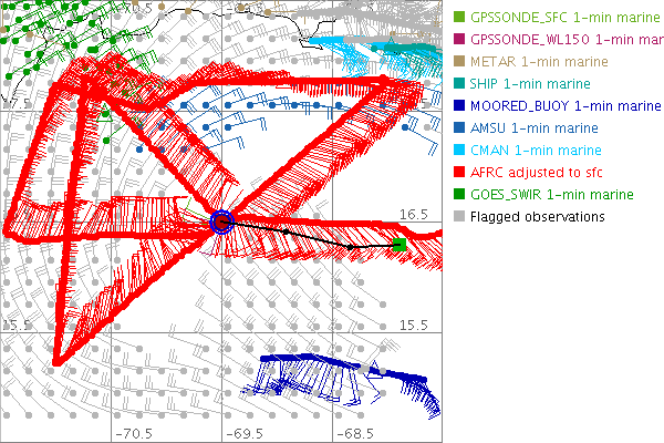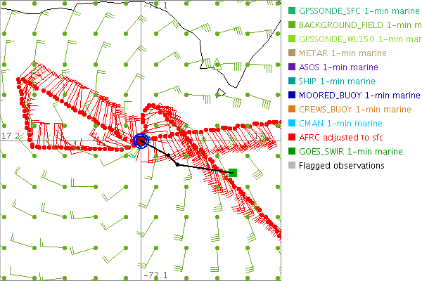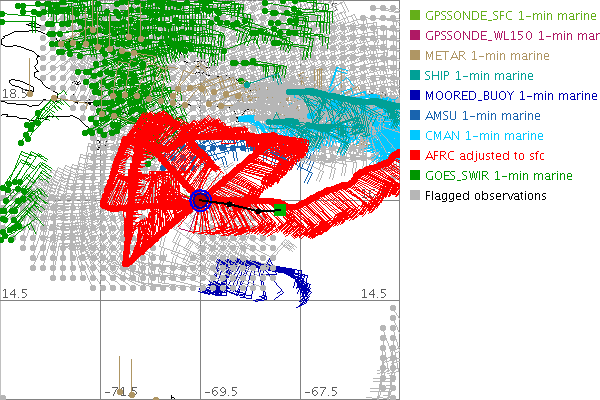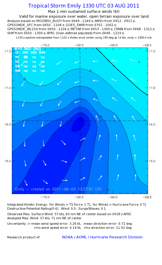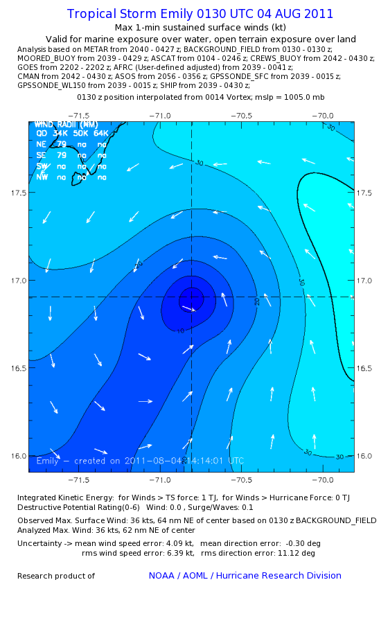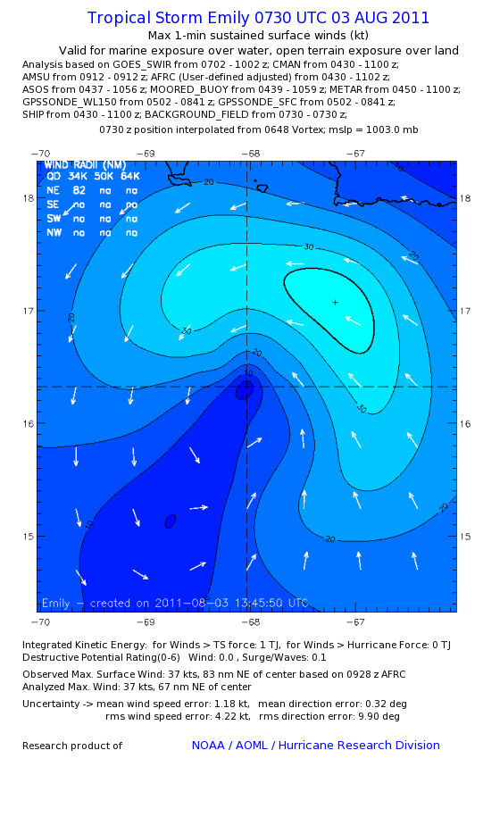 As a public service we are hosting the legacy H*wind archive that was formerly available through NOAA. Most of the archive was conducted in real-time so data collected after the analysis time were not available. Methods used to conduct the analyses evolved over the years. Grid spacing is on the order of 6 km and maximum domain size varies but is typically 8 x 8 degrees. There are known errors in some of the data coverage, mapping, and gridded products. For more information on the archive please go here. For realtime and post storm analysis of the 2014 season and a revised historical archive go here.
