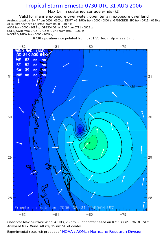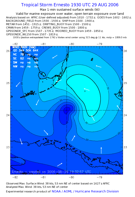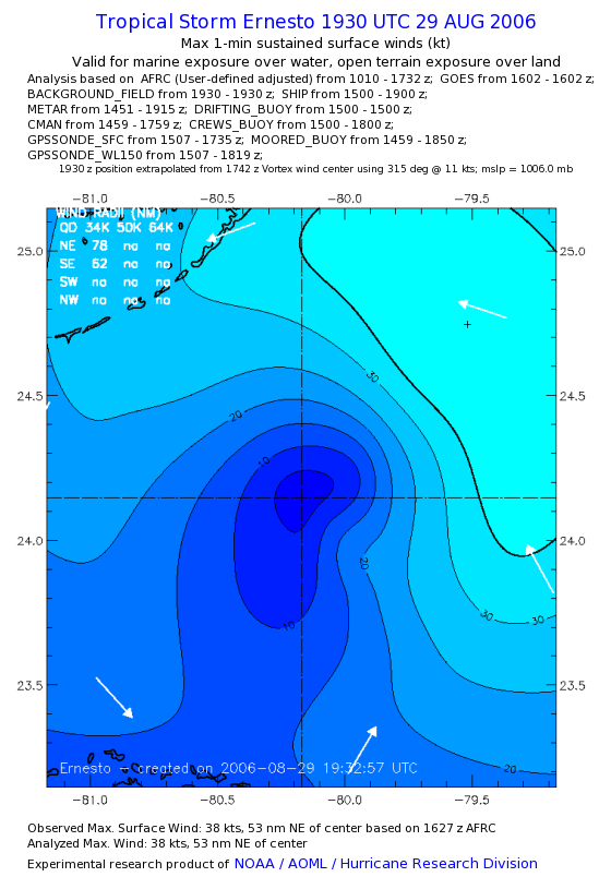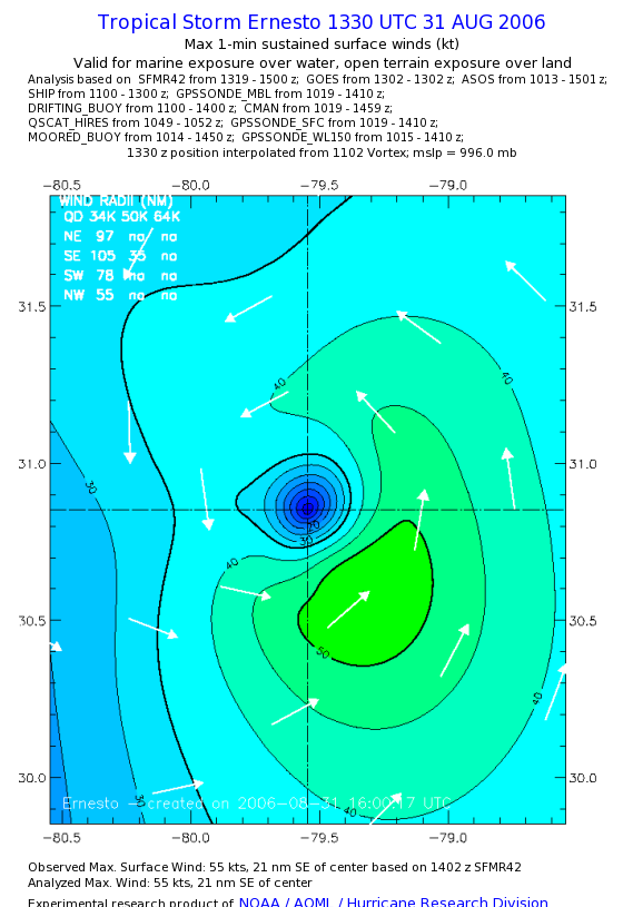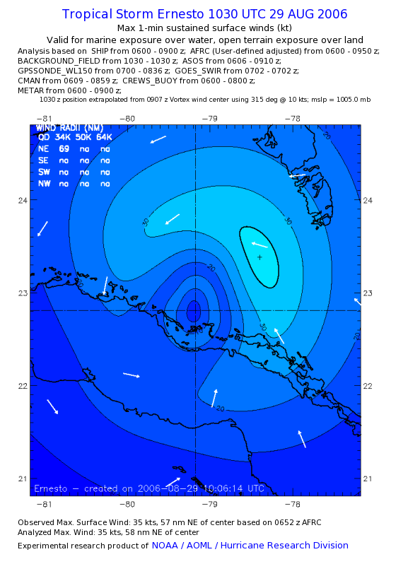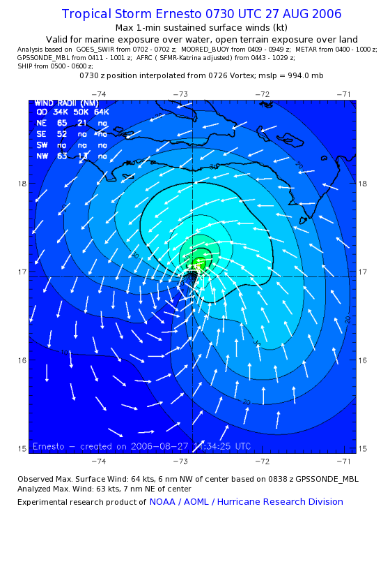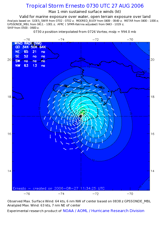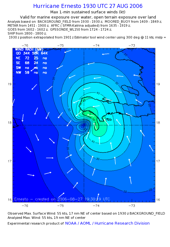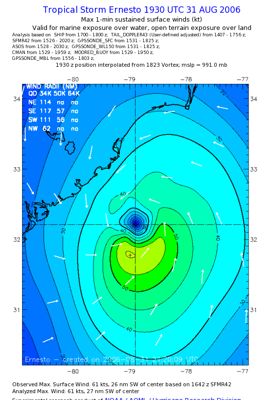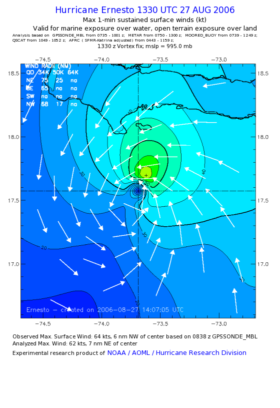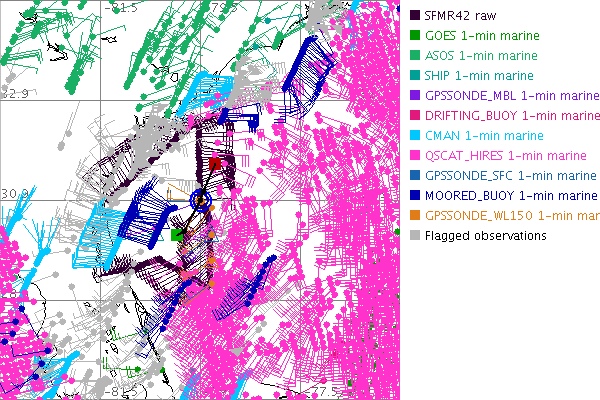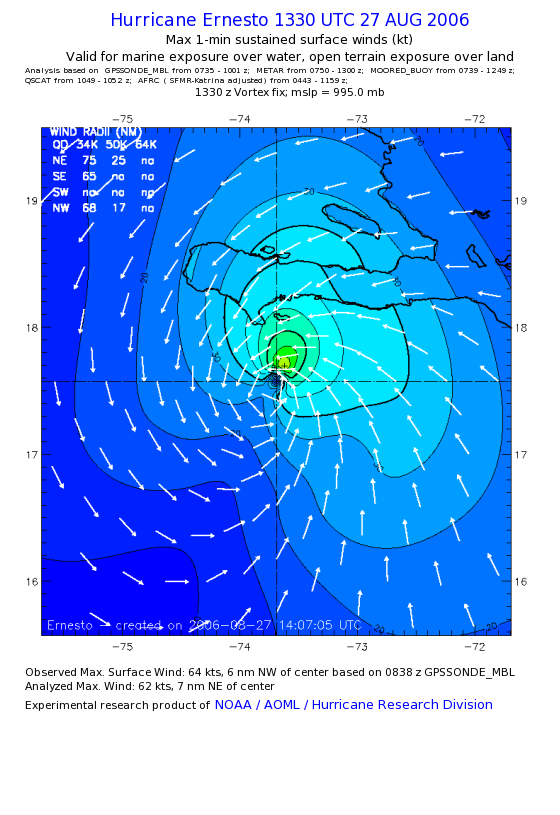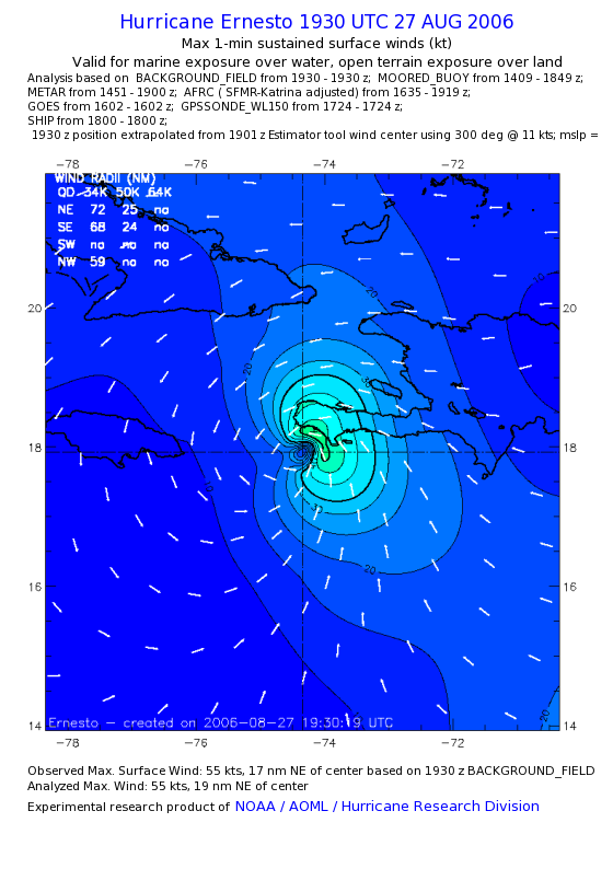 As a public service we are hosting the legacy H*wind archive that was formerly available through NOAA. Most of the archive was conducted in real-time so data collected after the analysis time were not available. Methods used to conduct the analyses evolved over the years. Grid spacing is on the order of 6 km and maximum domain size varies but is typically 8 x 8 degrees. There are known errors in some of the data coverage, mapping, and gridded products. For more information on the archive please go here. For realtime and post storm analysis of the 2014 season and a revised historical archive go here. |
