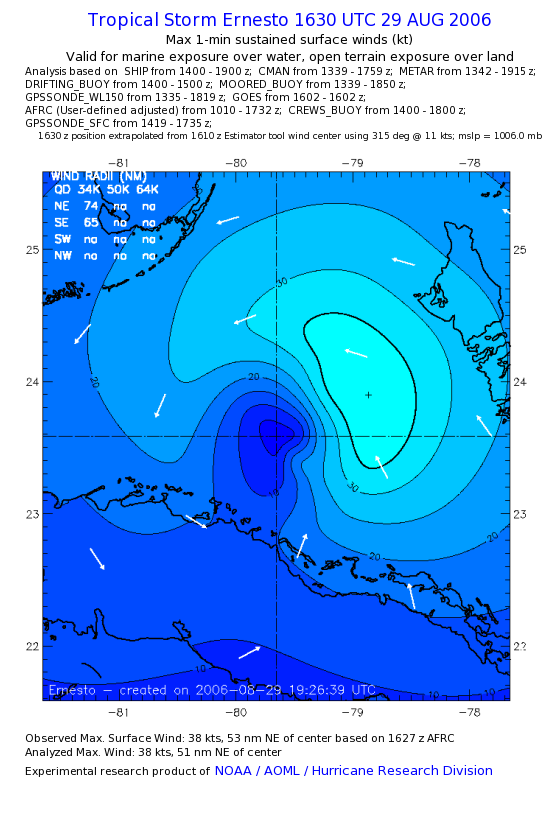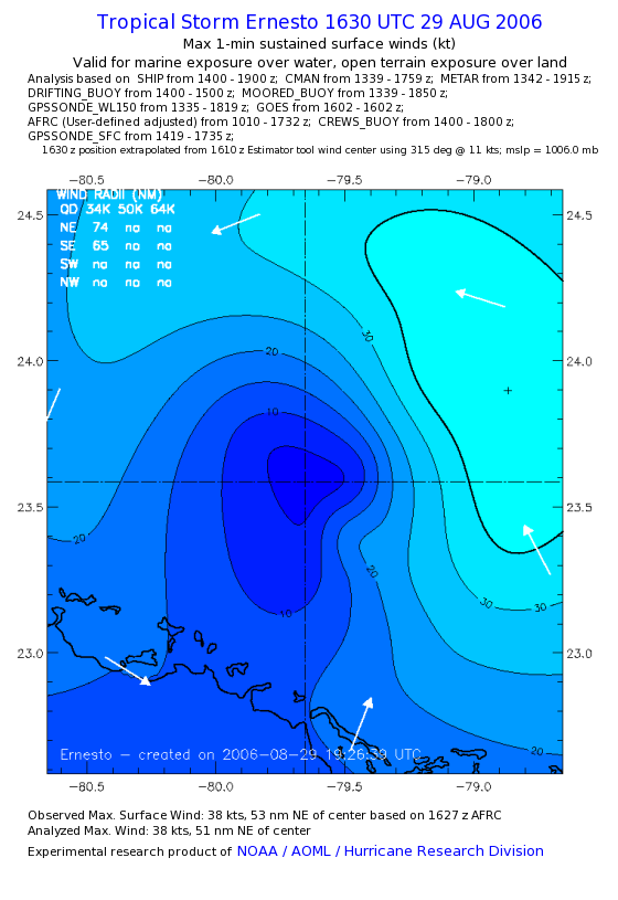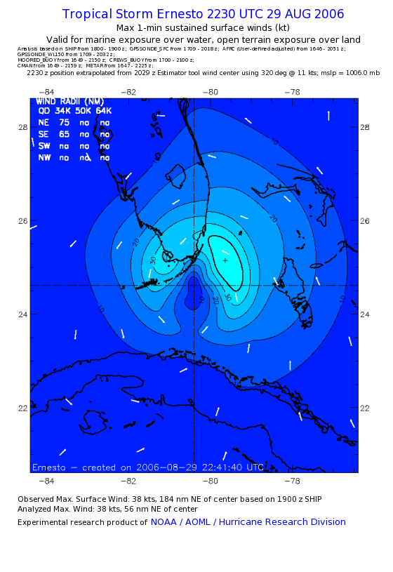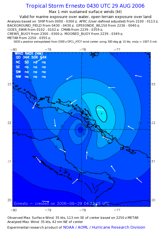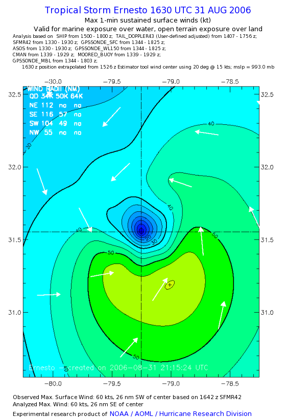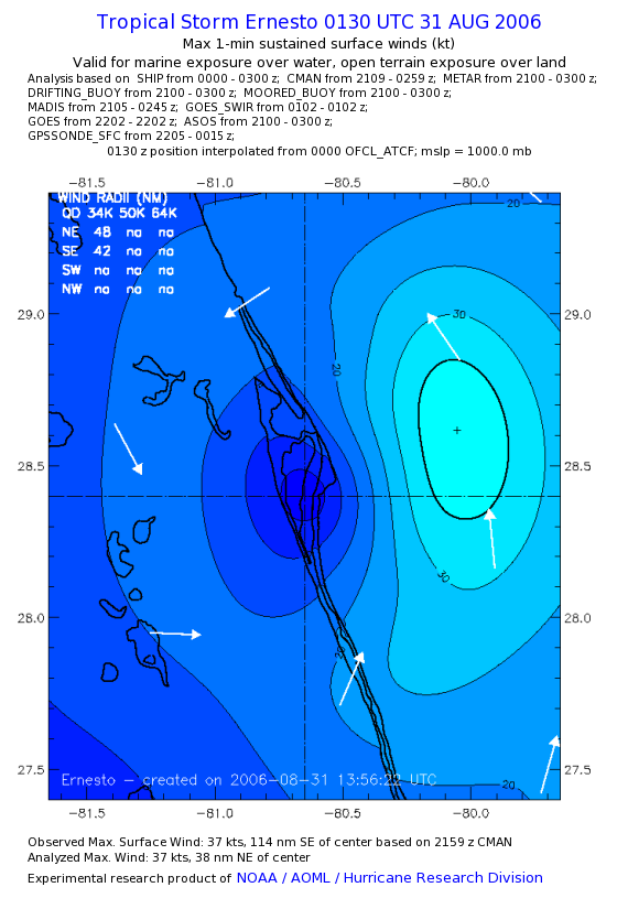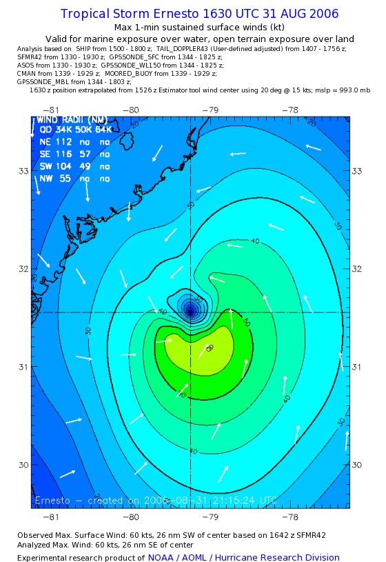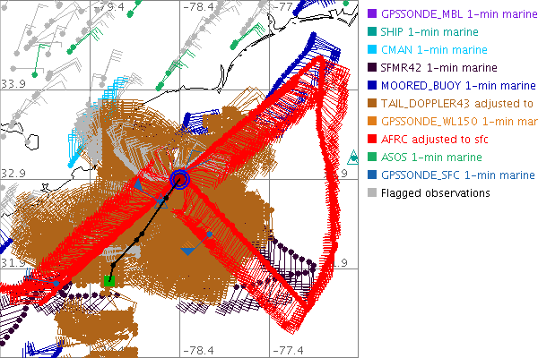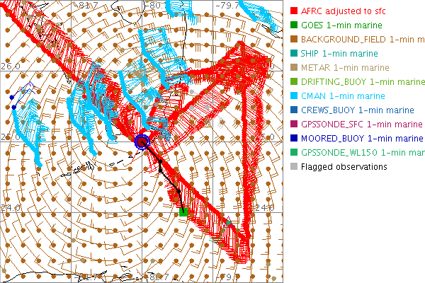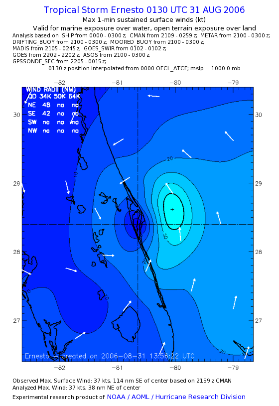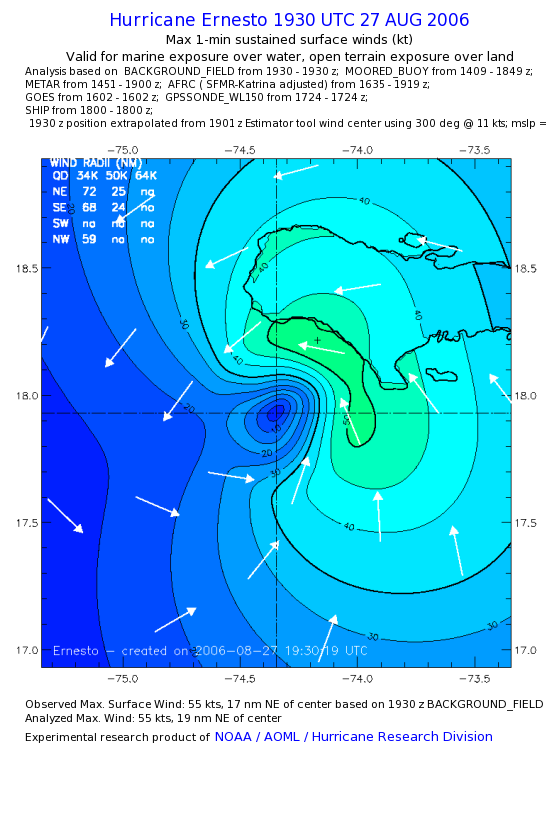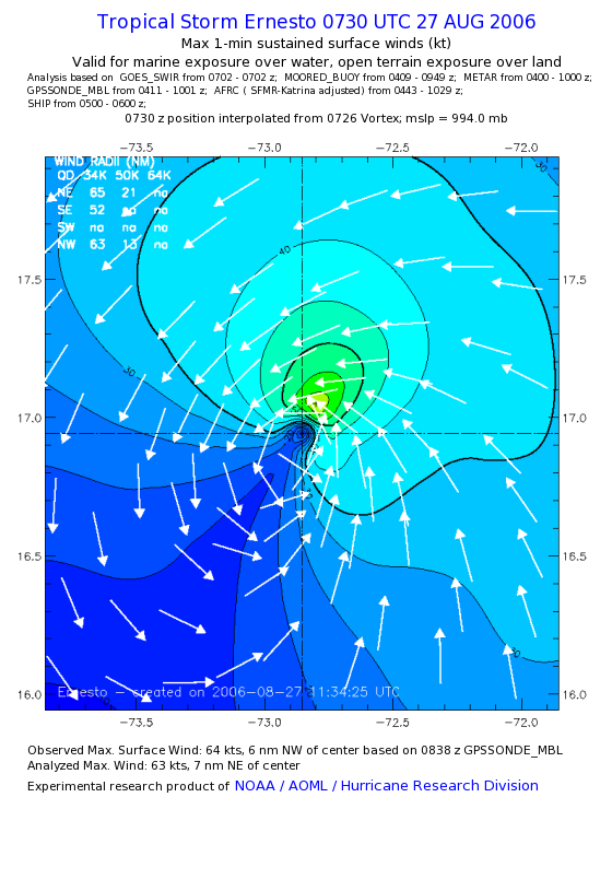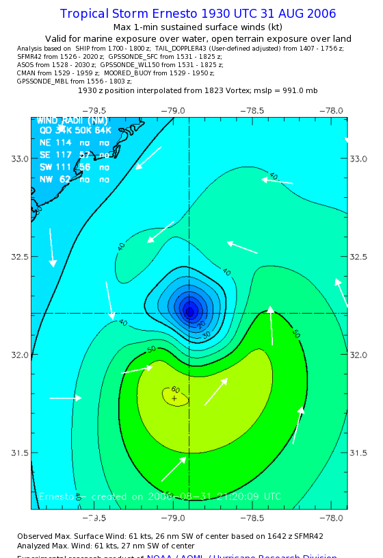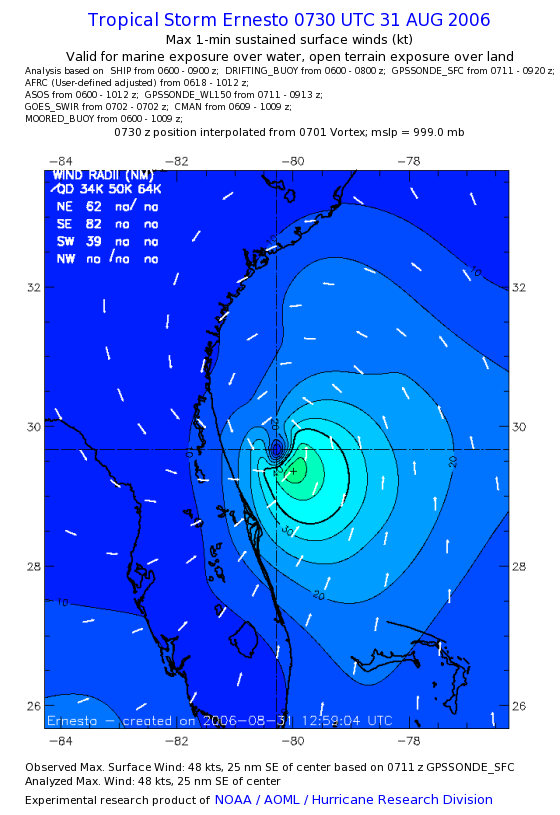 As a public service we are hosting the legacy H*wind archive that was formerly available through NOAA. Most of the archive was conducted in real-time so data collected after the analysis time were not available. Methods used to conduct the analyses evolved over the years. Grid spacing is on the order of 6 km and maximum domain size varies but is typically 8 x 8 degrees. There are known errors in some of the data coverage, mapping, and gridded products. For more information on the archive please go here. For realtime and post storm analysis of the 2014 season and a revised historical archive go here. |