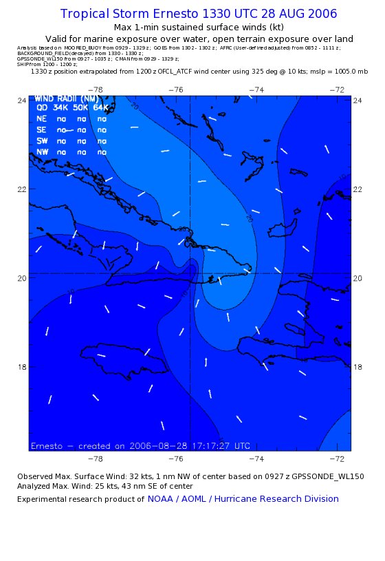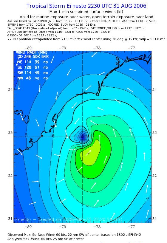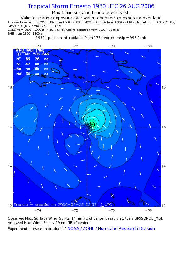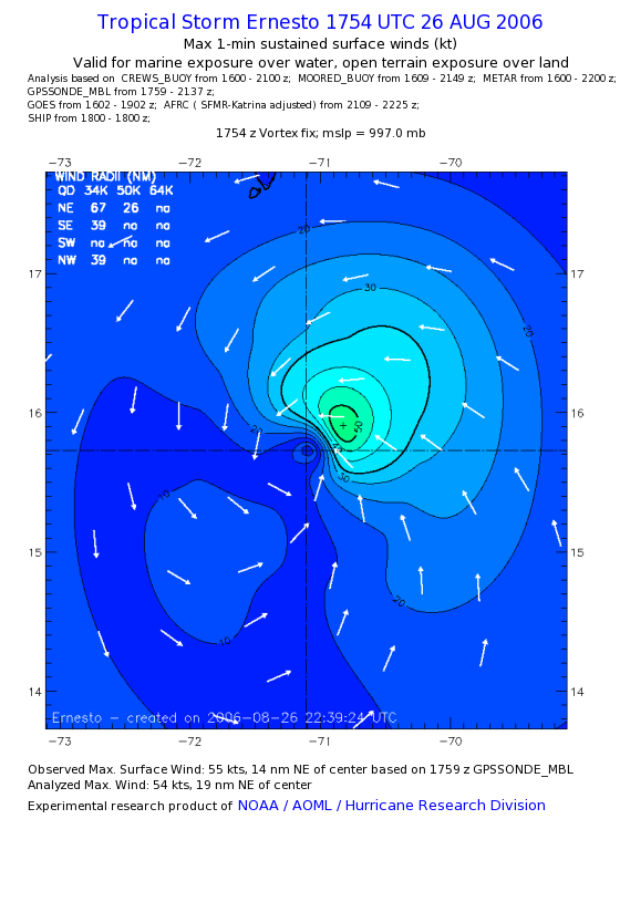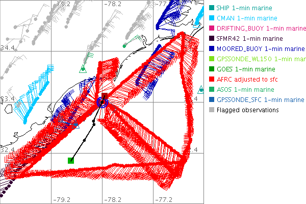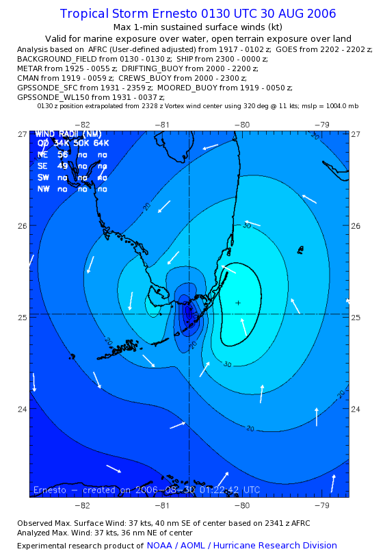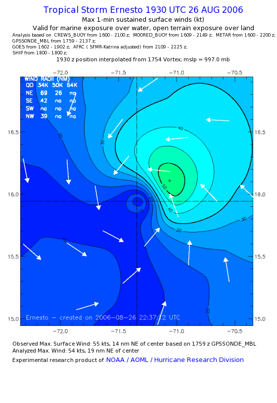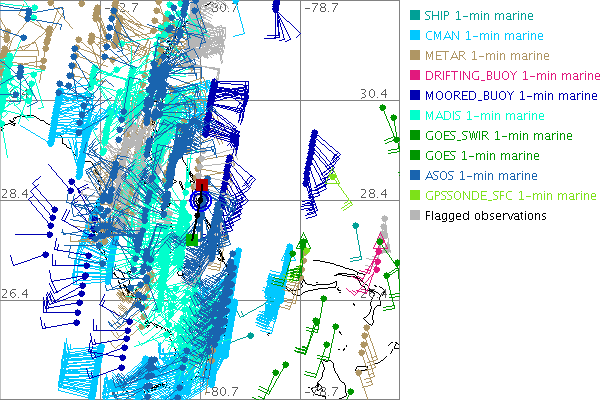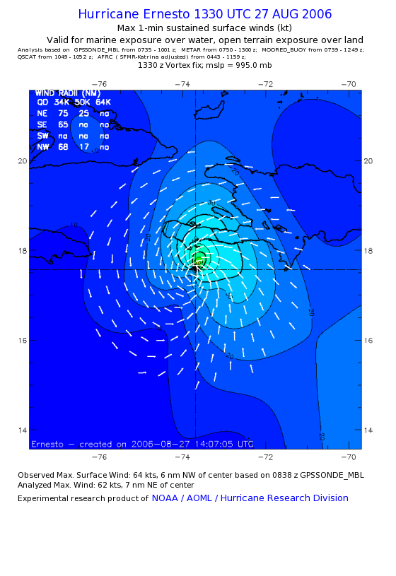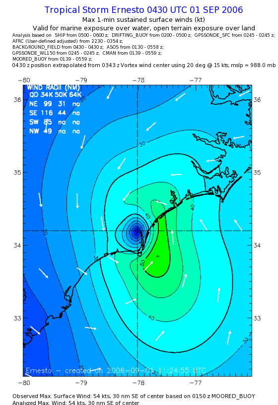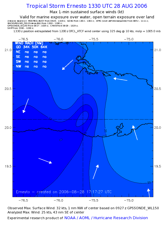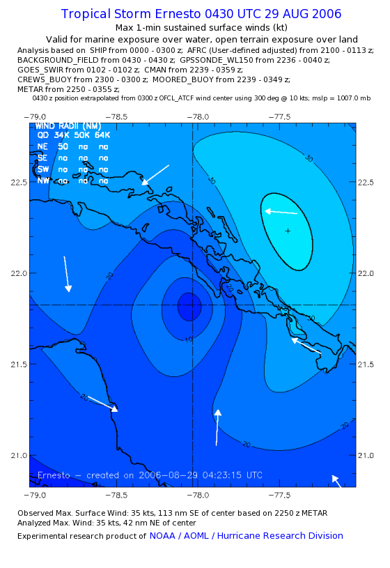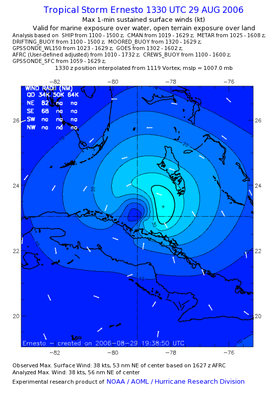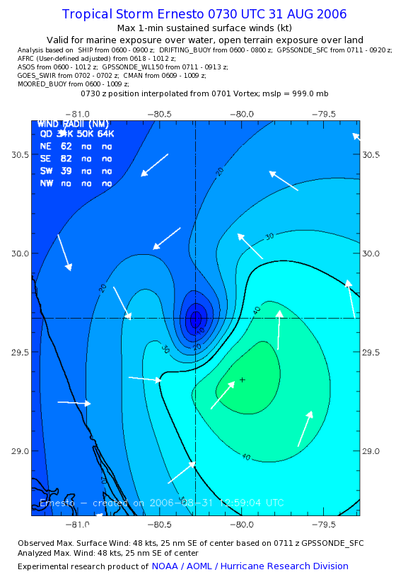 As a public service we are hosting the legacy H*wind archive that was formerly available through NOAA. Most of the archive was conducted in real-time so data collected after the analysis time were not available. Methods used to conduct the analyses evolved over the years. Grid spacing is on the order of 6 km and maximum domain size varies but is typically 8 x 8 degrees. There are known errors in some of the data coverage, mapping, and gridded products. For more information on the archive please go here. For realtime and post storm analysis of the 2014 season and a revised historical archive go here. |