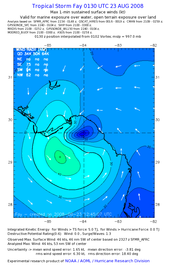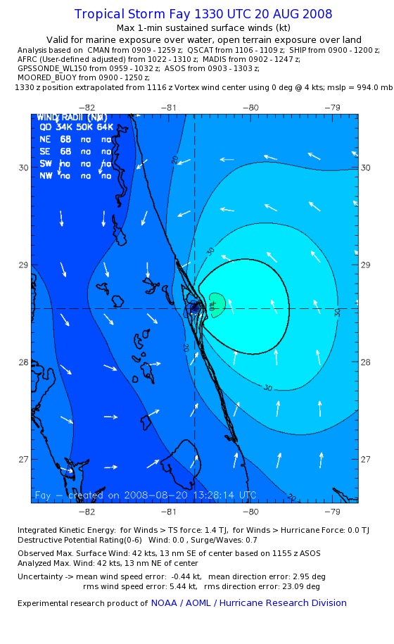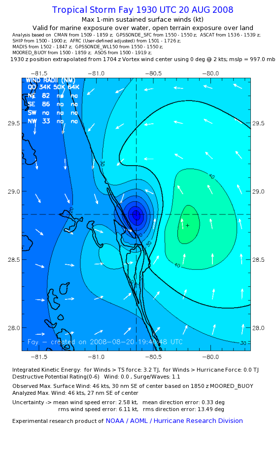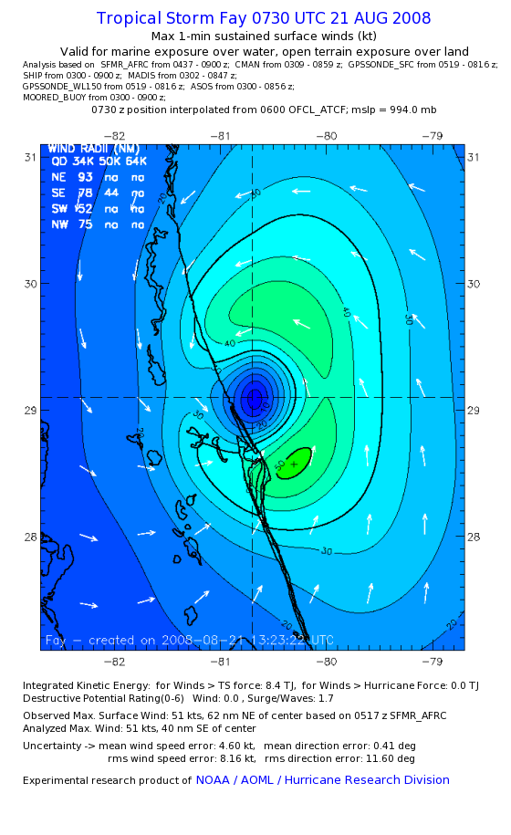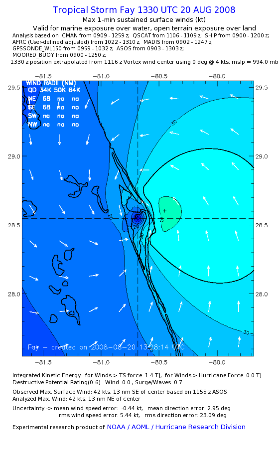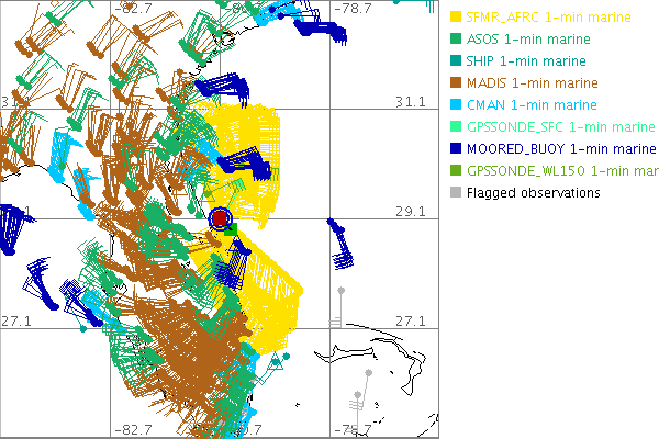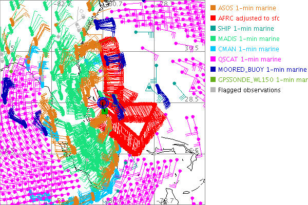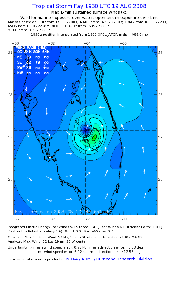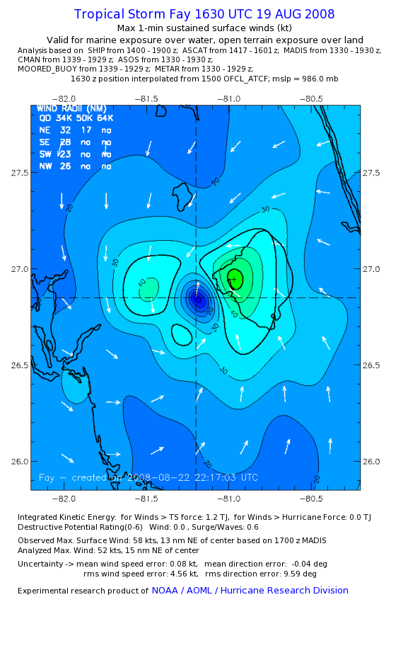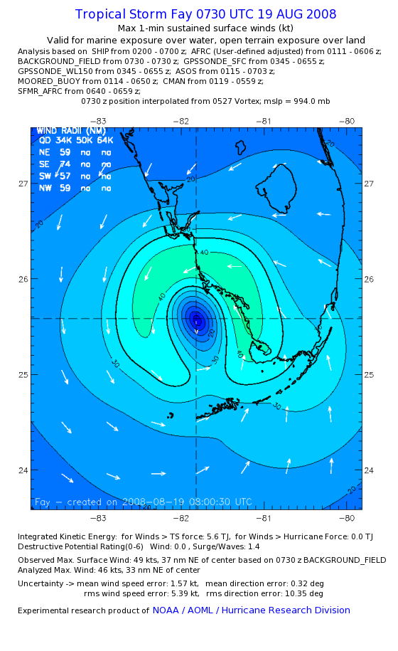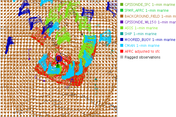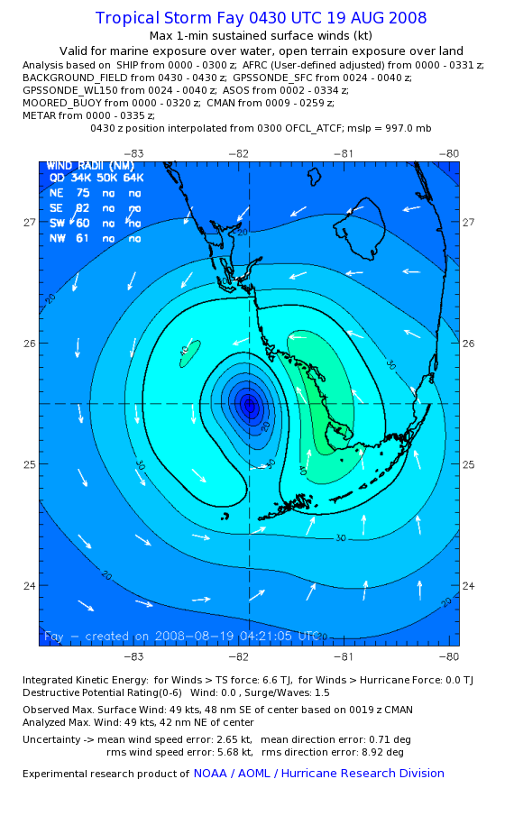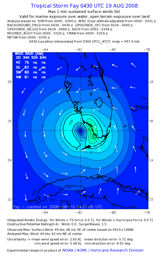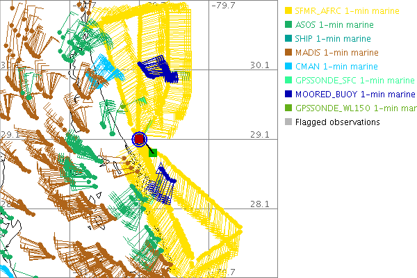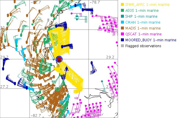 As a public service we are hosting the legacy H*wind archive that was formerly available through NOAA. Most of the archive was conducted in real-time so data collected after the analysis time were not available. Methods used to conduct the analyses evolved over the years. Grid spacing is on the order of 6 km and maximum domain size varies but is typically 8 x 8 degrees. There are known errors in some of the data coverage, mapping, and gridded products. For more information on the archive please go here. For realtime and post storm analysis of the 2014 season and a revised historical archive go here. |