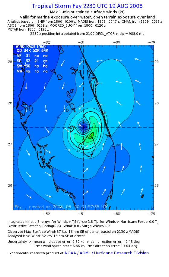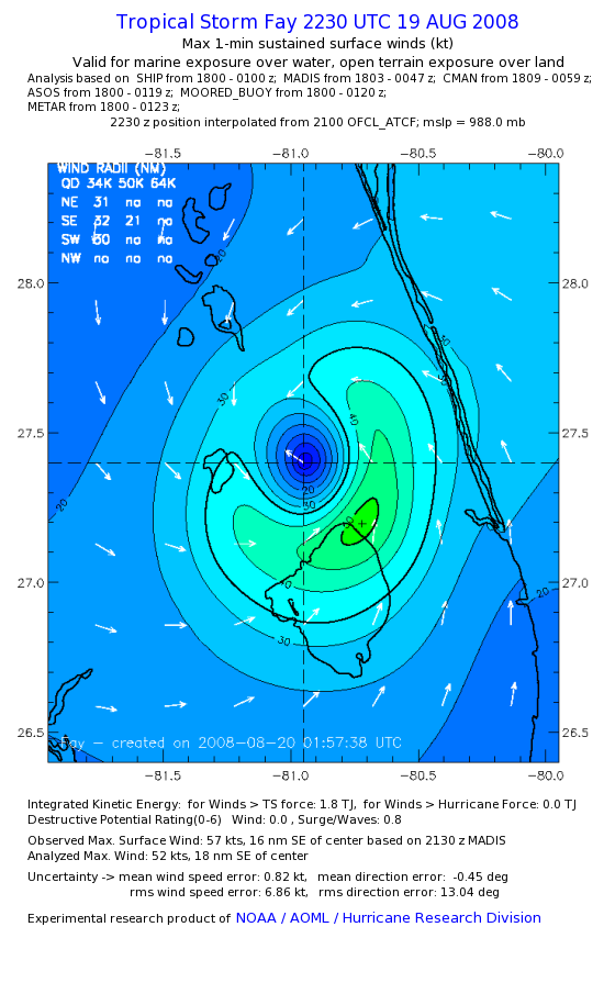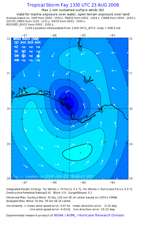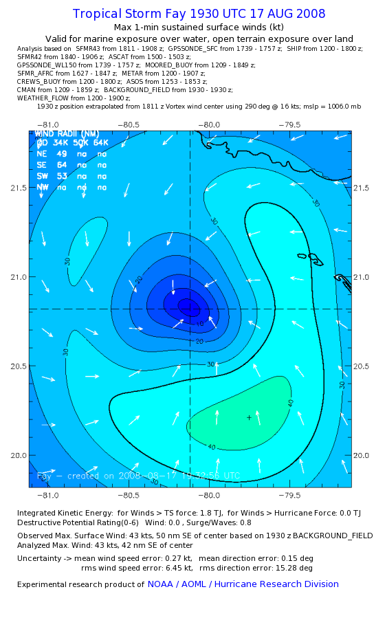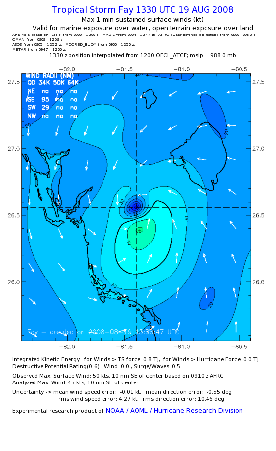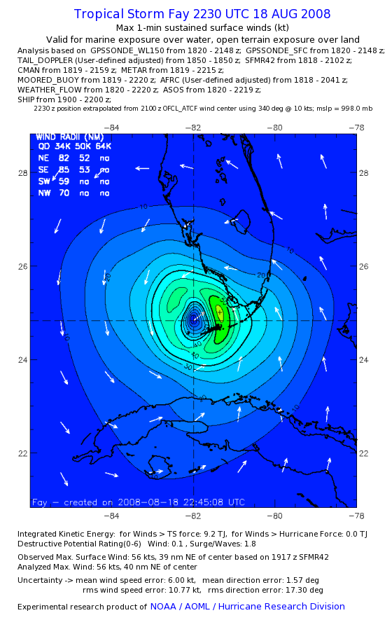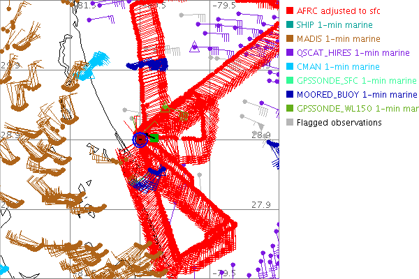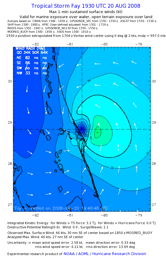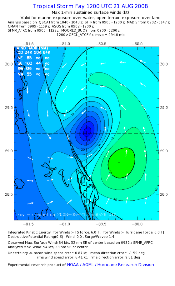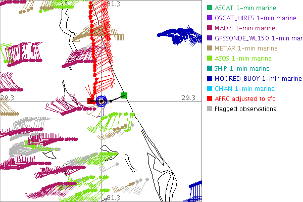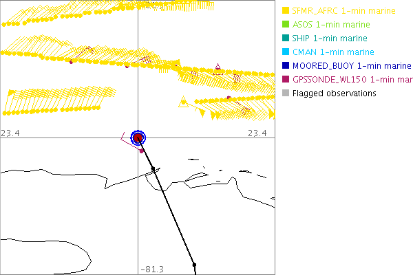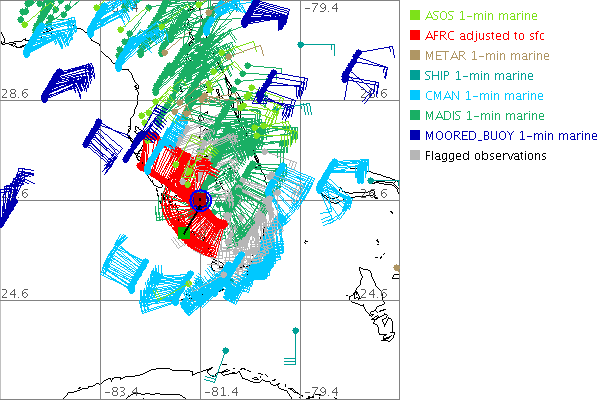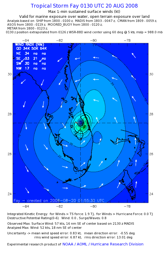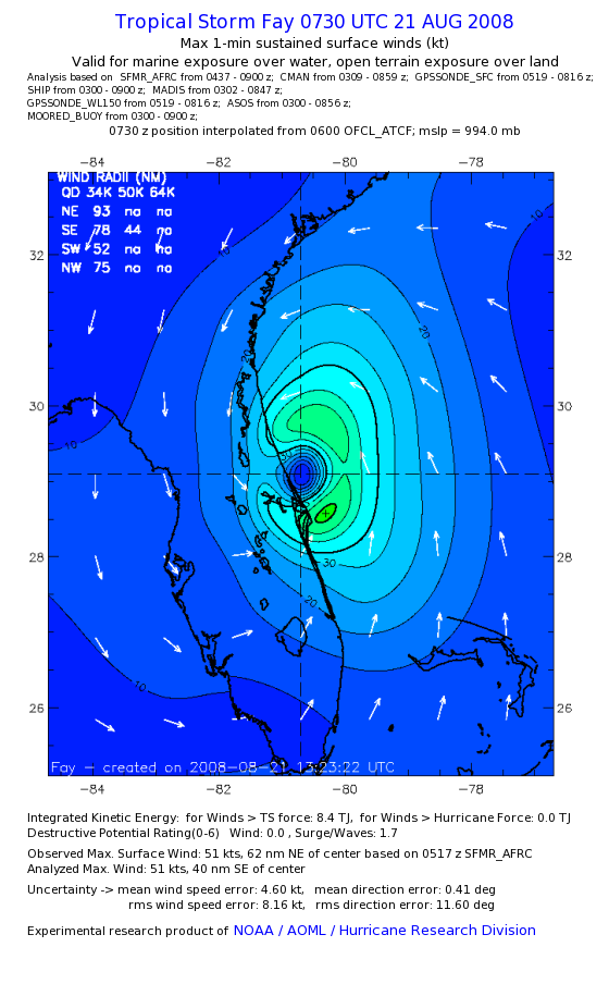 As a public service we are hosting the legacy H*wind archive that was formerly available through NOAA. Most of the archive was conducted in real-time so data collected after the analysis time were not available. Methods used to conduct the analyses evolved over the years. Grid spacing is on the order of 6 km and maximum domain size varies but is typically 8 x 8 degrees. There are known errors in some of the data coverage, mapping, and gridded products. For more information on the archive please go here. For realtime and post storm analysis of the 2014 season and a revised historical archive go here. |