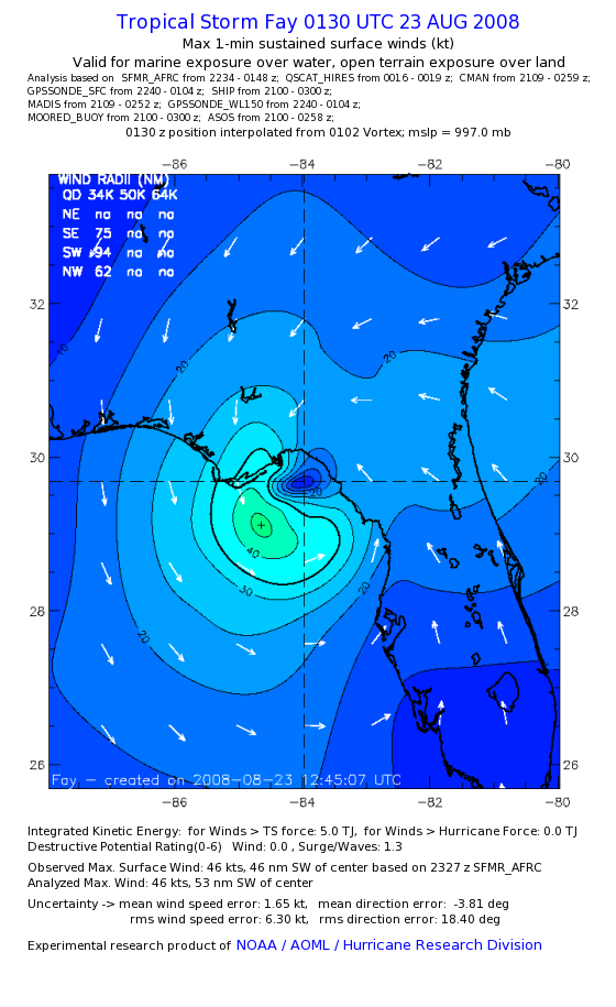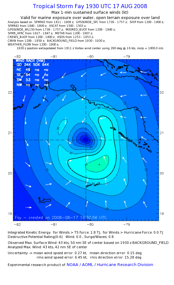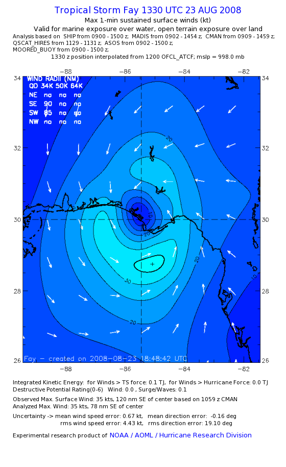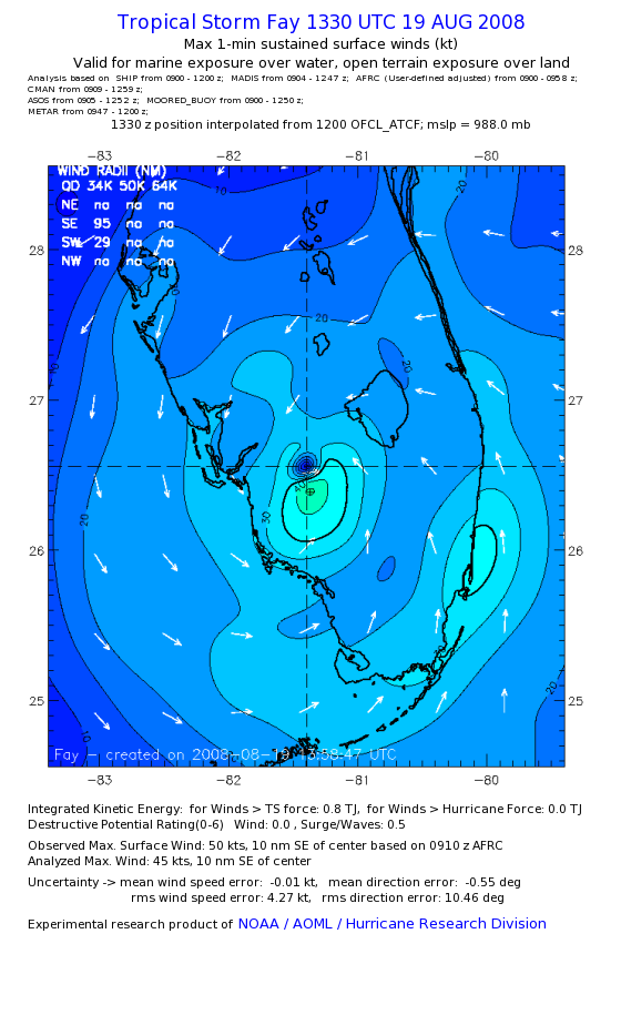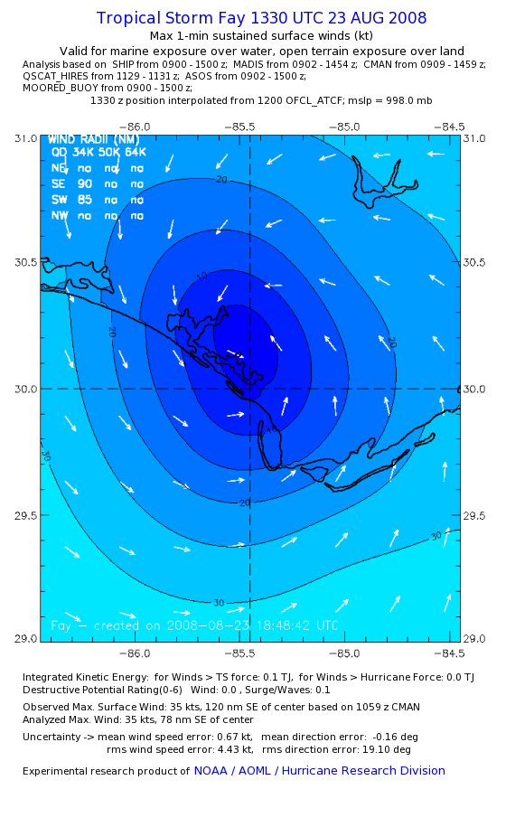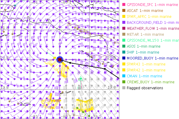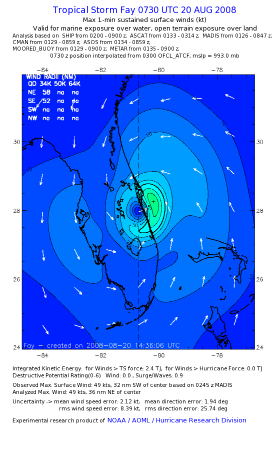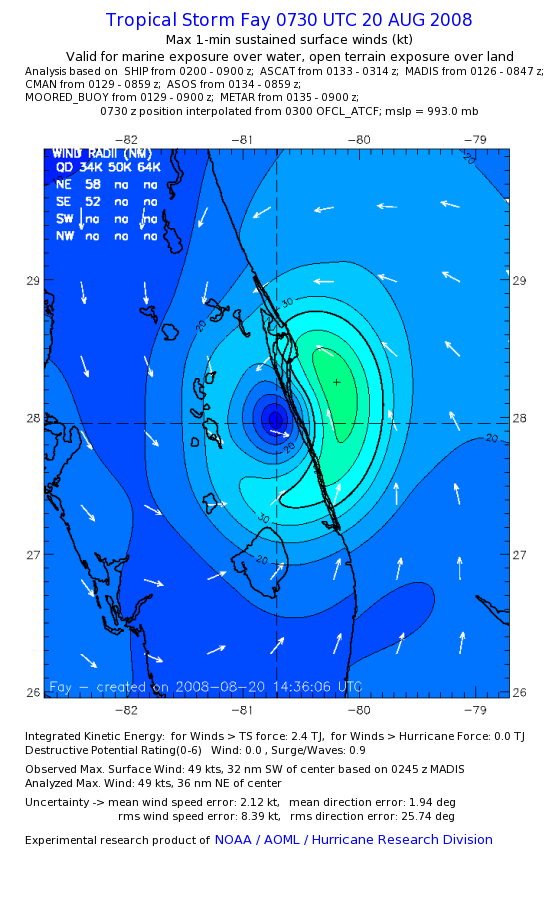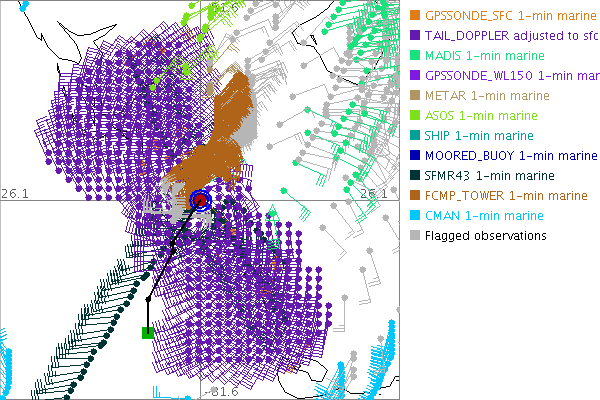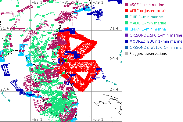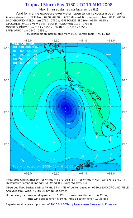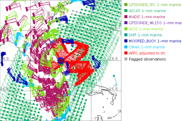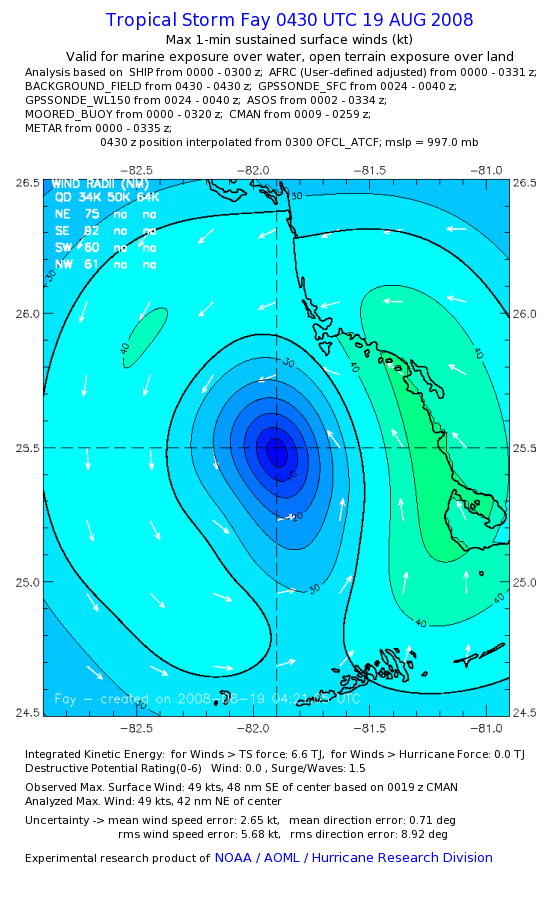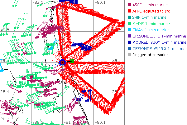 As a public service we are hosting the legacy H*wind archive that was formerly available through NOAA. Most of the archive was conducted in real-time so data collected after the analysis time were not available. Methods used to conduct the analyses evolved over the years. Grid spacing is on the order of 6 km and maximum domain size varies but is typically 8 x 8 degrees. There are known errors in some of the data coverage, mapping, and gridded products. For more information on the archive please go here. For realtime and post storm analysis of the 2014 season and a revised historical archive go here. |