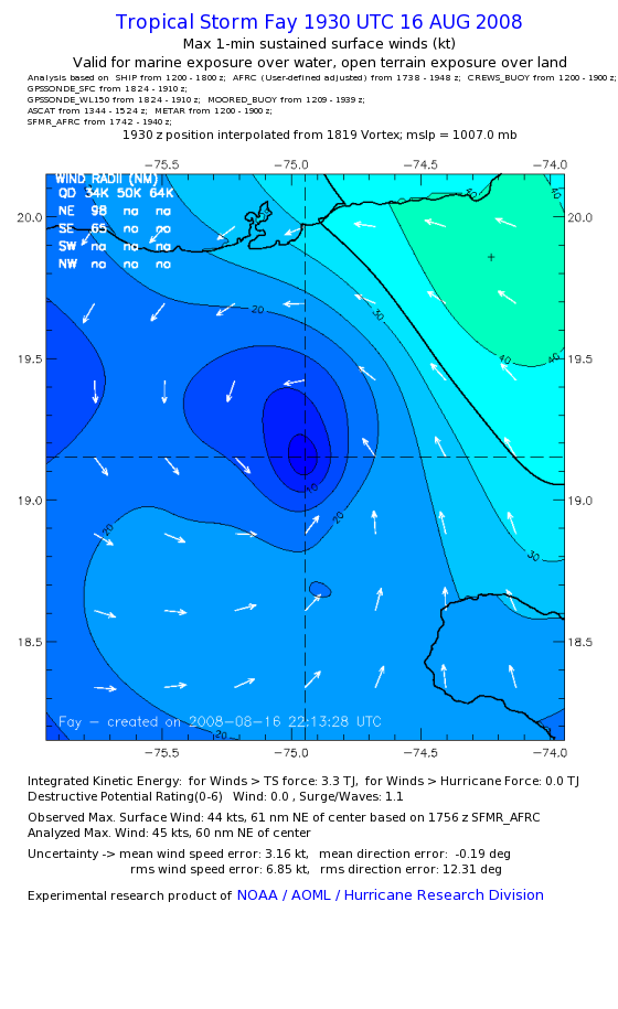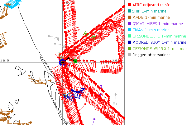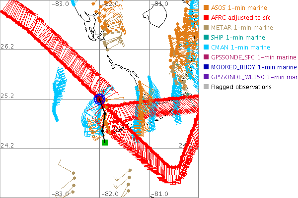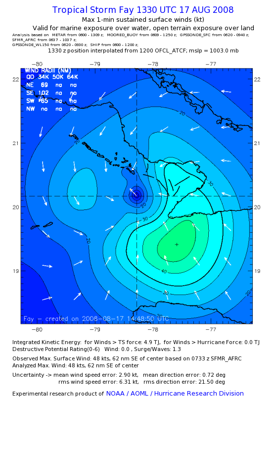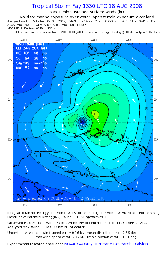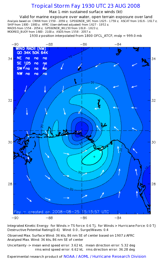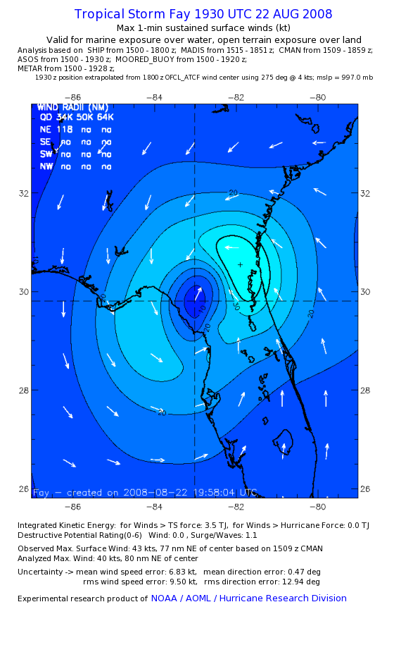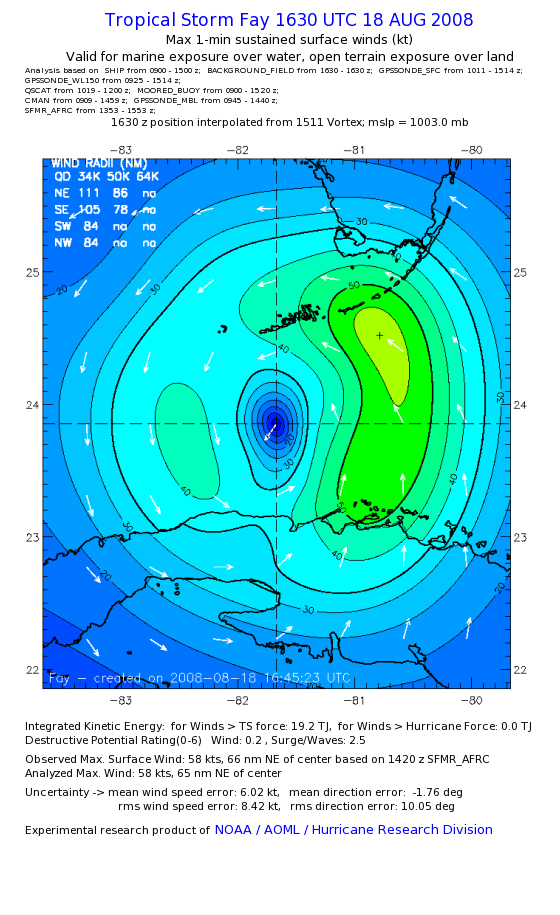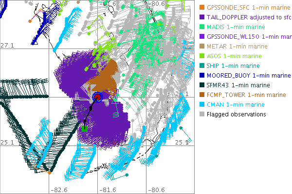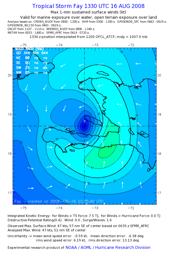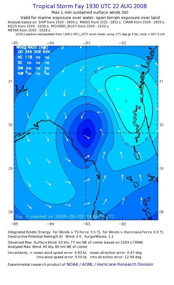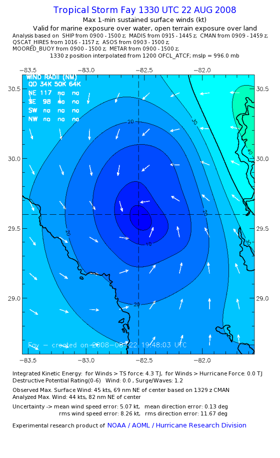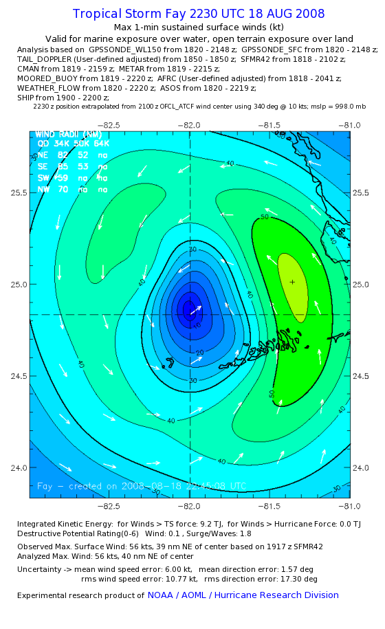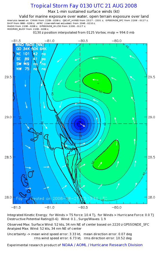 As a public service we are hosting the legacy H*wind archive that was formerly available through NOAA. Most of the archive was conducted in real-time so data collected after the analysis time were not available. Methods used to conduct the analyses evolved over the years. Grid spacing is on the order of 6 km and maximum domain size varies but is typically 8 x 8 degrees. There are known errors in some of the data coverage, mapping, and gridded products. For more information on the archive please go here. For realtime and post storm analysis of the 2014 season and a revised historical archive go here. |