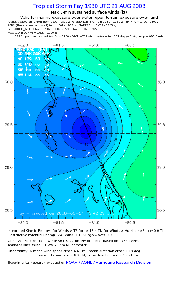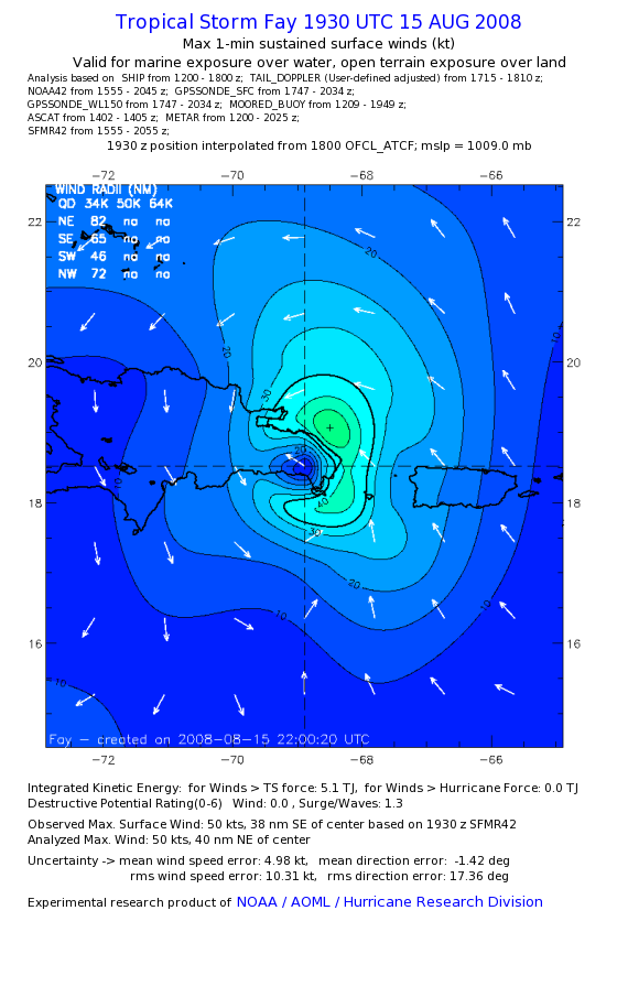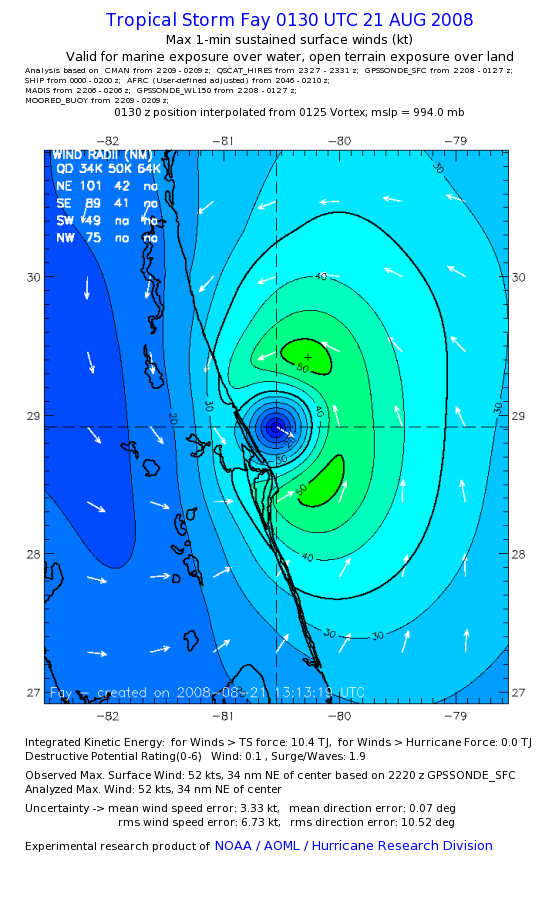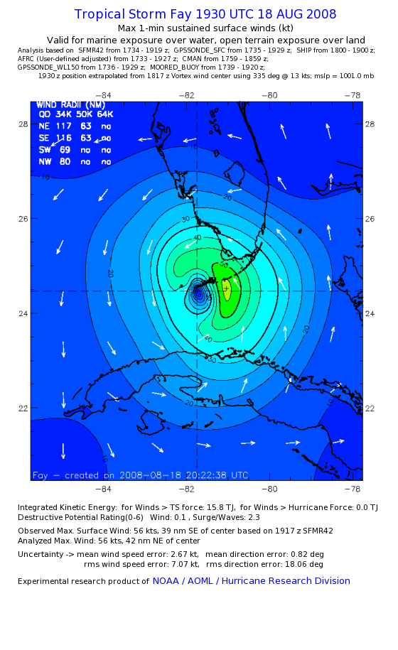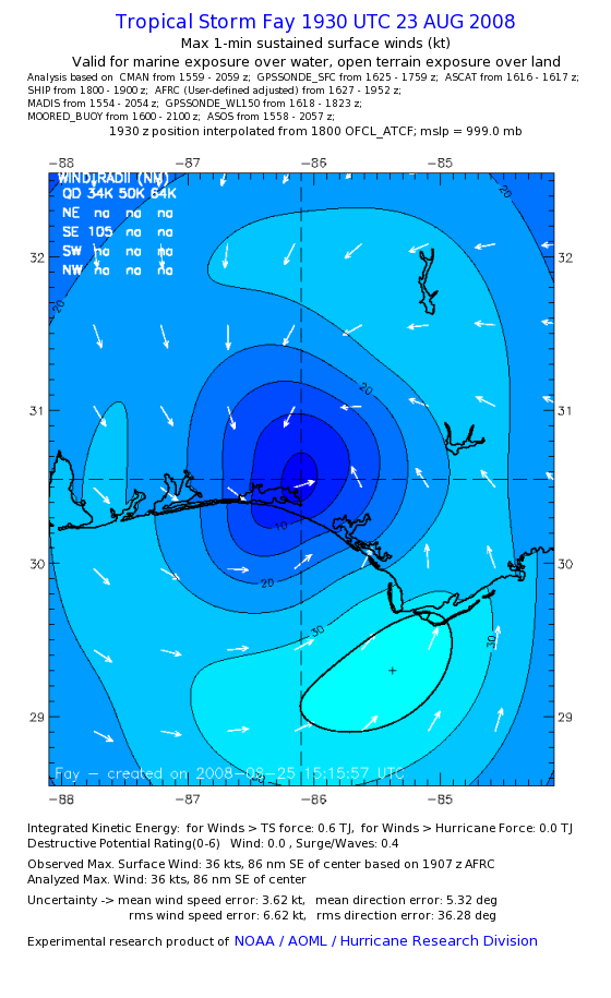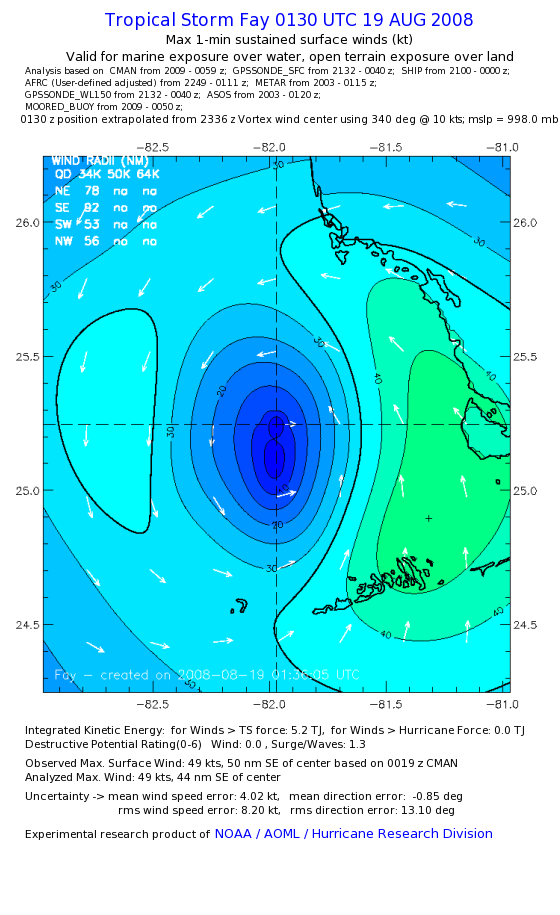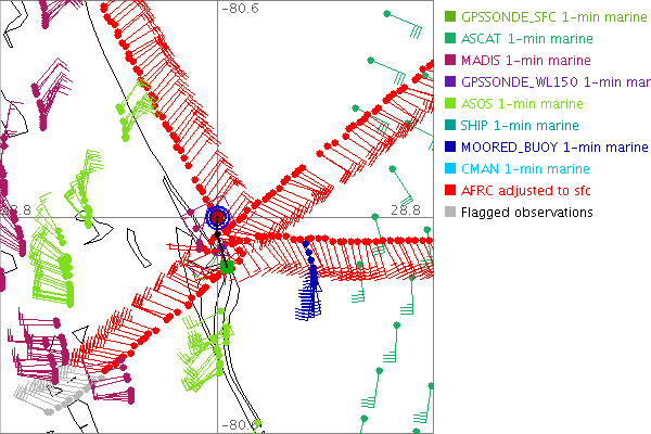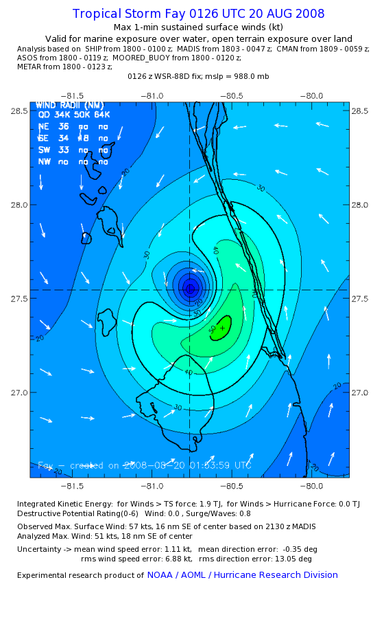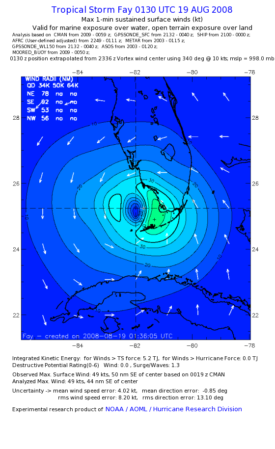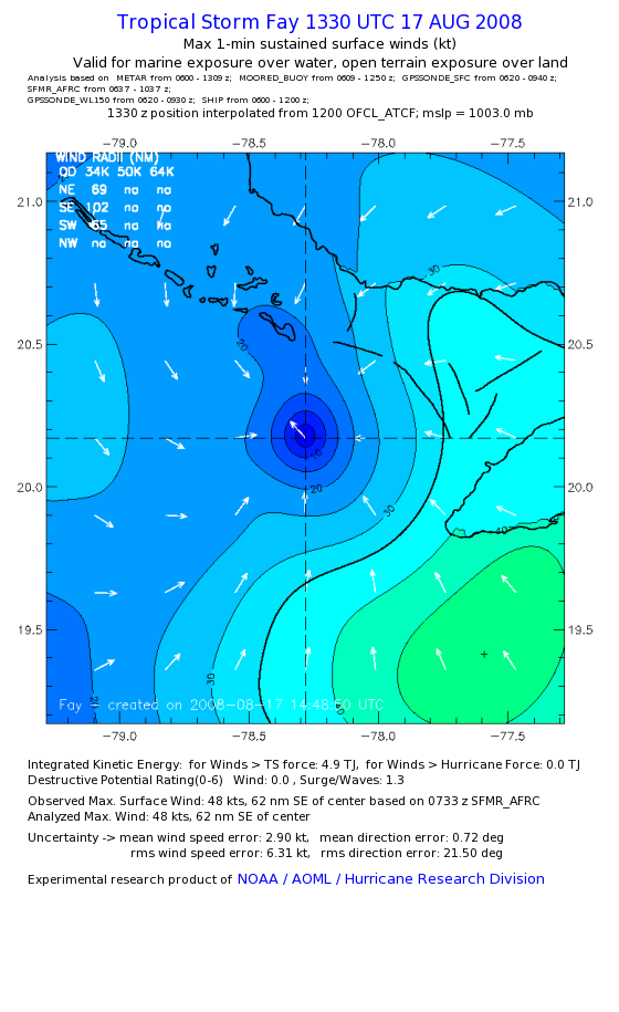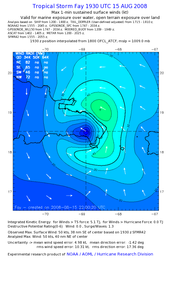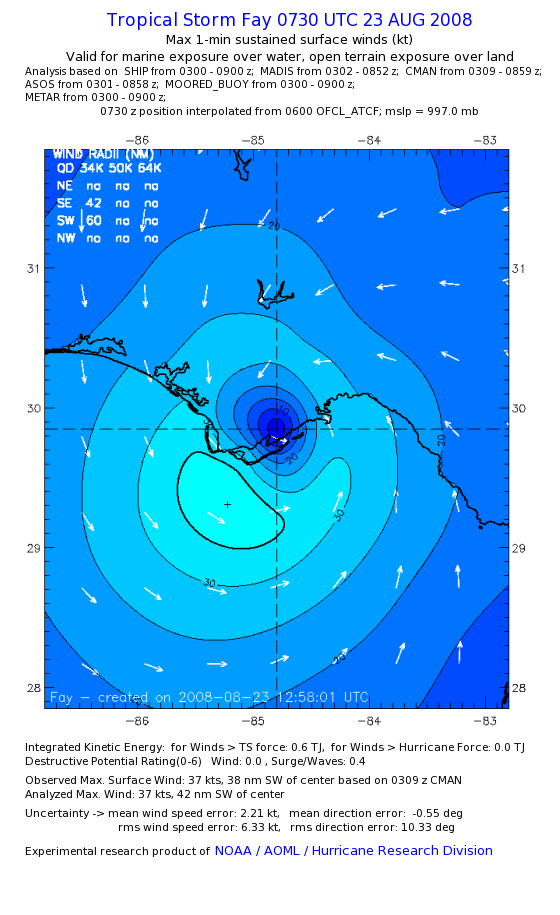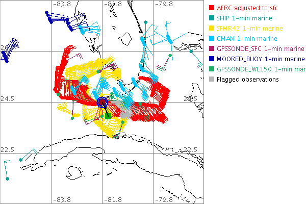 As a public service we are hosting the legacy H*wind archive that was formerly available through NOAA. Most of the archive was conducted in real-time so data collected after the analysis time were not available. Methods used to conduct the analyses evolved over the years. Grid spacing is on the order of 6 km and maximum domain size varies but is typically 8 x 8 degrees. There are known errors in some of the data coverage, mapping, and gridded products. For more information on the archive please go here. For realtime and post storm analysis of the 2014 season and a revised historical archive go here. |