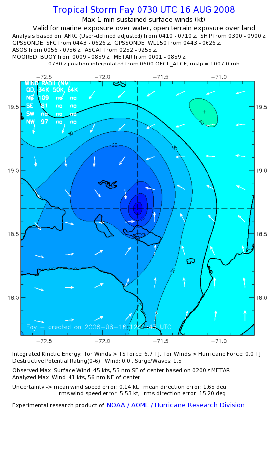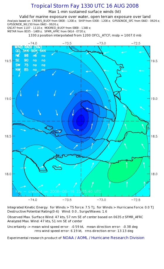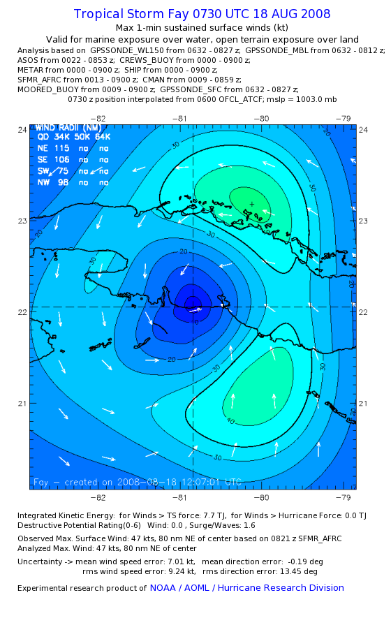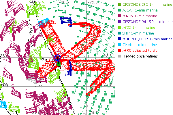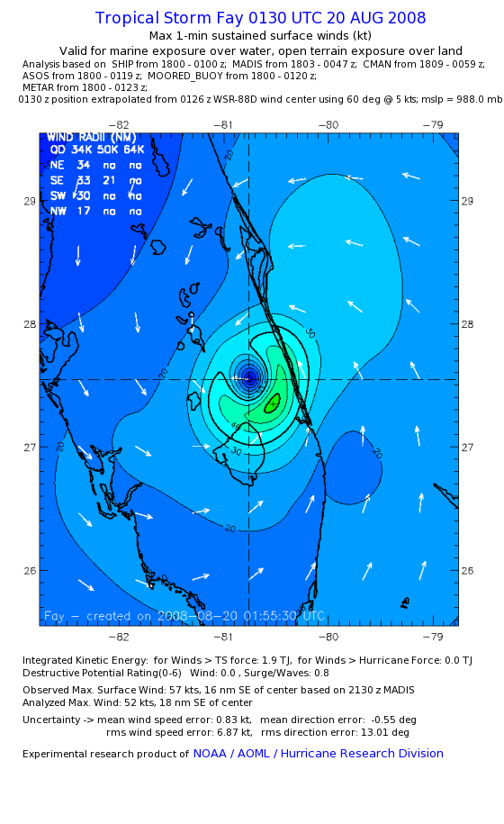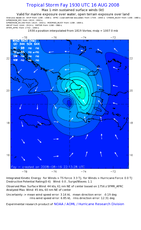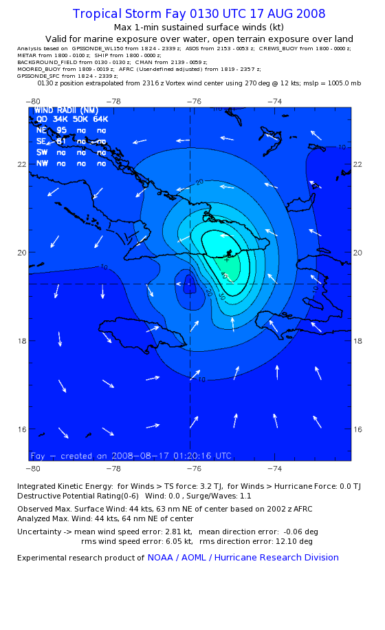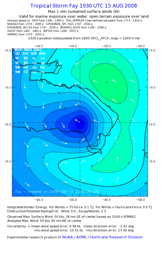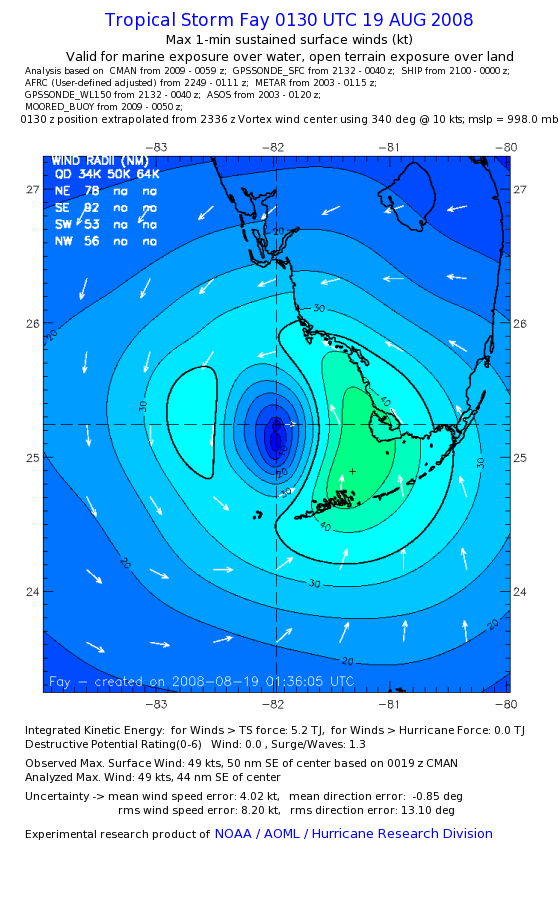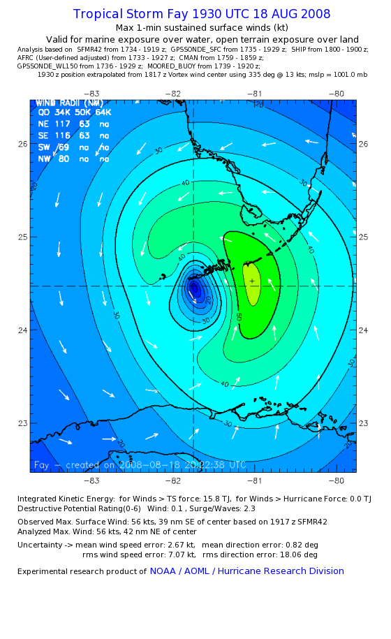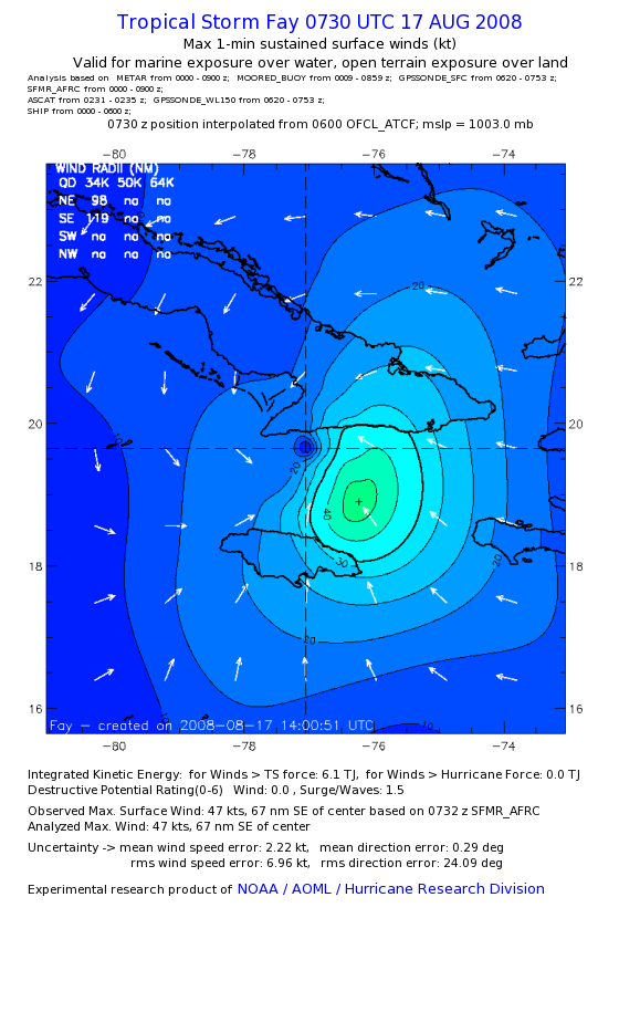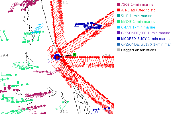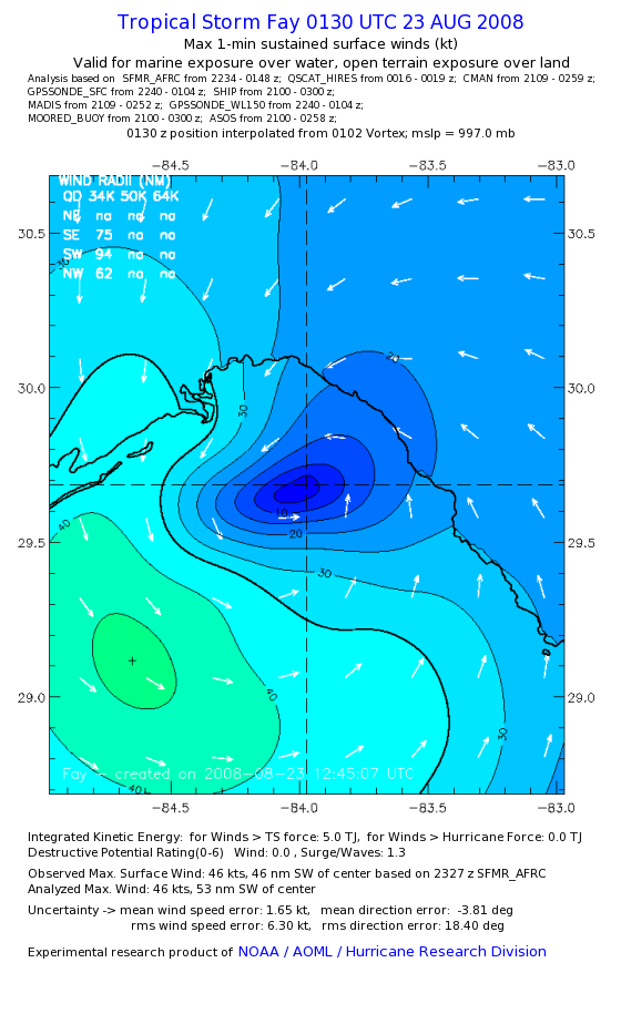 As a public service we are hosting the legacy H*wind archive that was formerly available through NOAA. Most of the archive was conducted in real-time so data collected after the analysis time were not available. Methods used to conduct the analyses evolved over the years. Grid spacing is on the order of 6 km and maximum domain size varies but is typically 8 x 8 degrees. There are known errors in some of the data coverage, mapping, and gridded products. For more information on the archive please go here. For realtime and post storm analysis of the 2014 season and a revised historical archive go here. |