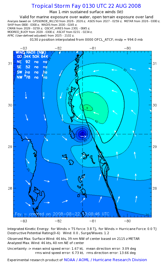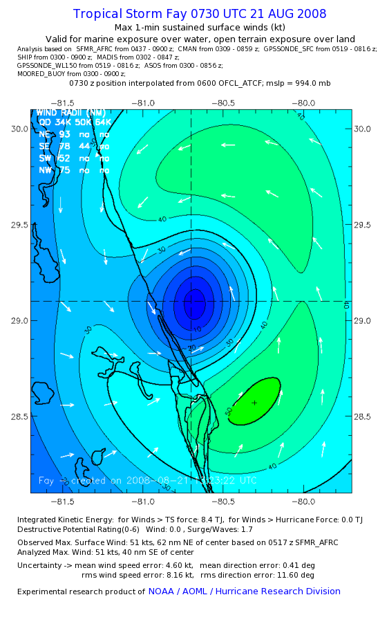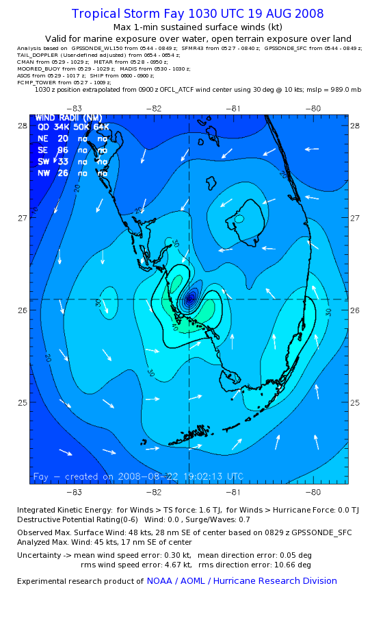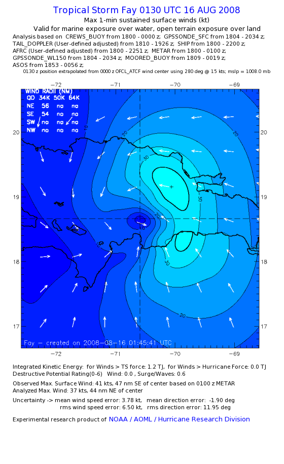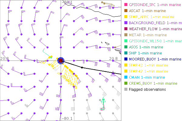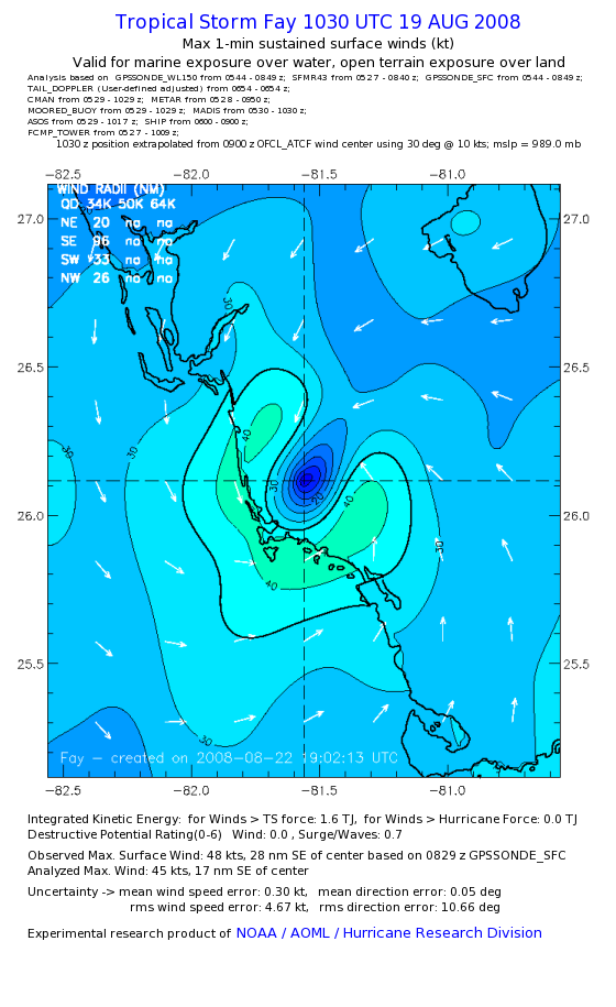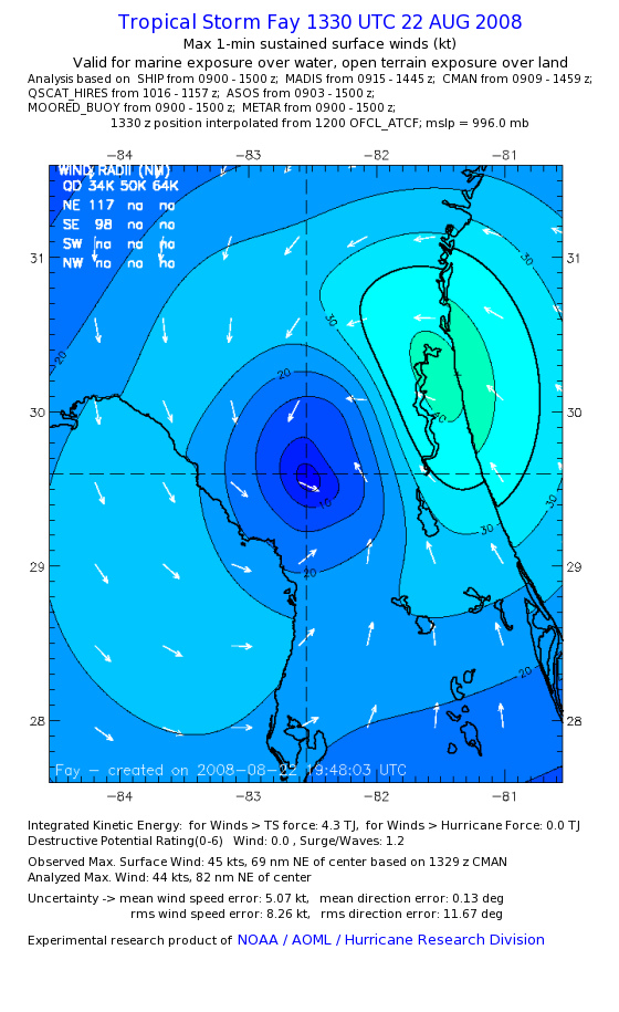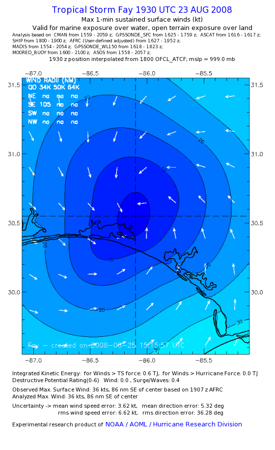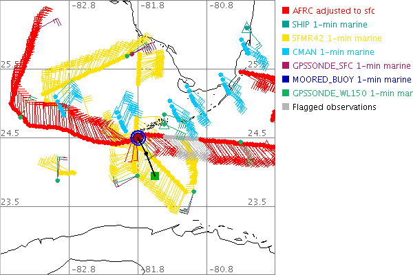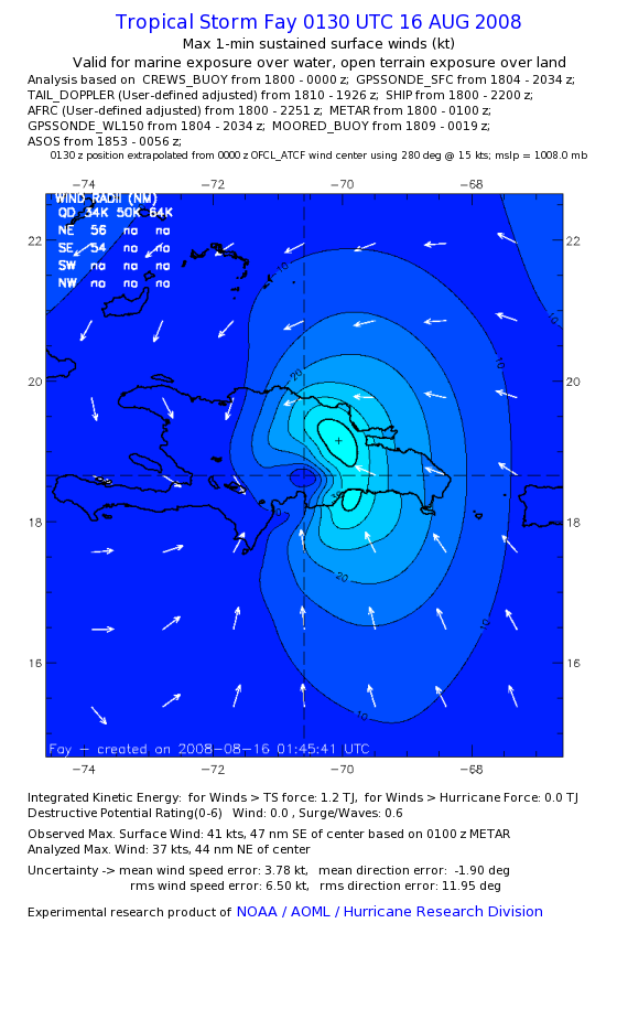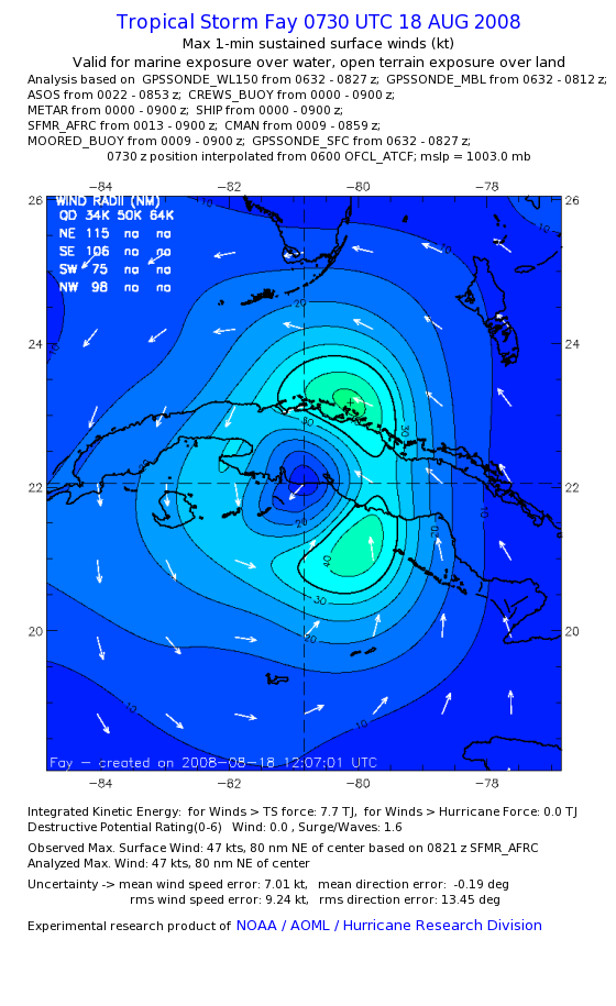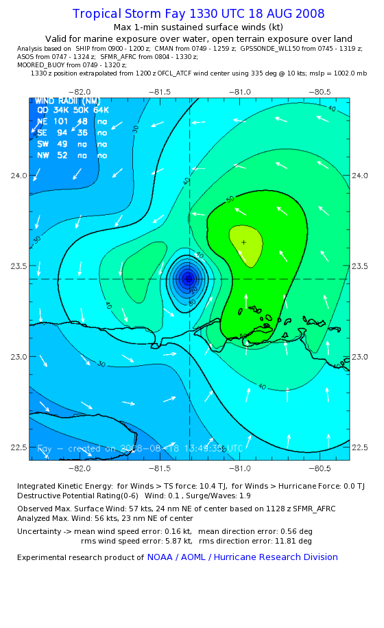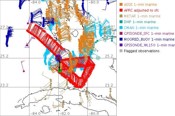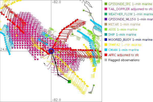As a public service we are hosting the legacy H*wind archive that was formerly available through NOAA. Most of the archive was conducted in real-time so data collected after the analysis time were not available. Methods used to conduct the analyses evolved over the years. Grid spacing is on the order of 6 km and maximum domain size varies but is typically 8 x 8 degrees. There are known errors in some of the data coverage, mapping, and gridded products. For more information on the archive please go here. For realtime and post storm analysis of the 2014 season and a revised historical archive go here. |