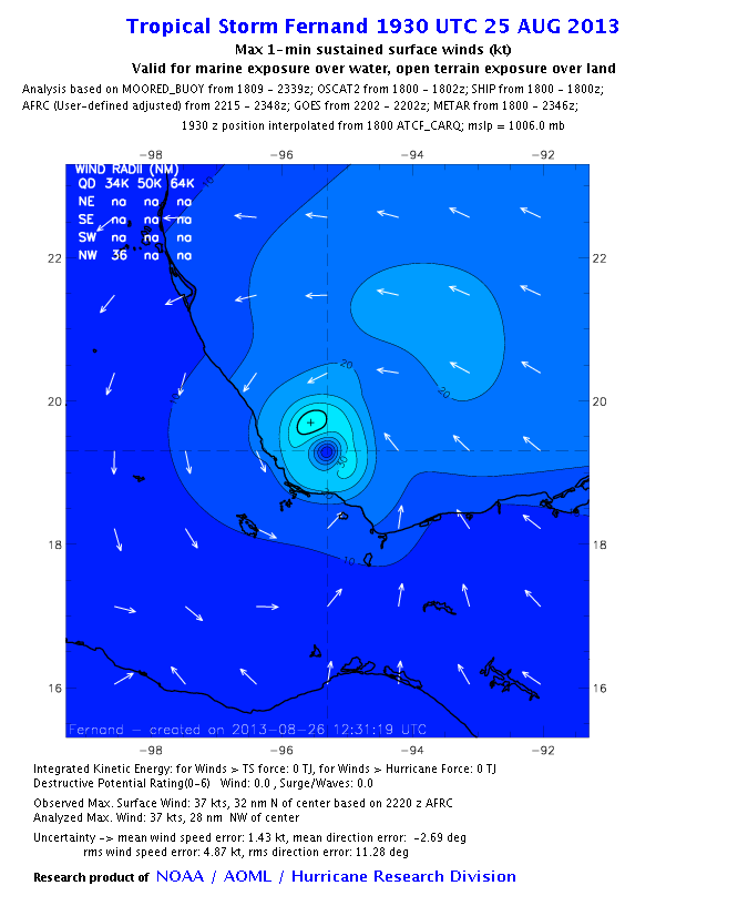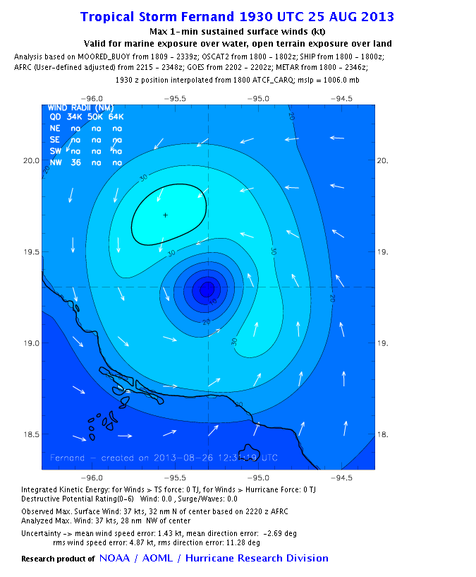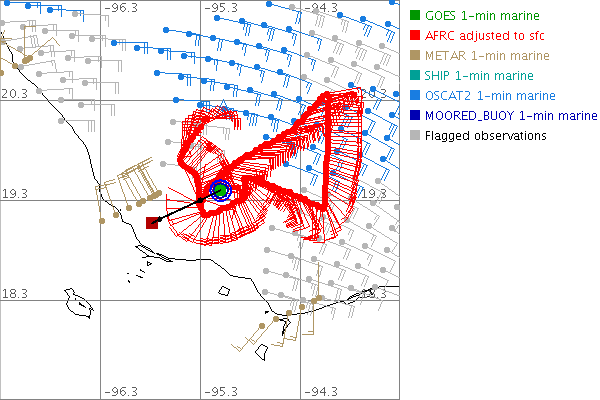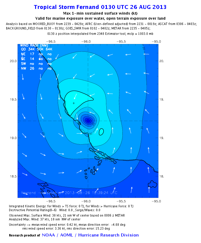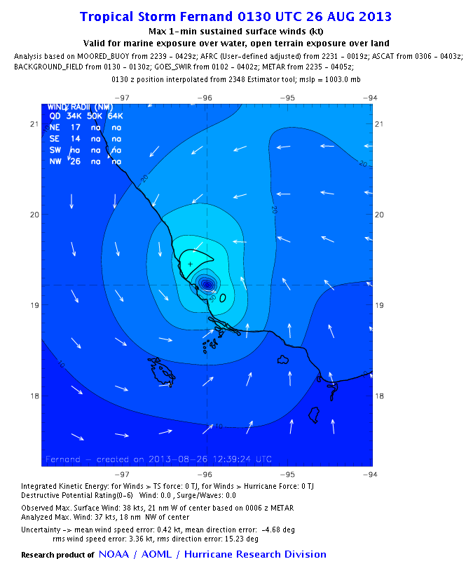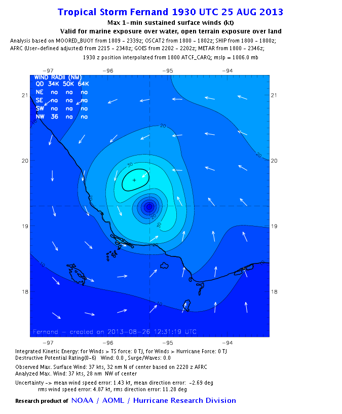 As a public service we are hosting the legacy H*wind archive that was formerly available through NOAA. Most of the archive was conducted in real-time so data collected after the analysis time were not available. Methods used to conduct the analyses evolved over the years. Grid spacing is on the order of 6 km and maximum domain size varies but is typically 8 x 8 degrees. There are known errors in some of the data coverage, mapping, and gridded products. For more information on the archive please go here. For realtime and post storm analysis of the 2014 season and a revised historical archive go here.
