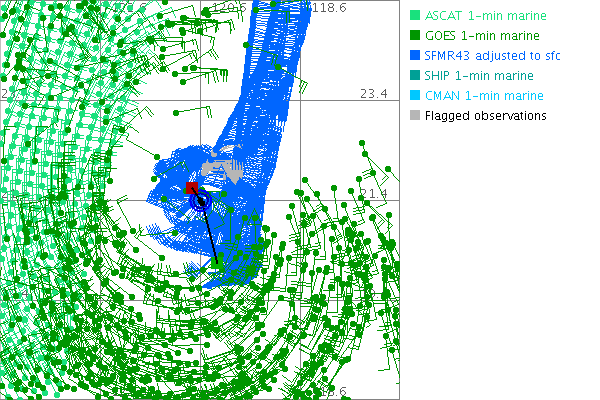As a public service we are hosting the legacy H*wind archive that was formerly available through NOAA. Most of the archive was conducted in real-time so data collected after the analysis time were not available. Methods used to conduct the analyses evolved over the years. Grid spacing is on the order of 6 km and maximum domain size varies but is typically 8 x 8 degrees. There are known errors in some of the data coverage, mapping, and gridded products. For more information on the archive please go here. For realtime and post storm analysis of the 2014 season and a revised historical archive go here.