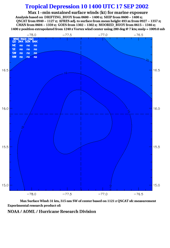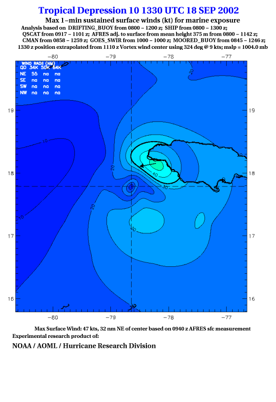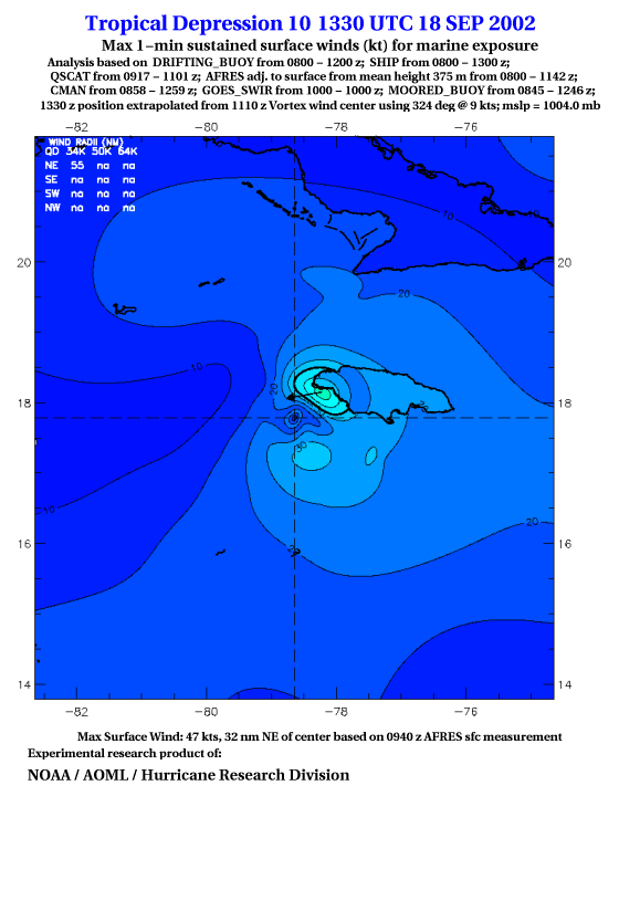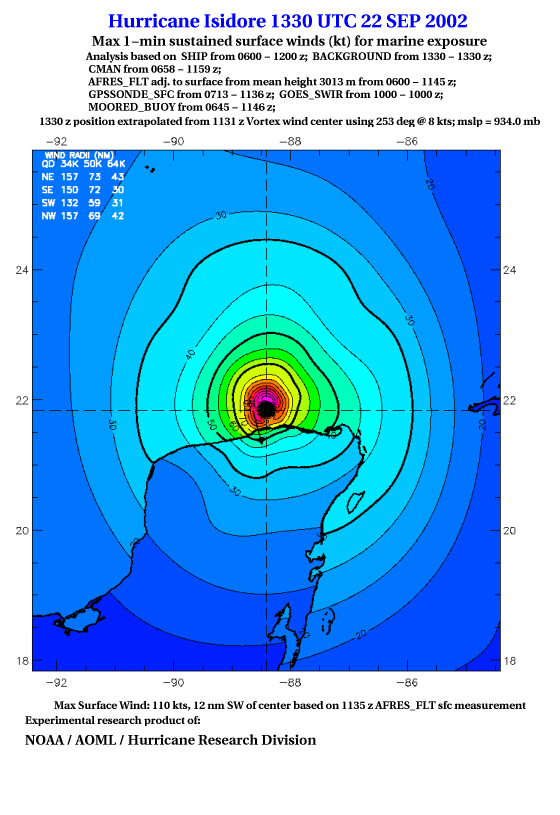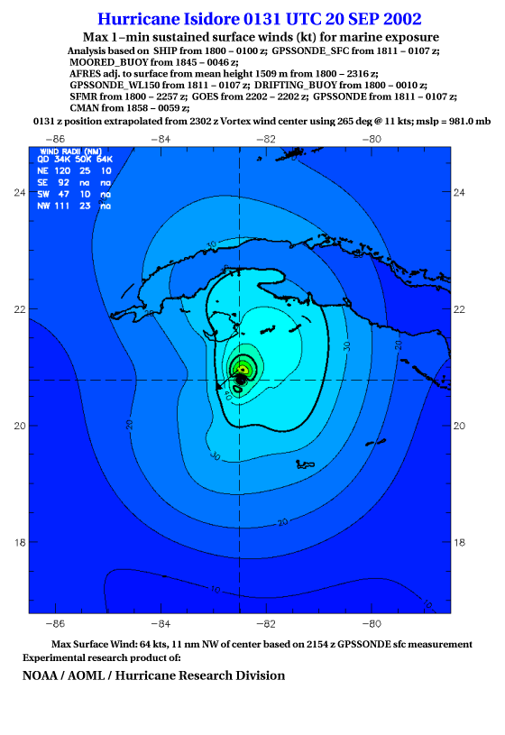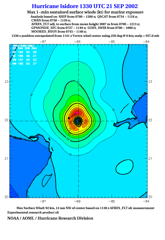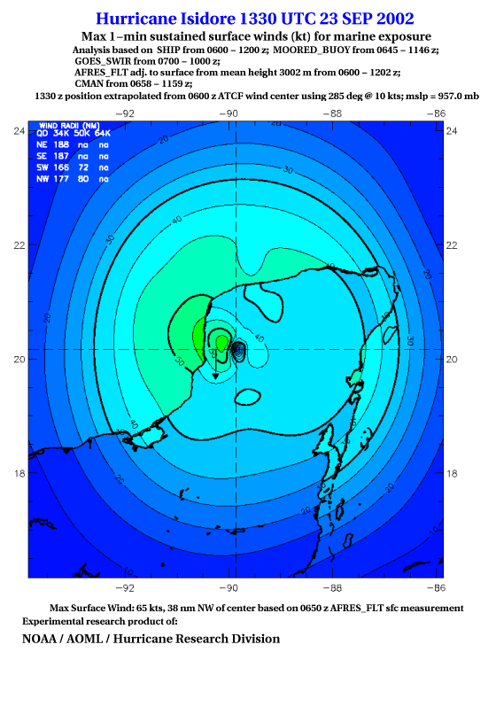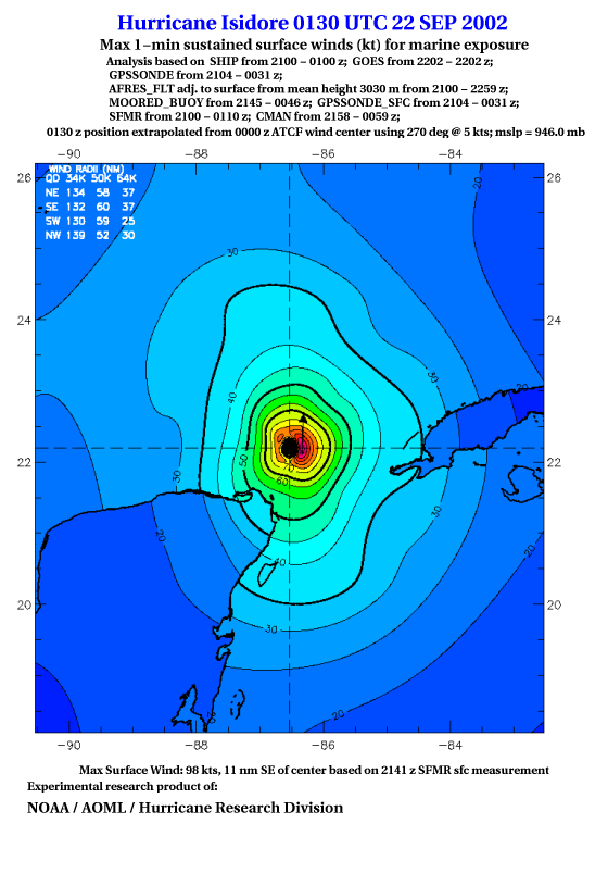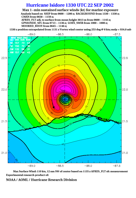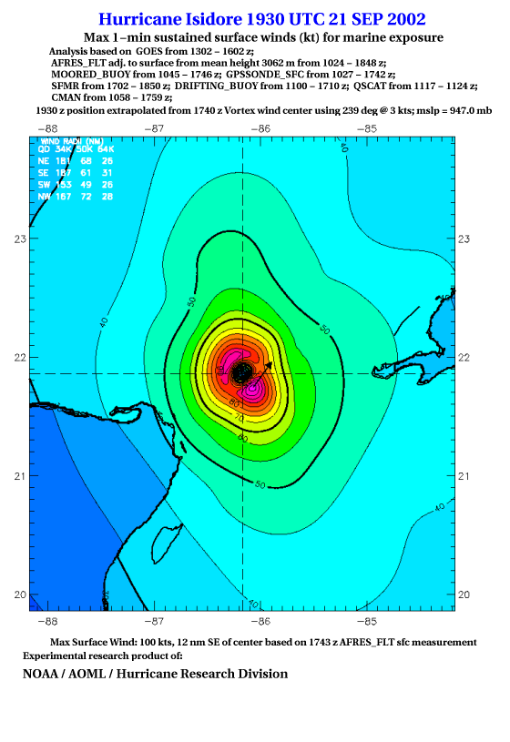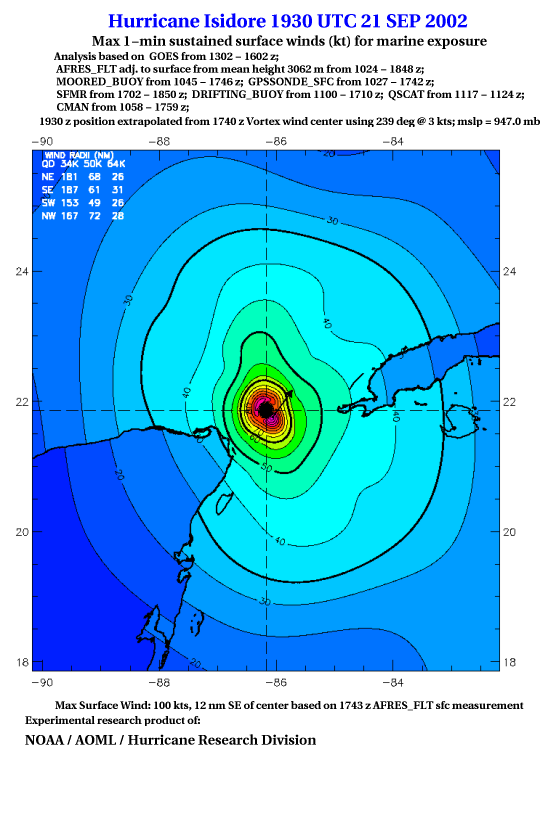 As a public service we are hosting the legacy H*wind archive that was formerly available through NOAA. Most of the archive was conducted in real-time so data collected after the analysis time were not available. Methods used to conduct the analyses evolved over the years. Grid spacing is on the order of 6 km and maximum domain size varies but is typically 8 x 8 degrees. There are known errors in some of the data coverage, mapping, and gridded products. For more information on the archive please go here. For realtime and post storm analysis of the 2014 season and a revised historical archive go here.
