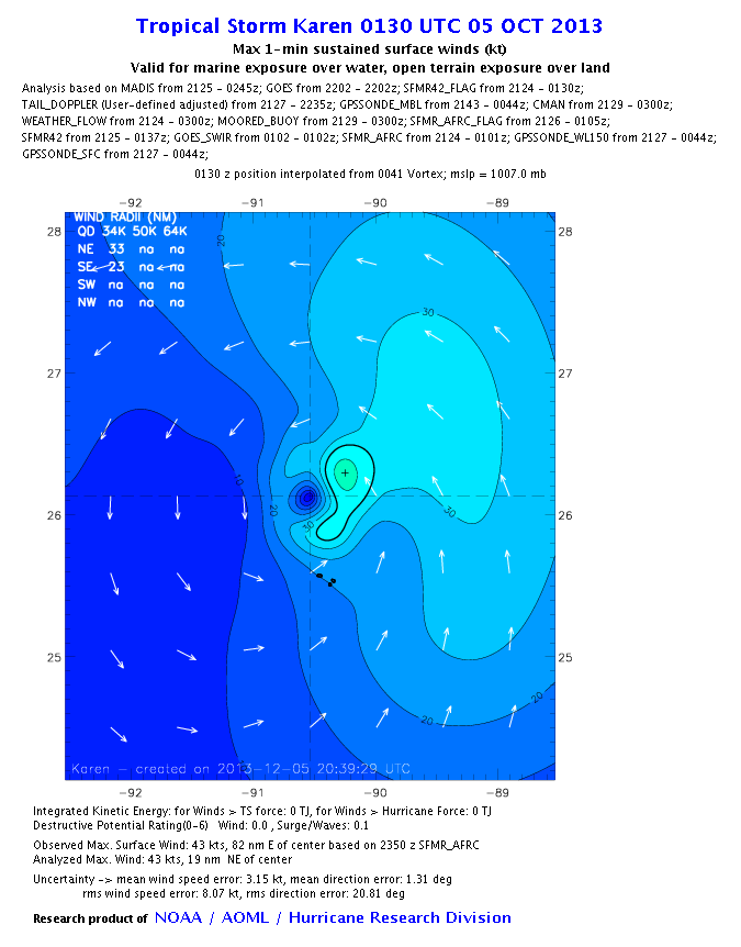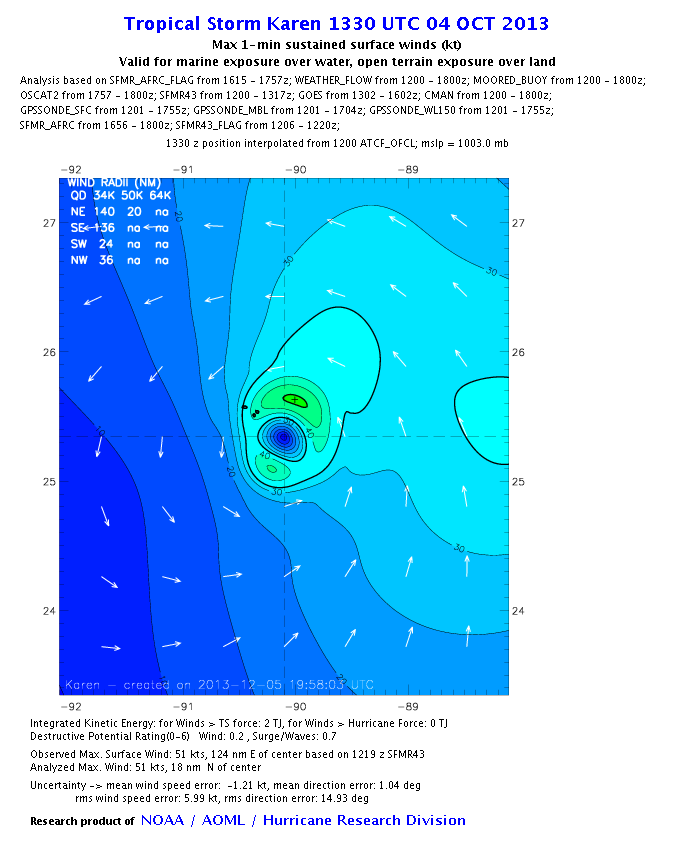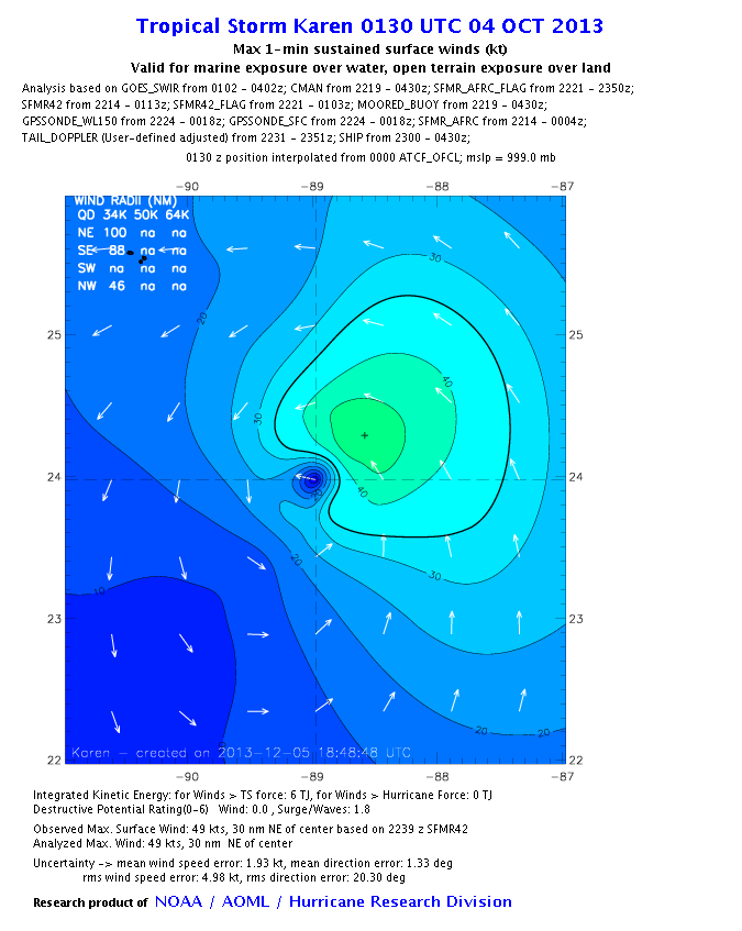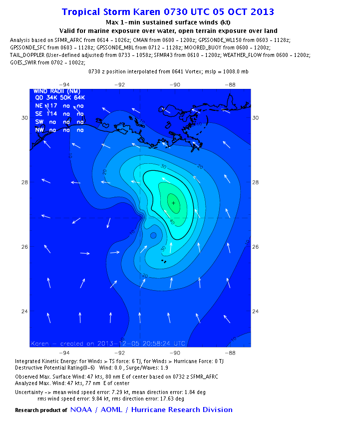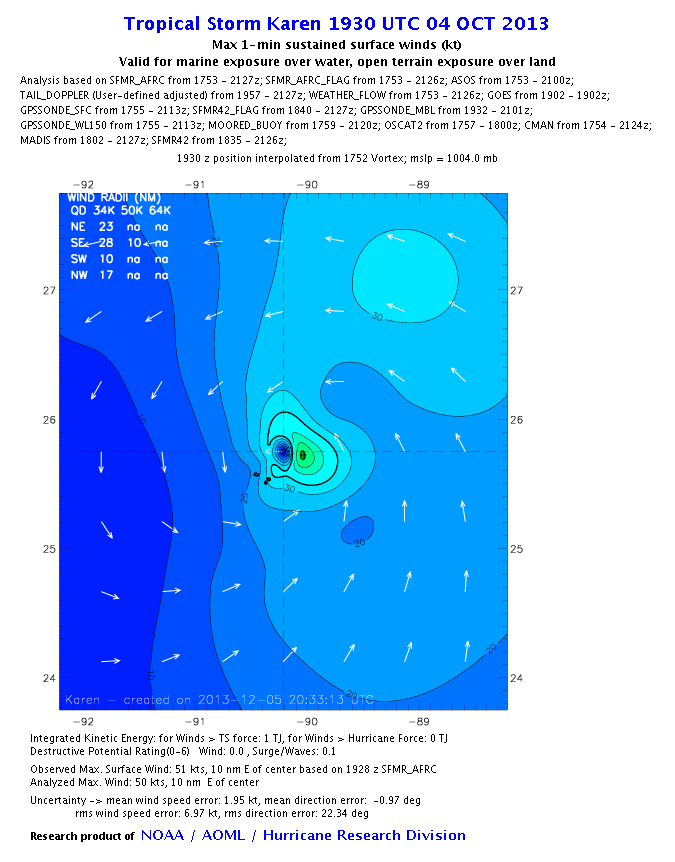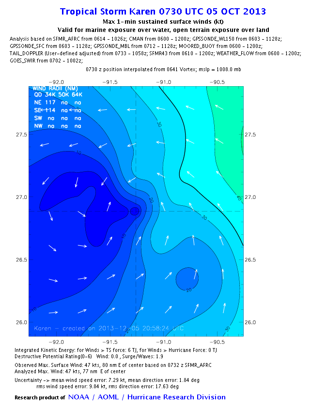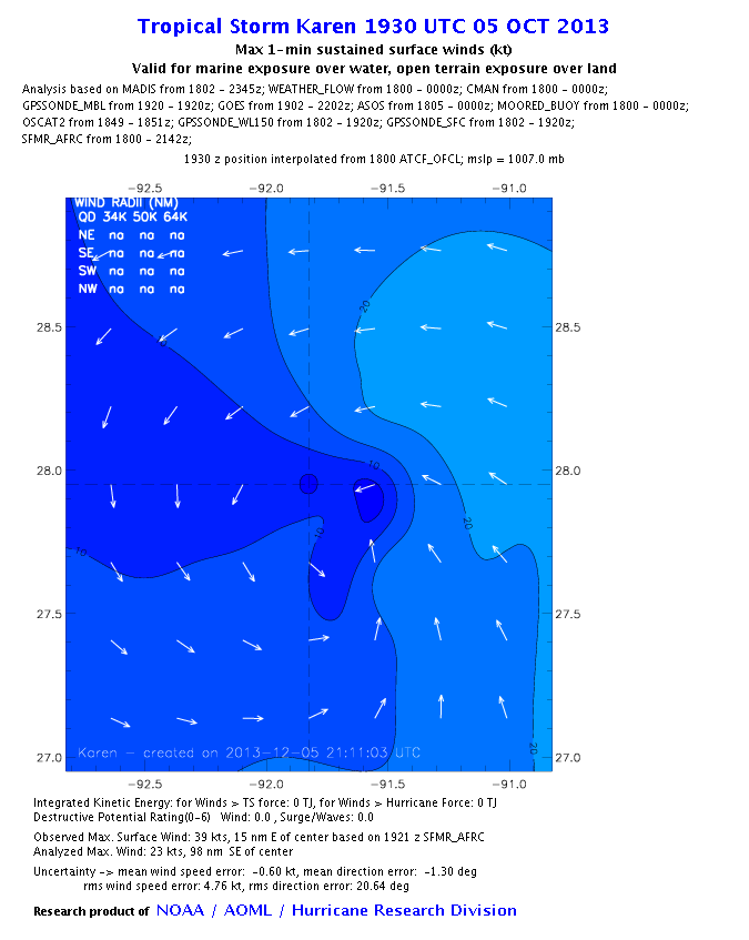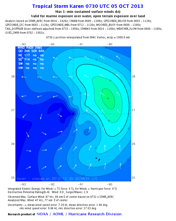 As a public service we are hosting the legacy H*wind archive that was formerly available through NOAA. Most of the archive was conducted in real-time so data collected after the analysis time were not available. Methods used to conduct the analyses evolved over the years. Grid spacing is on the order of 6 km and maximum domain size varies but is typically 8 x 8 degrees. There are known errors in some of the data coverage, mapping, and gridded products. For more information on the archive please go here. For realtime and post storm analysis of the 2014 season and a revised historical archive go here.