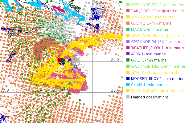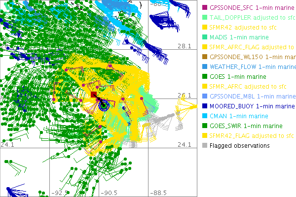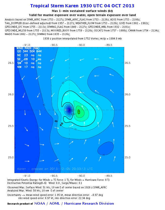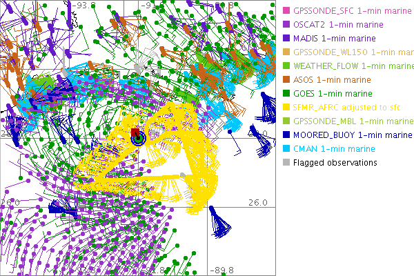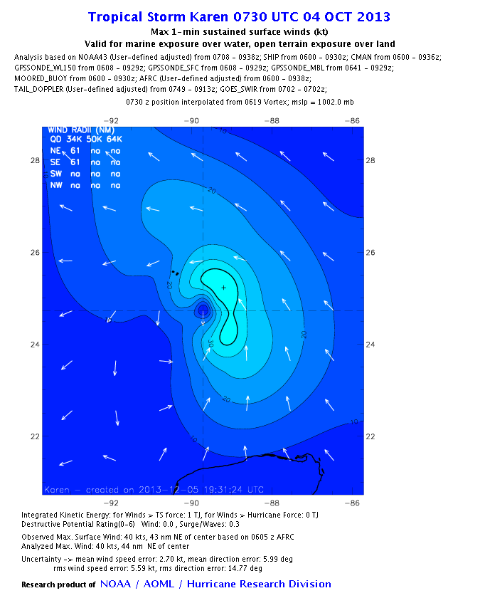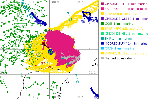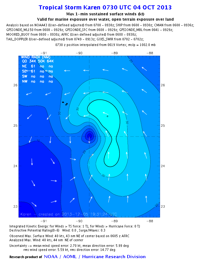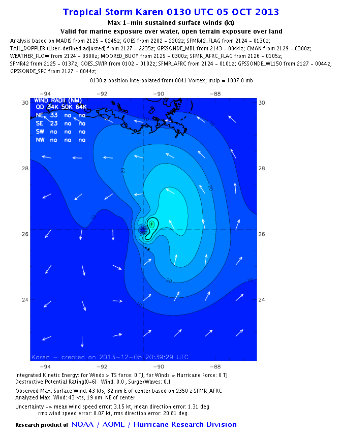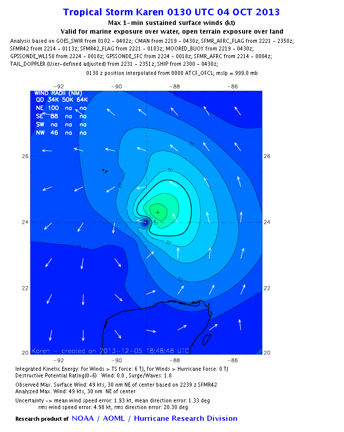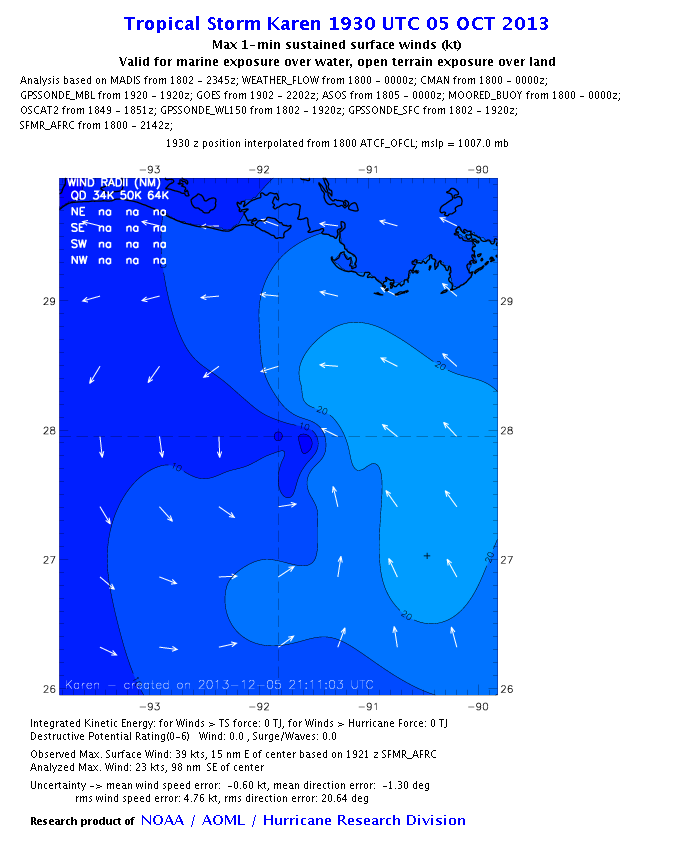 As a public service we are hosting the legacy H*wind archive that was formerly available through NOAA. Most of the archive was conducted in real-time so data collected after the analysis time were not available. Methods used to conduct the analyses evolved over the years. Grid spacing is on the order of 6 km and maximum domain size varies but is typically 8 x 8 degrees. There are known errors in some of the data coverage, mapping, and gridded products. For more information on the archive please go here. For realtime and post storm analysis of the 2014 season and a revised historical archive go here.