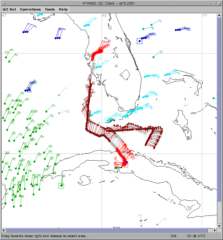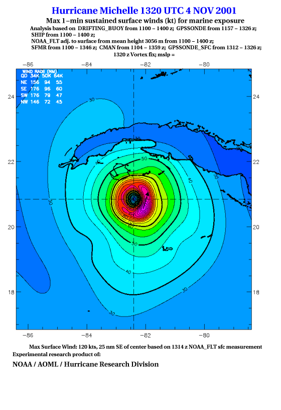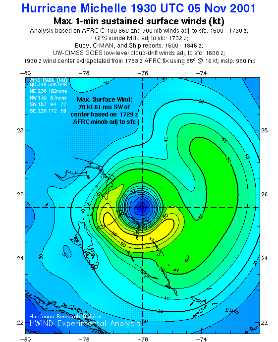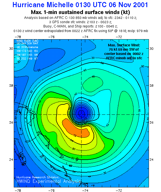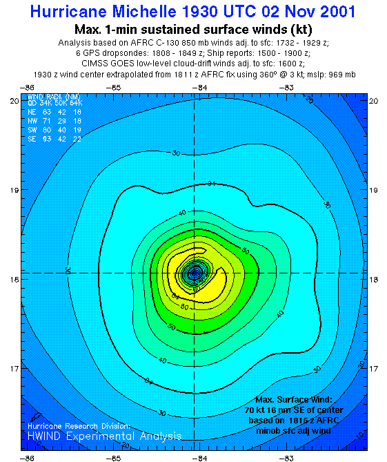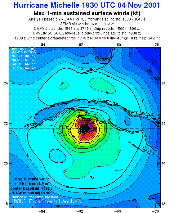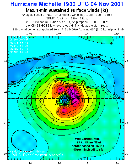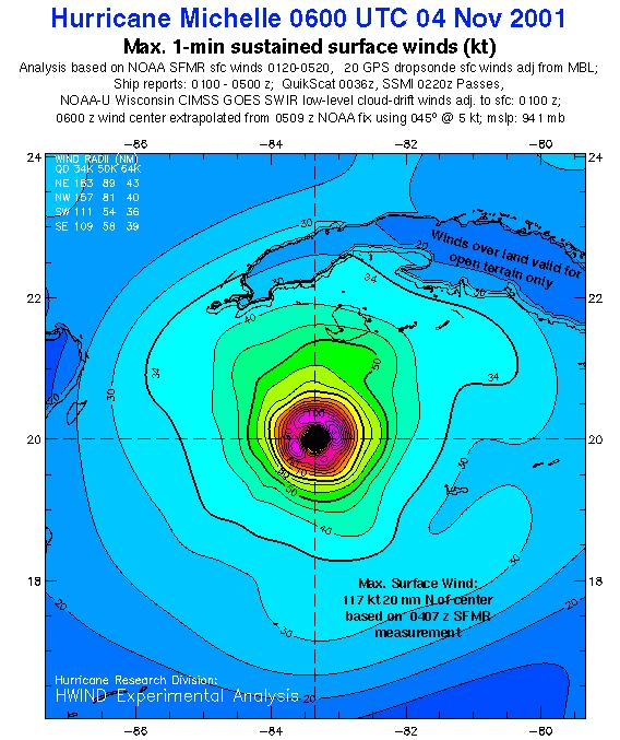 As a public service we are hosting the legacy H*wind archive that was formerly available through NOAA. Most of the archive was conducted in real-time so data collected after the analysis time were not available. Methods used to conduct the analyses evolved over the years. Grid spacing is on the order of 6 km and maximum domain size varies but is typically 8 x 8 degrees. There are known errors in some of the data coverage, mapping, and gridded products. For more information on the archive please go here. For realtime and post storm analysis of the 2014 season and a revised historical archive go here.