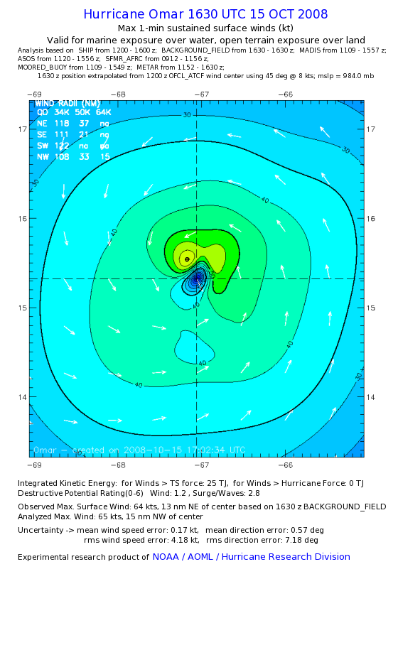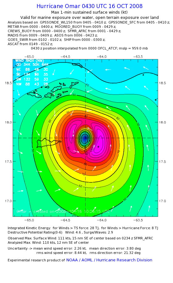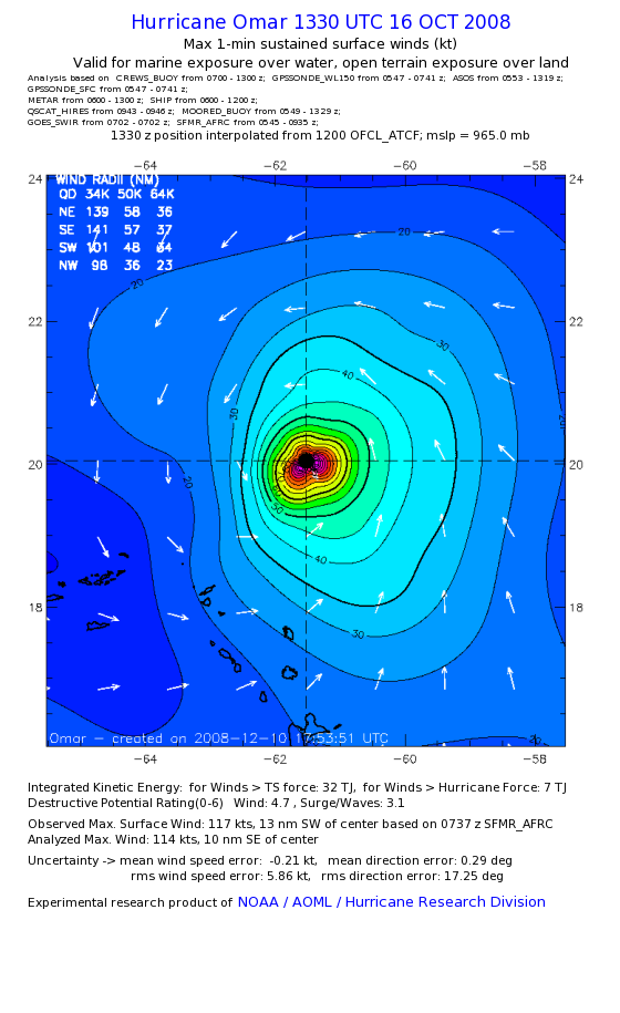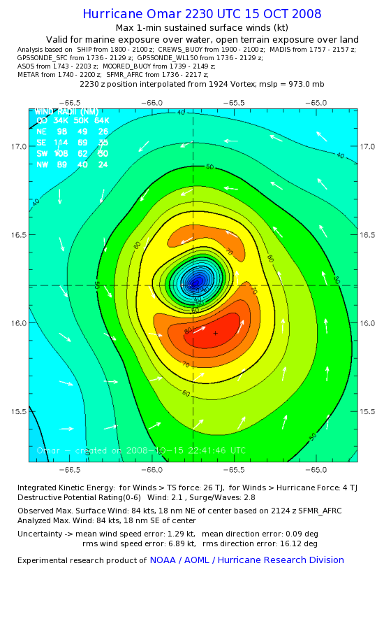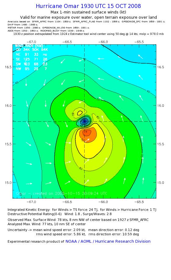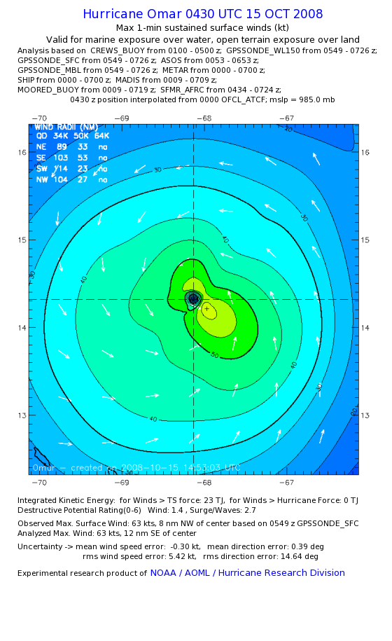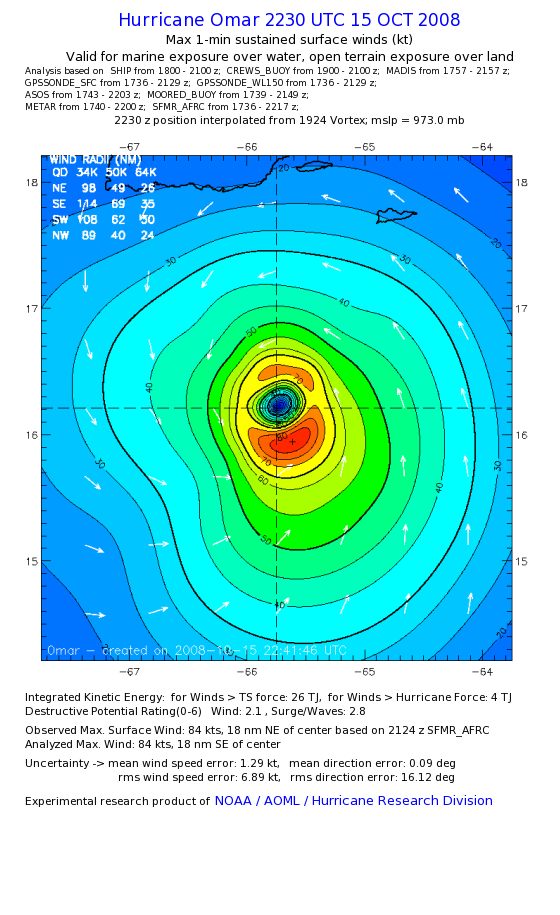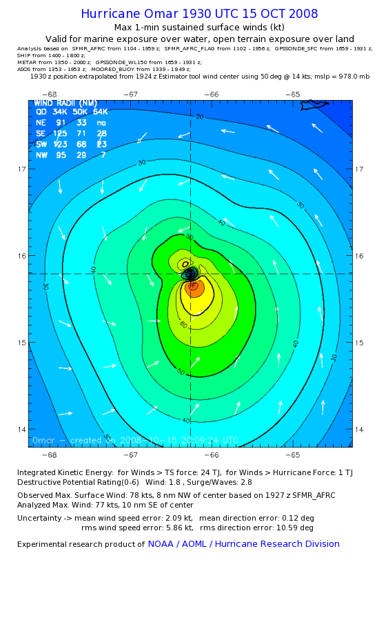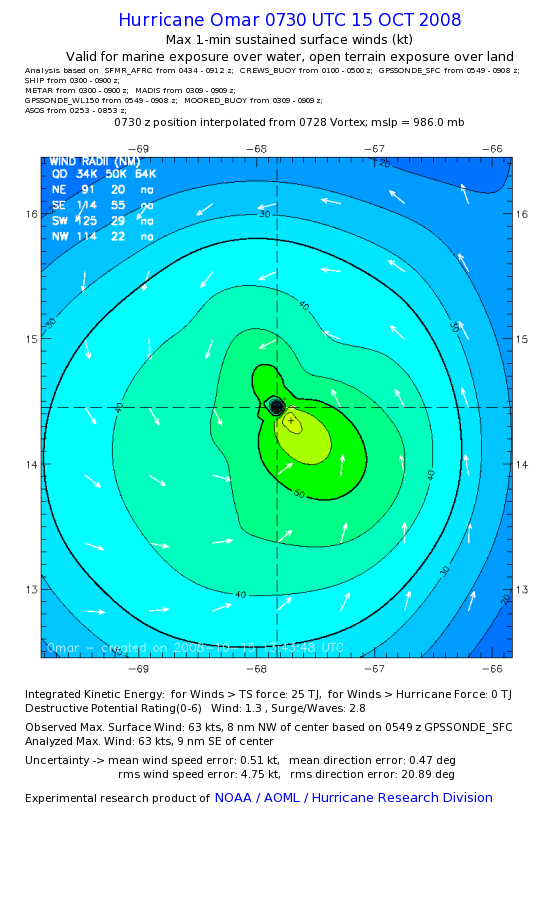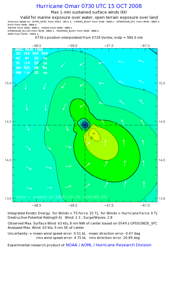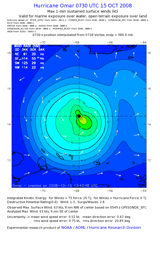 | The following maximum sustained wind swaths for Omar are preliminary results and will be subject to further modifications as new data become available. | |||||||||||