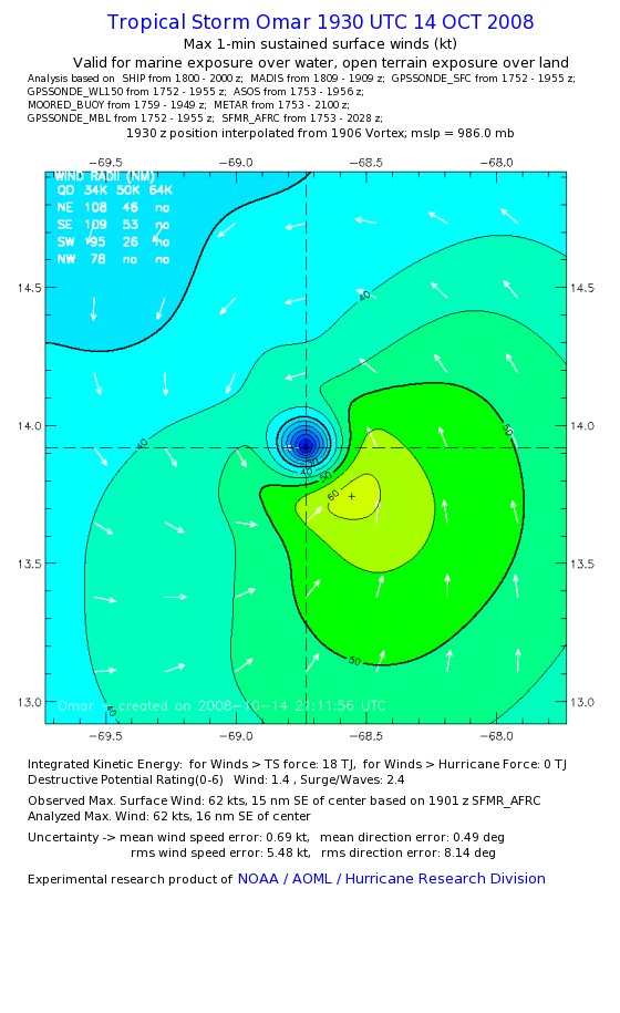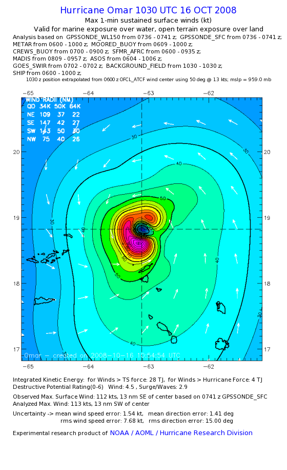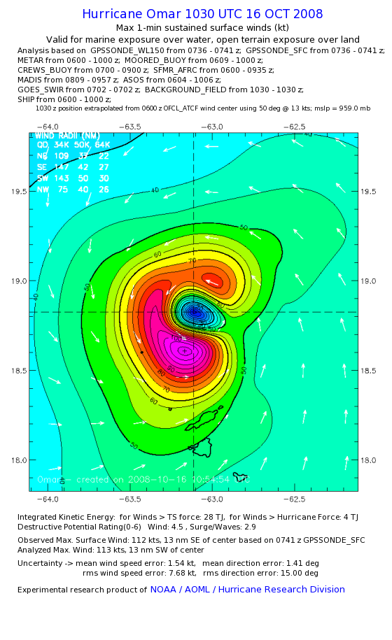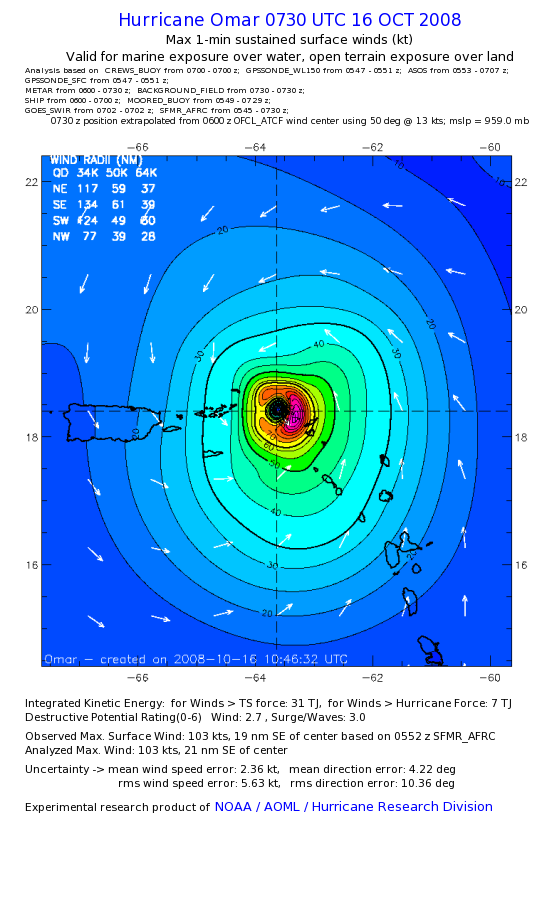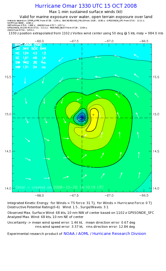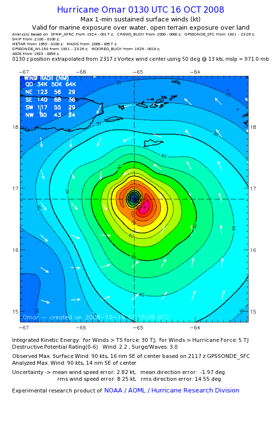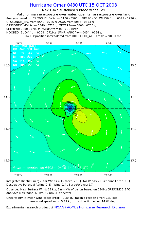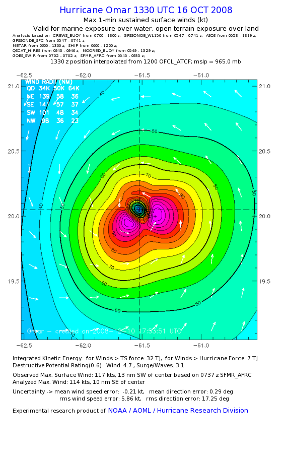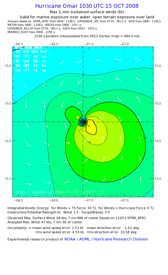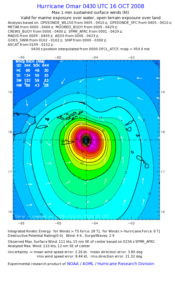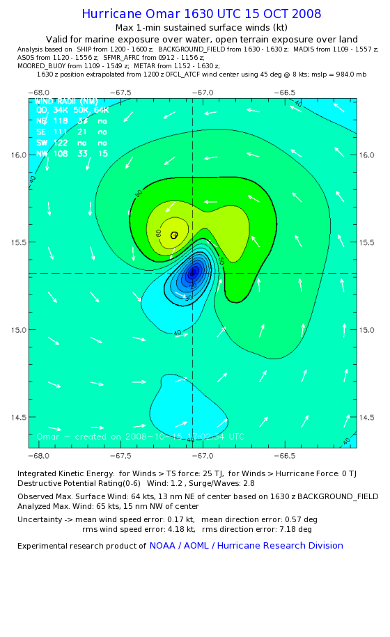 | The following maximum sustained wind swaths for Omar are preliminary results and will be subject to further modifications as new data become available. | |||||||||||