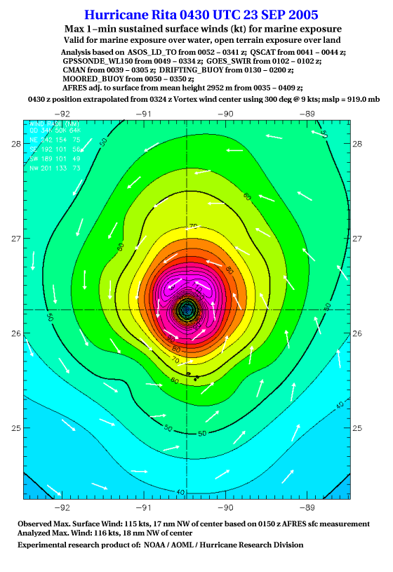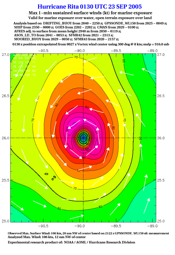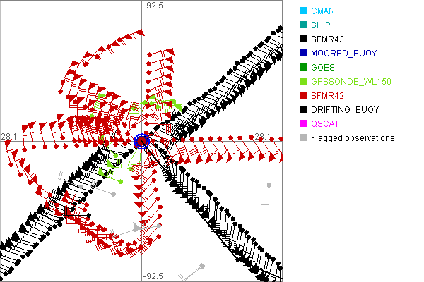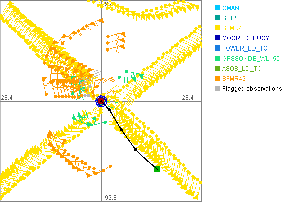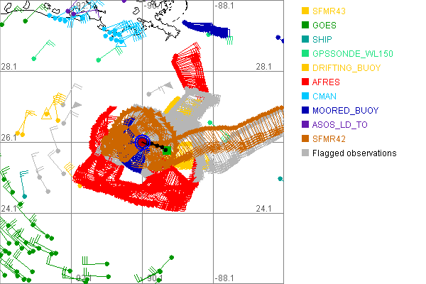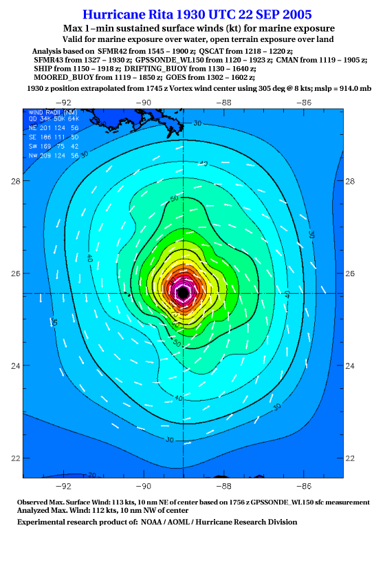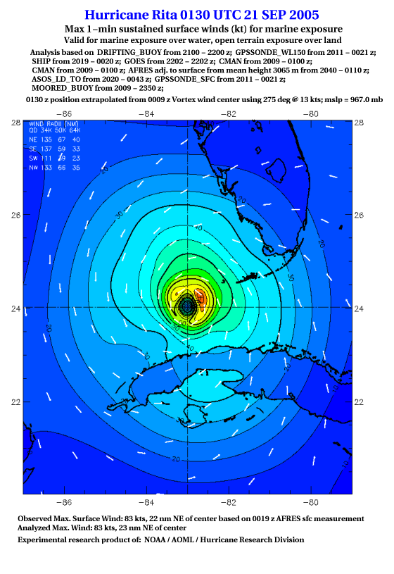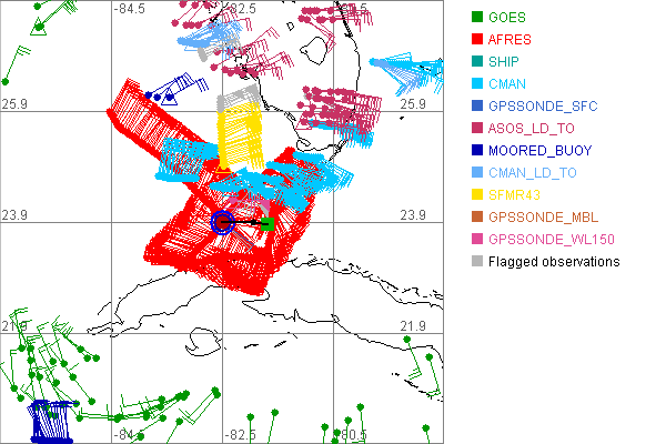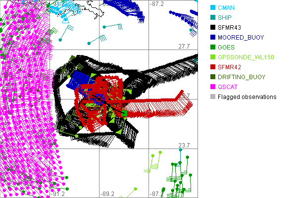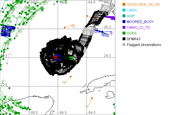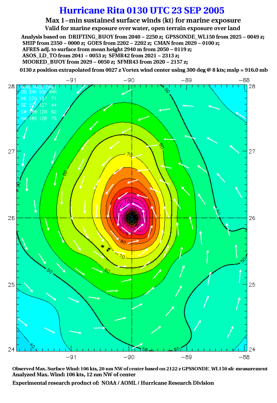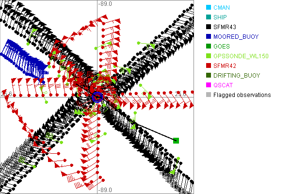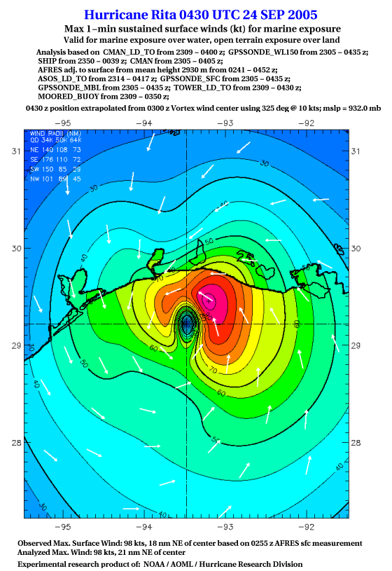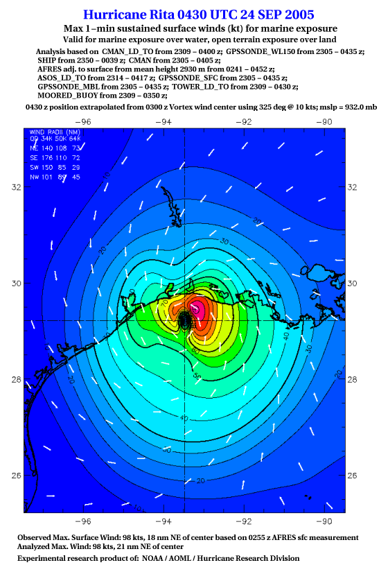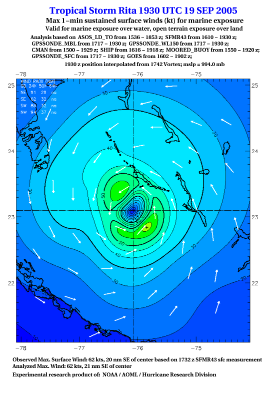 As a public service we are hosting the legacy H*wind archive that was formerly available through NOAA. Most of the archive was conducted in real-time so data collected after the analysis time were not available. Methods used to conduct the analyses evolved over the years. Grid spacing is on the order of 6 km and maximum domain size varies but is typically 8 x 8 degrees. There are known errors in some of the data coverage, mapping, and gridded products. For more information on the archive please go here. For realtime and post storm analysis of the 2014 season and a revised historical archive go here. |
