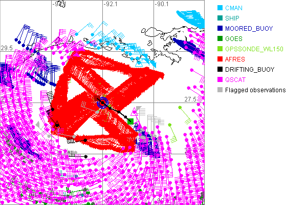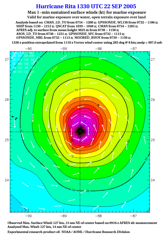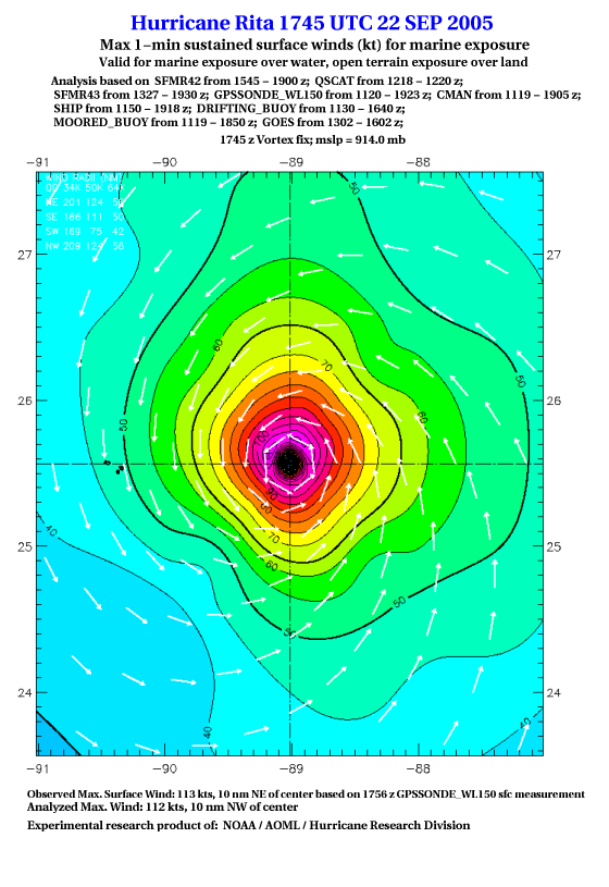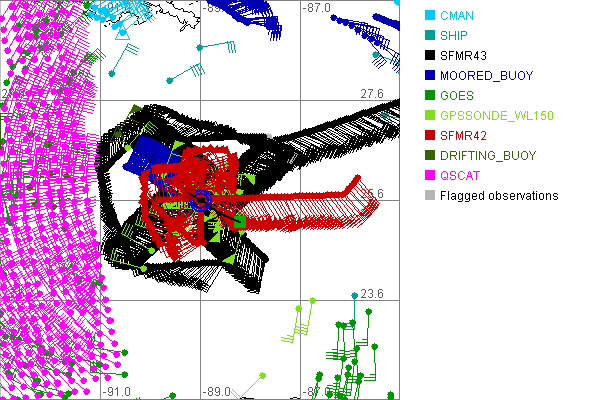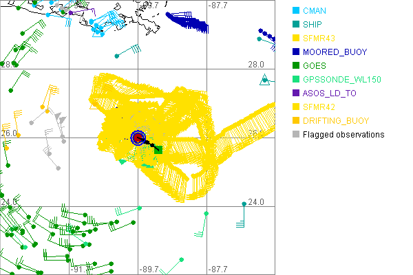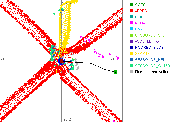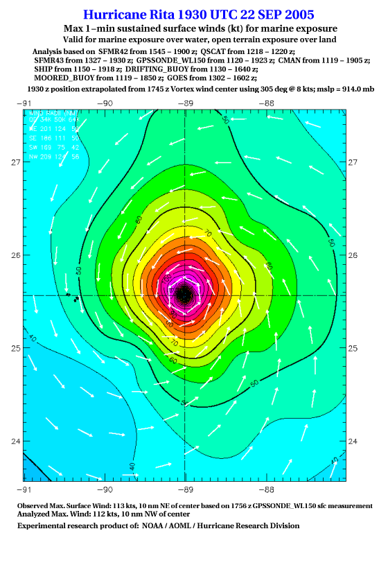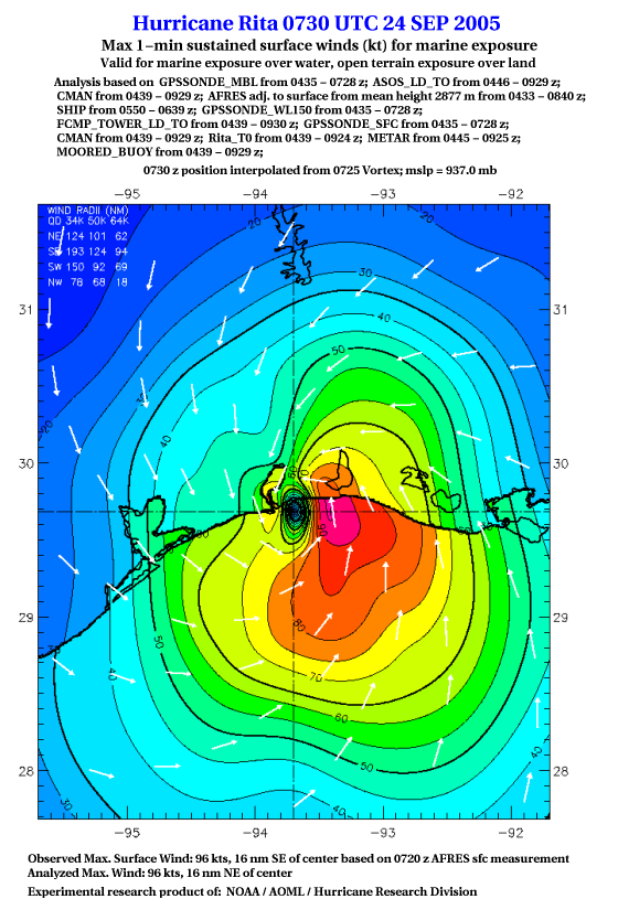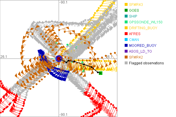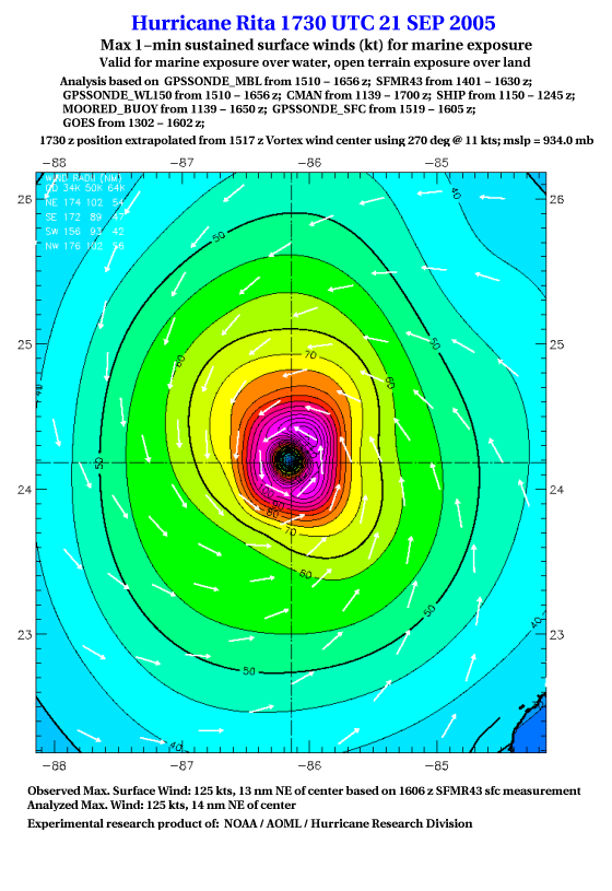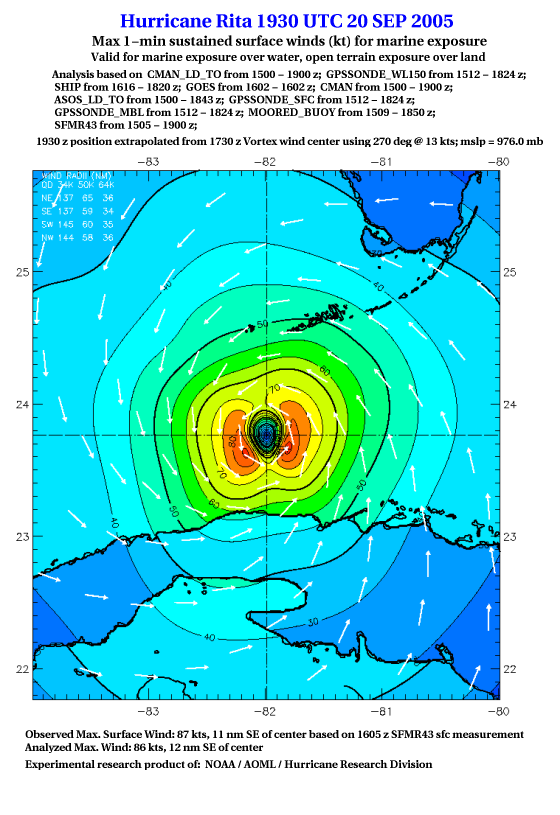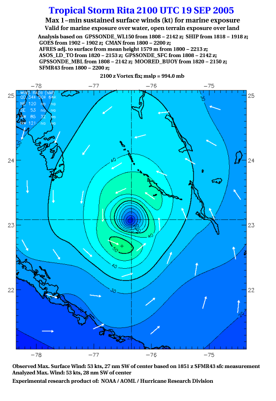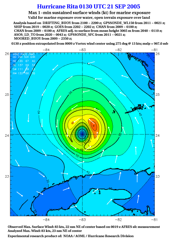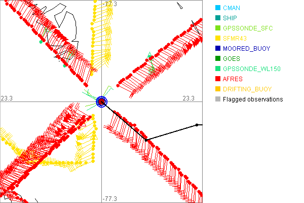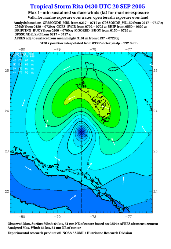 As a public service we are hosting the legacy H*wind archive that was formerly available through NOAA. Most of the archive was conducted in real-time so data collected after the analysis time were not available. Methods used to conduct the analyses evolved over the years. Grid spacing is on the order of 6 km and maximum domain size varies but is typically 8 x 8 degrees. There are known errors in some of the data coverage, mapping, and gridded products. For more information on the archive please go here. For realtime and post storm analysis of the 2014 season and a revised historical archive go here. |