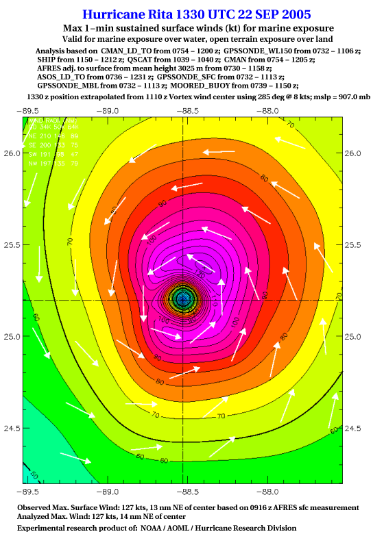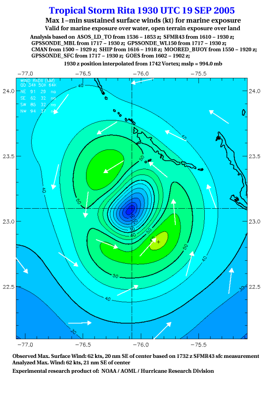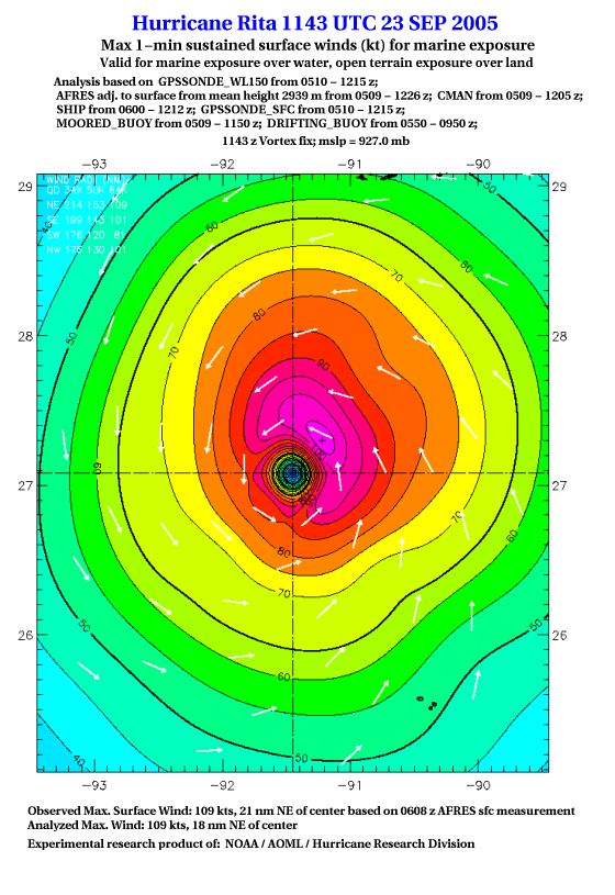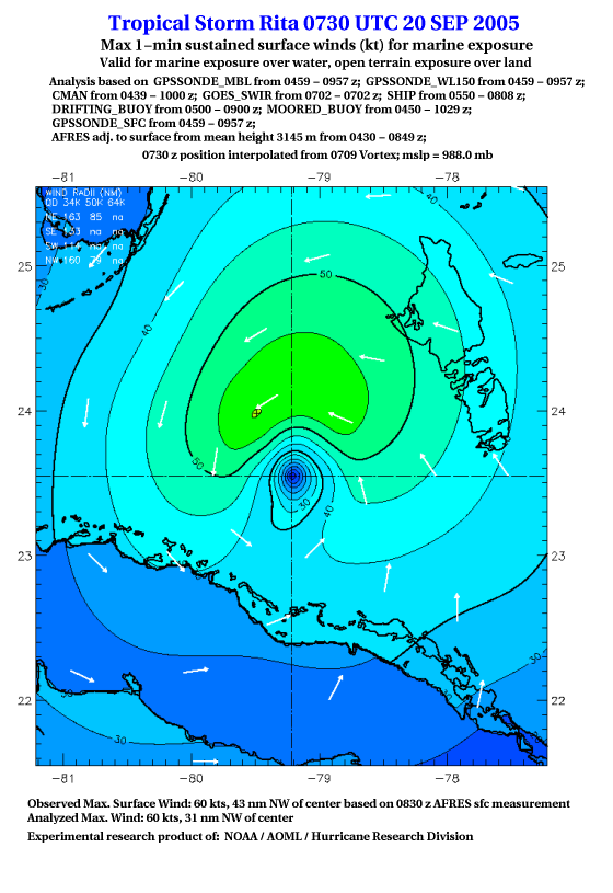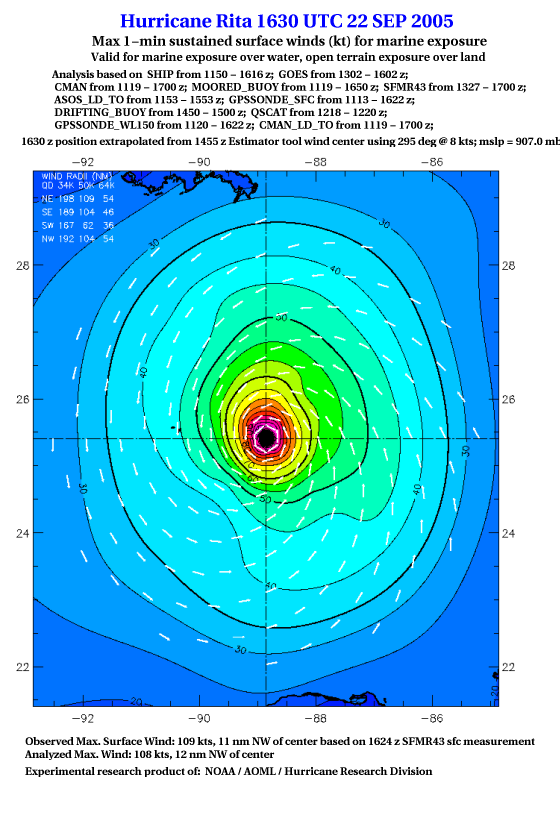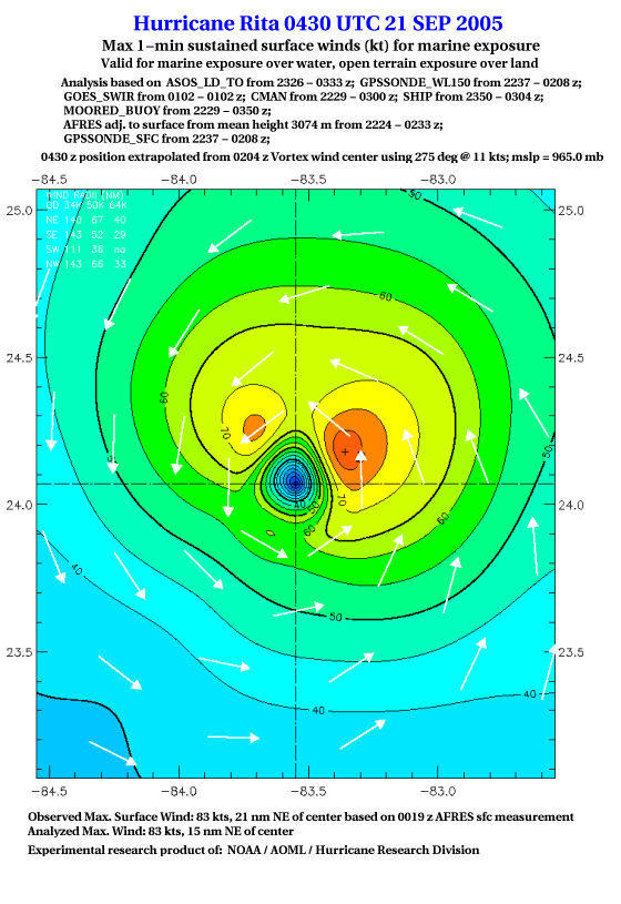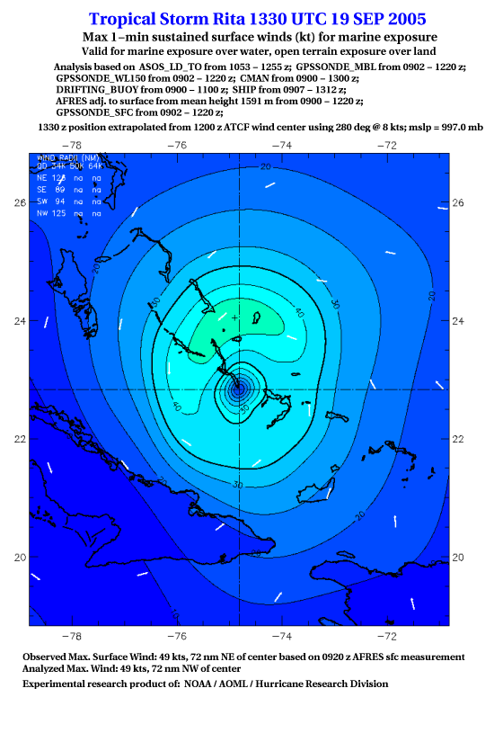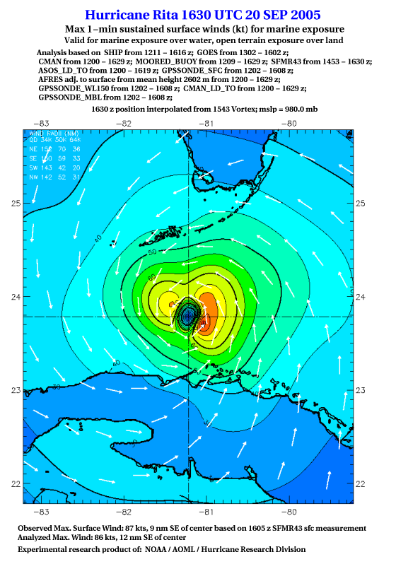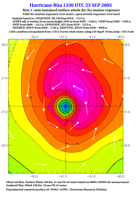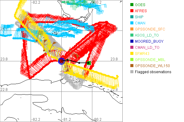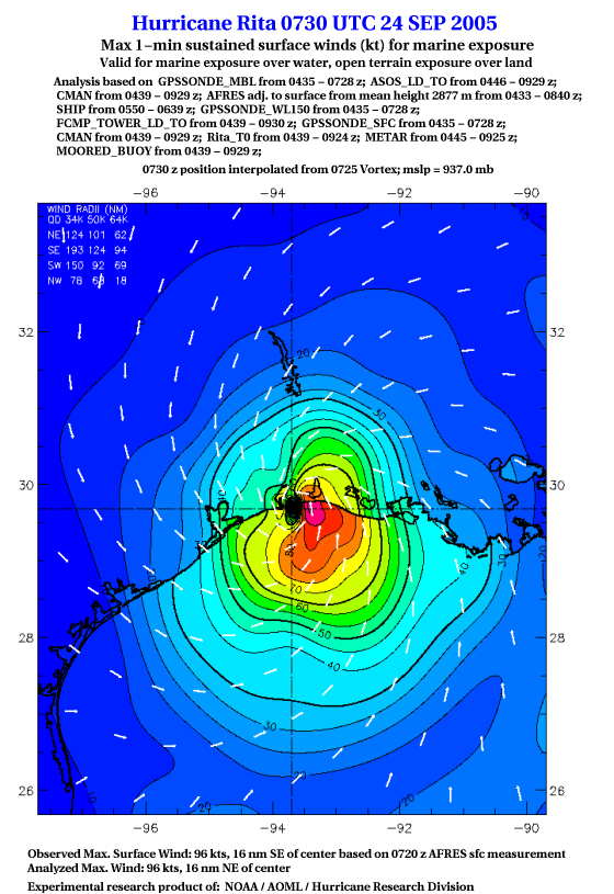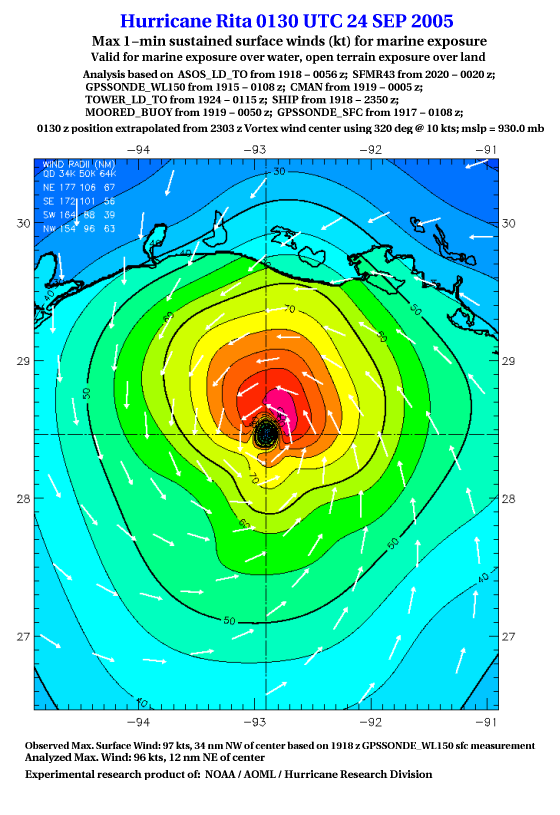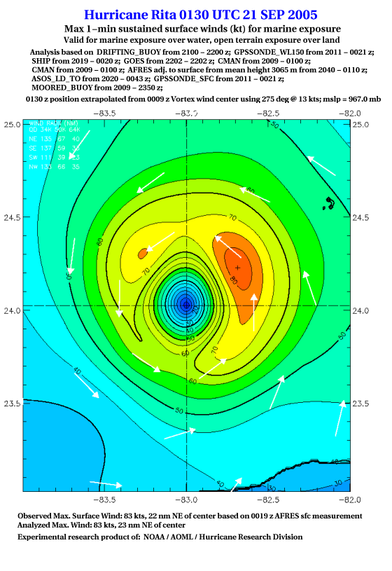 As a public service we are hosting the legacy H*wind archive that was formerly available through NOAA. Most of the archive was conducted in real-time so data collected after the analysis time were not available. Methods used to conduct the analyses evolved over the years. Grid spacing is on the order of 6 km and maximum domain size varies but is typically 8 x 8 degrees. There are known errors in some of the data coverage, mapping, and gridded products. For more information on the archive please go here. For realtime and post storm analysis of the 2014 season and a revised historical archive go here. |