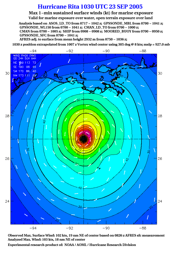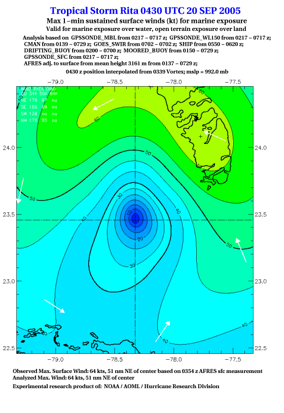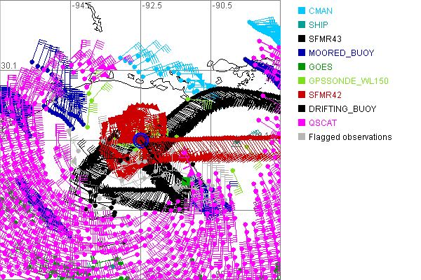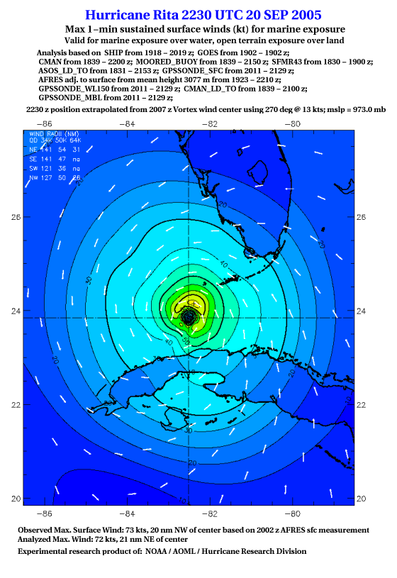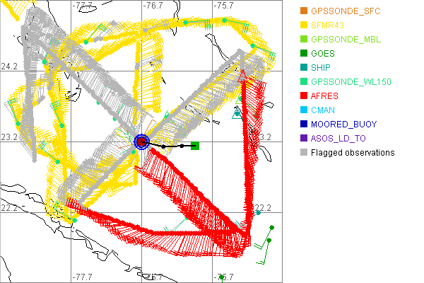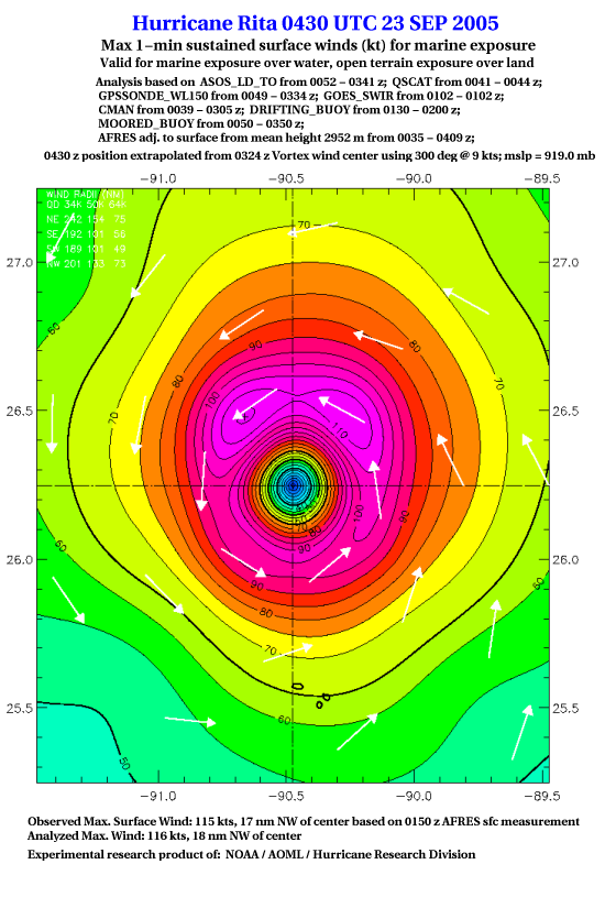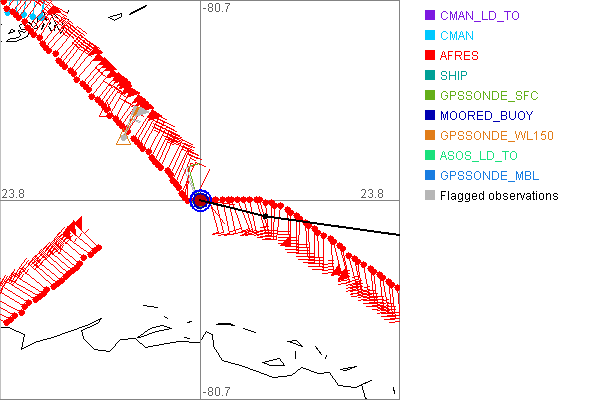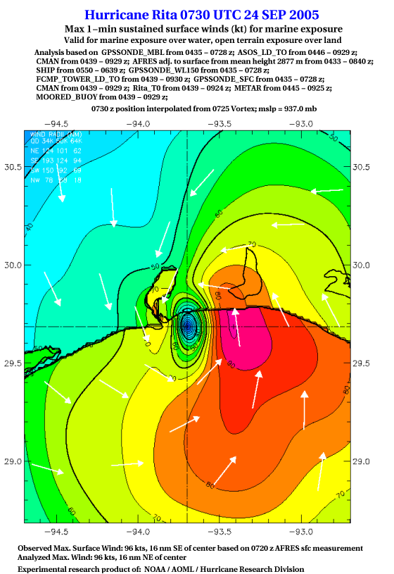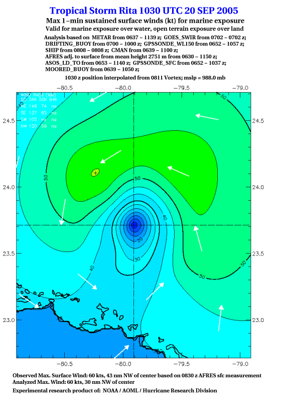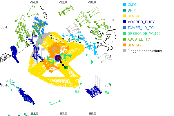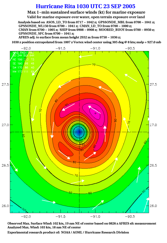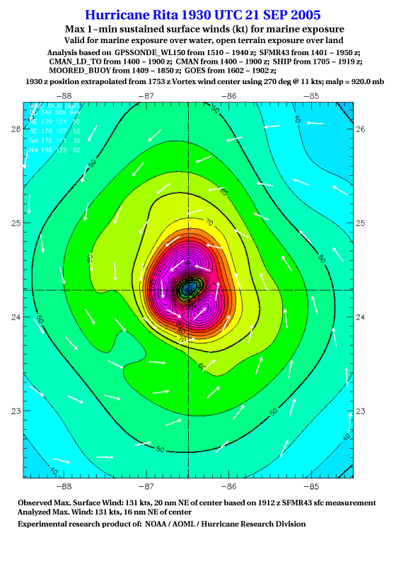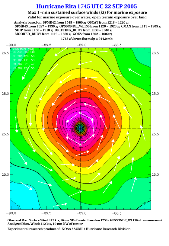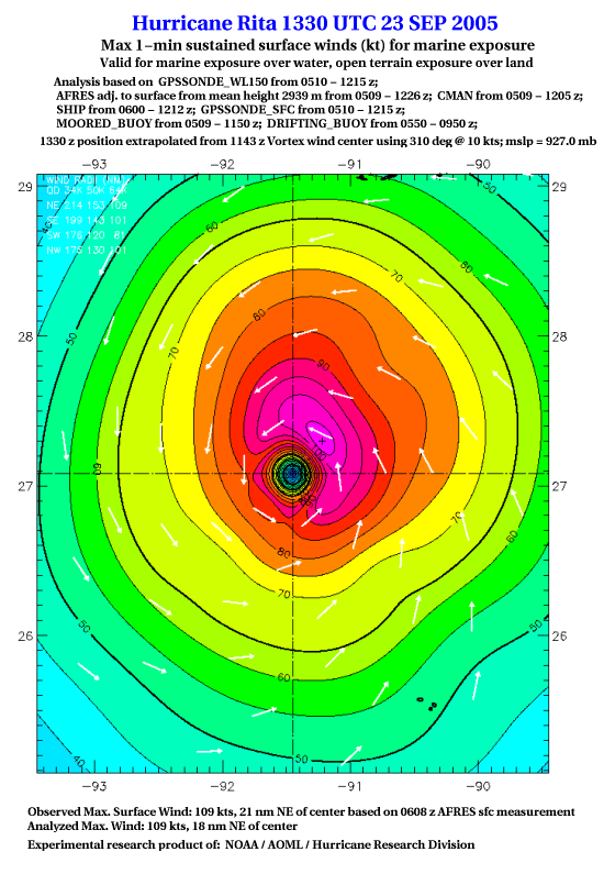 As a public service we are hosting the legacy H*wind archive that was formerly available through NOAA. Most of the archive was conducted in real-time so data collected after the analysis time were not available. Methods used to conduct the analyses evolved over the years. Grid spacing is on the order of 6 km and maximum domain size varies but is typically 8 x 8 degrees. There are known errors in some of the data coverage, mapping, and gridded products. For more information on the archive please go here. For realtime and post storm analysis of the 2014 season and a revised historical archive go here. |