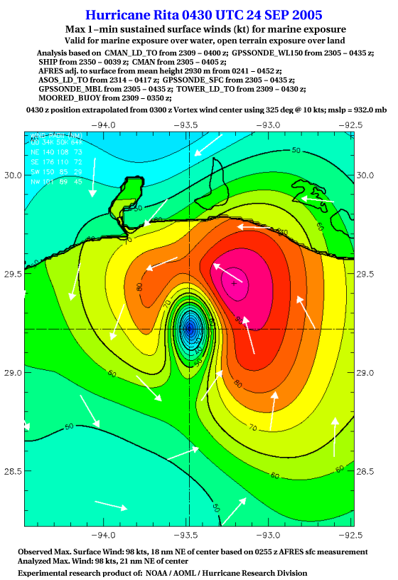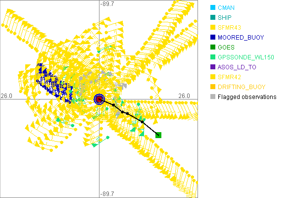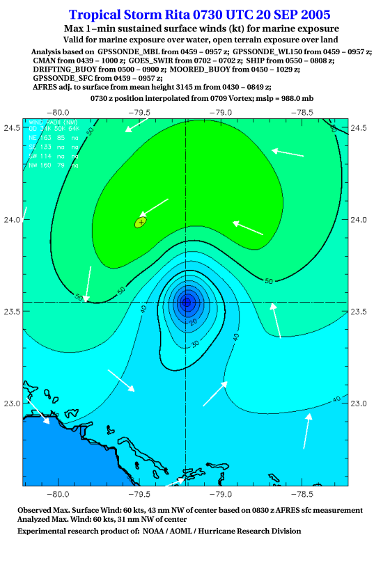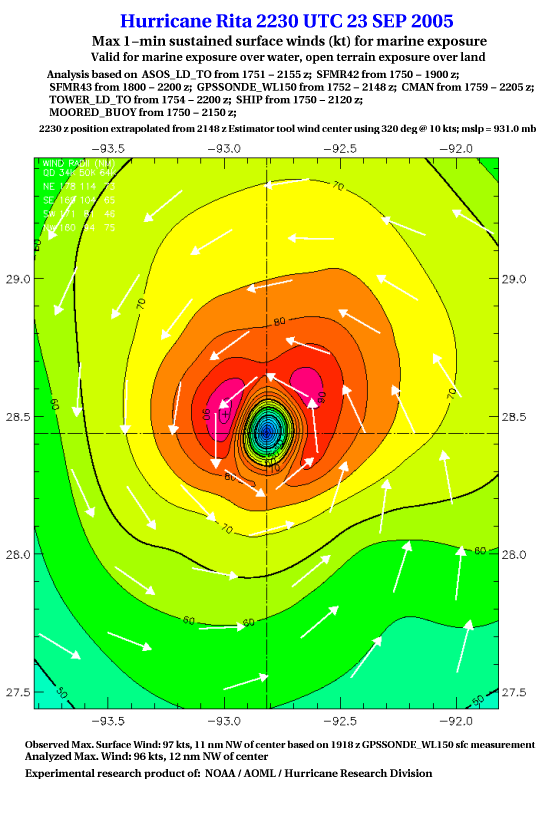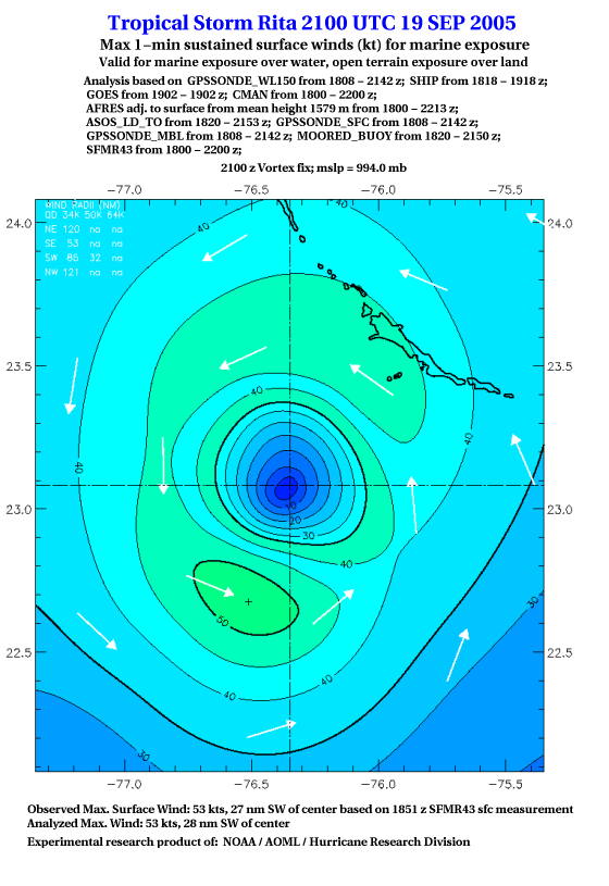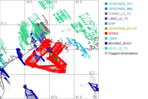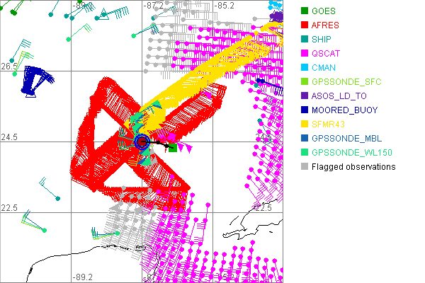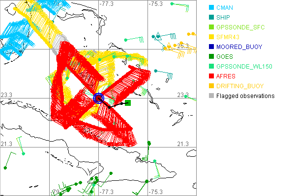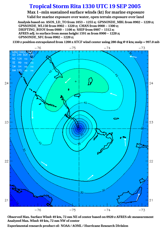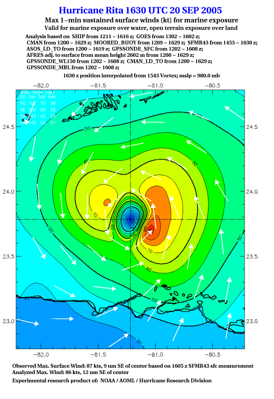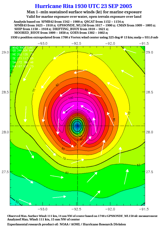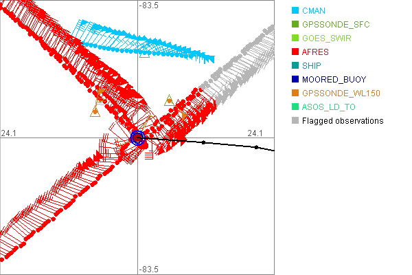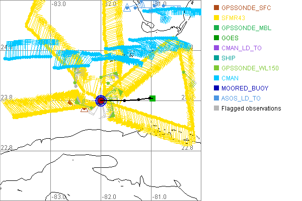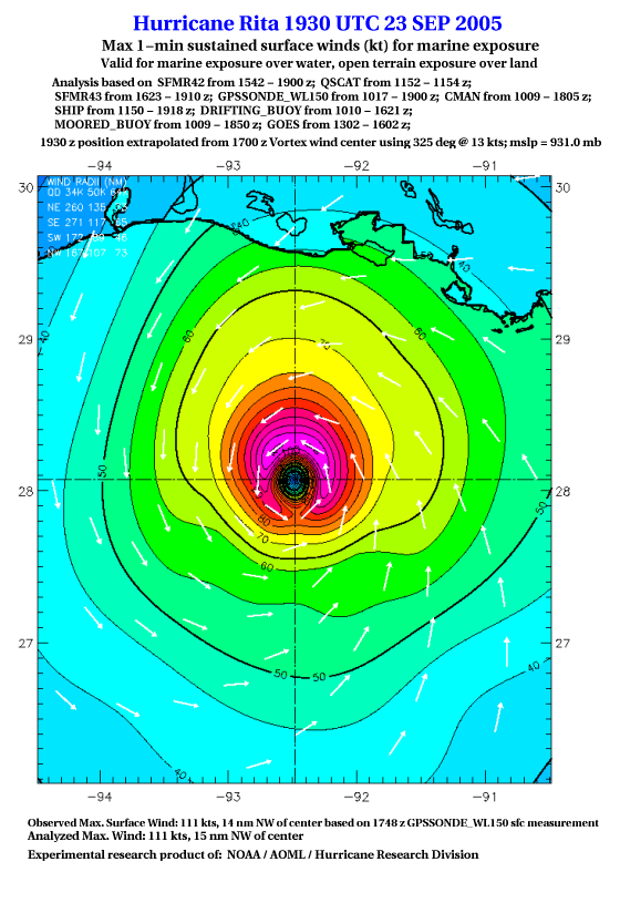 As a public service we are hosting the legacy H*wind archive that was formerly available through NOAA. Most of the archive was conducted in real-time so data collected after the analysis time were not available. Methods used to conduct the analyses evolved over the years. Grid spacing is on the order of 6 km and maximum domain size varies but is typically 8 x 8 degrees. There are known errors in some of the data coverage, mapping, and gridded products. For more information on the archive please go here. For realtime and post storm analysis of the 2014 season and a revised historical archive go here. |