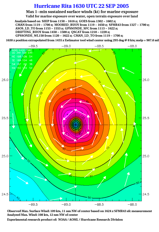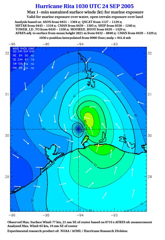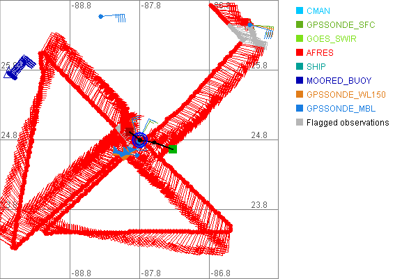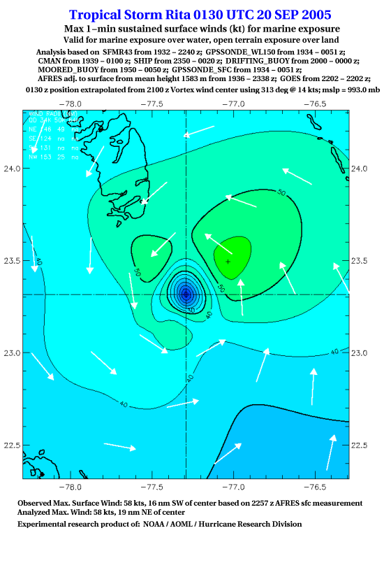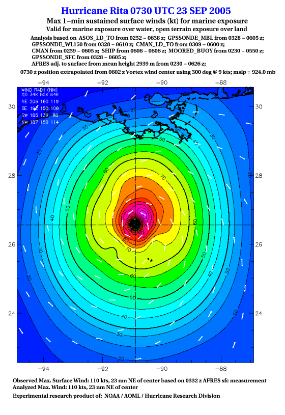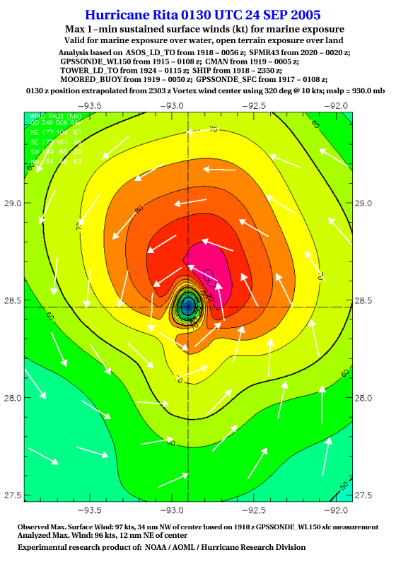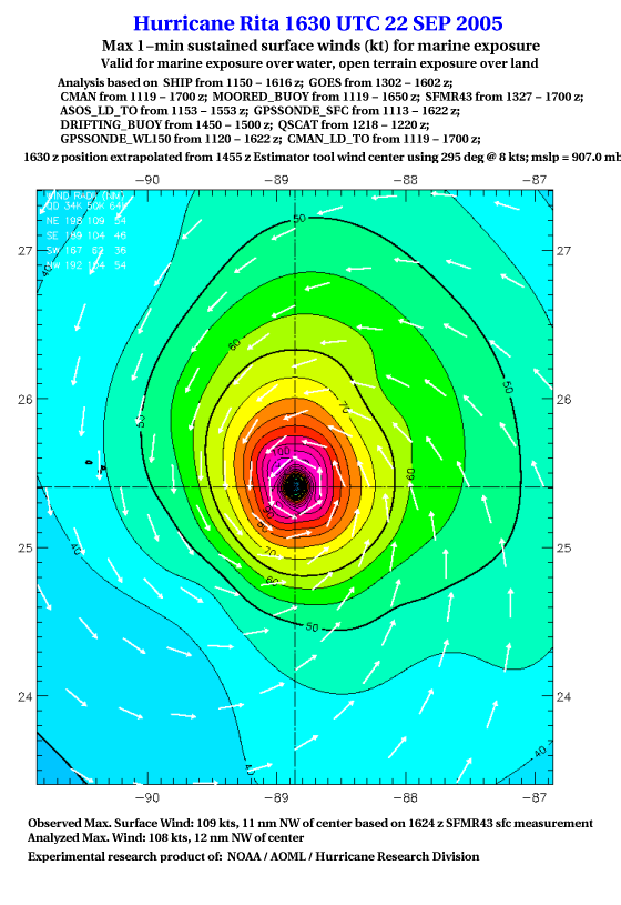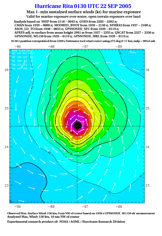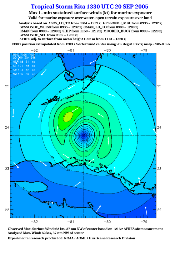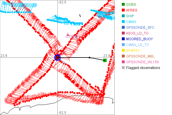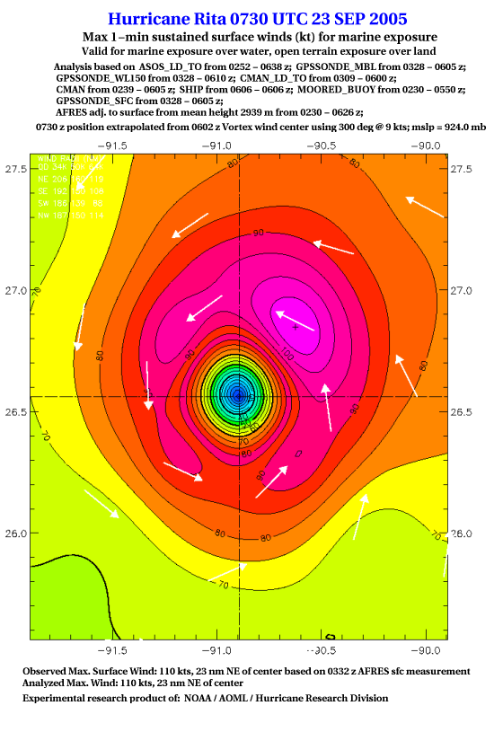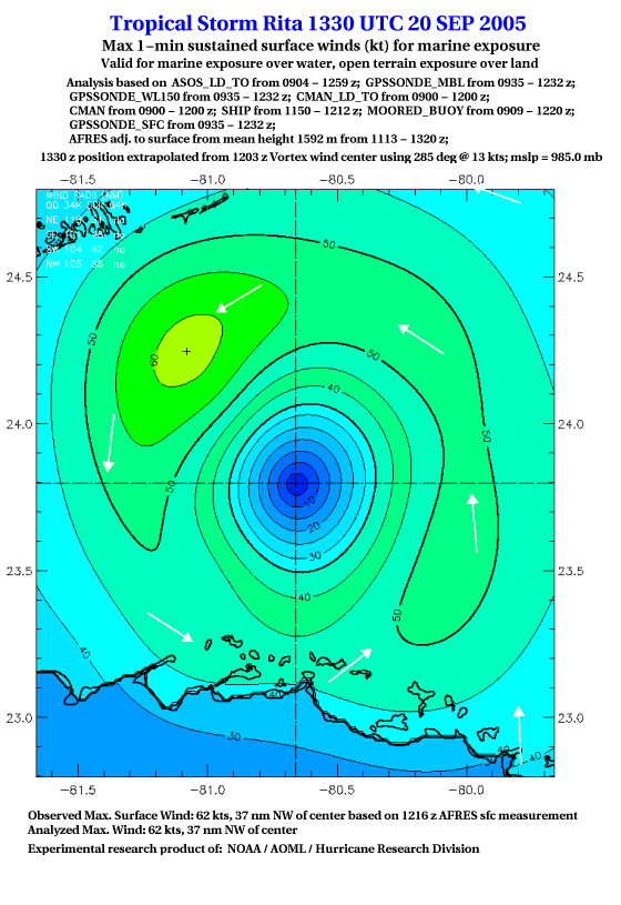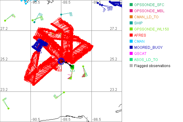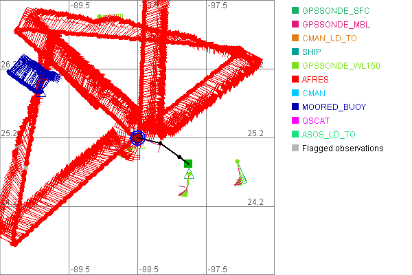 As a public service we are hosting the legacy H*wind archive that was formerly available through NOAA. Most of the archive was conducted in real-time so data collected after the analysis time were not available. Methods used to conduct the analyses evolved over the years. Grid spacing is on the order of 6 km and maximum domain size varies but is typically 8 x 8 degrees. There are known errors in some of the data coverage, mapping, and gridded products. For more information on the archive please go here. For realtime and post storm analysis of the 2014 season and a revised historical archive go here. |