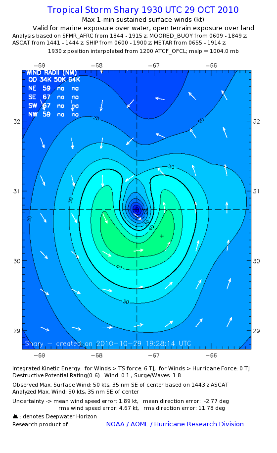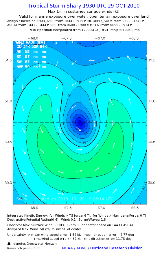 As a public service we are hosting the legacy H*wind archive that was formerly available through NOAA. Most of the archive was conducted in real-time so data collected after the analysis time were not available. Methods used to conduct the analyses evolved over the years. Grid spacing is on the order of 6 km and maximum domain size varies but is typically 8 x 8 degrees. There are known errors in some of the data coverage, mapping, and gridded products. For more information on the archive please go here. For realtime and post storm analysis of the 2014 season and a revised historical archive go here.