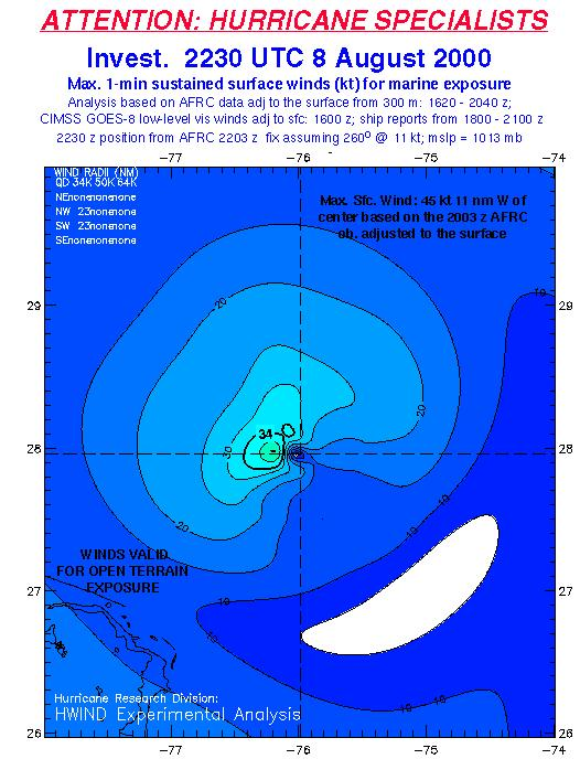 As a public service we are hosting the legacy H*wind archive that was formerly available through NOAA. Most of the archive was conducted in real-time so data collected after the analysis time were not available. Methods used to conduct the analyses evolved over the years. Grid spacing is on the order of 6 km and maximum domain size varies but is typically 8 x 8 degrees. There are known errors in some of the data coverage, mapping, and gridded products. For more information on the archive please go here. For realtime and post storm analysis of the 2014 season and a revised historical archive go here.