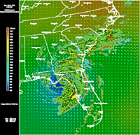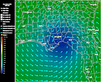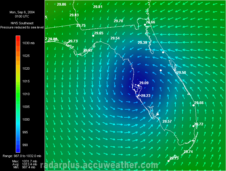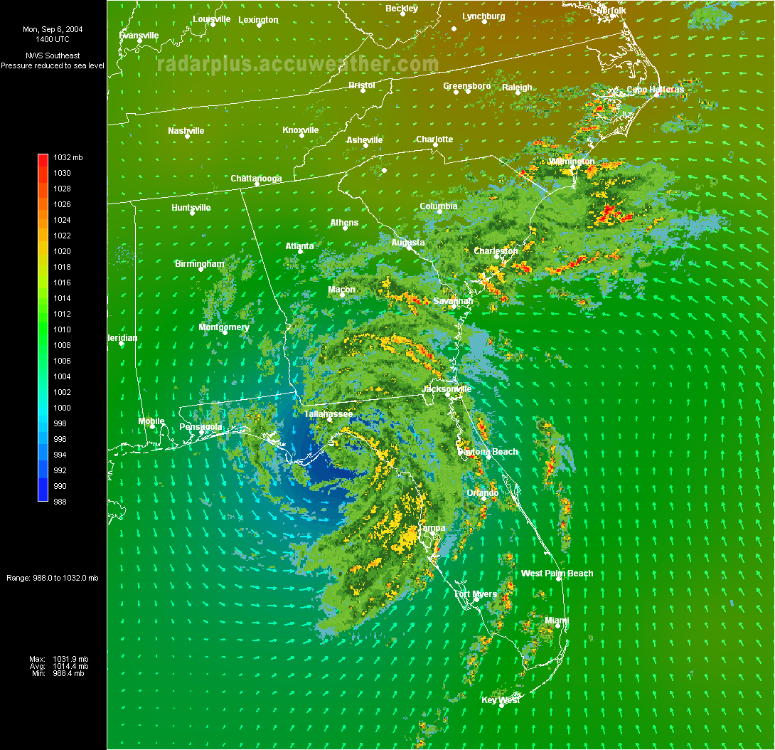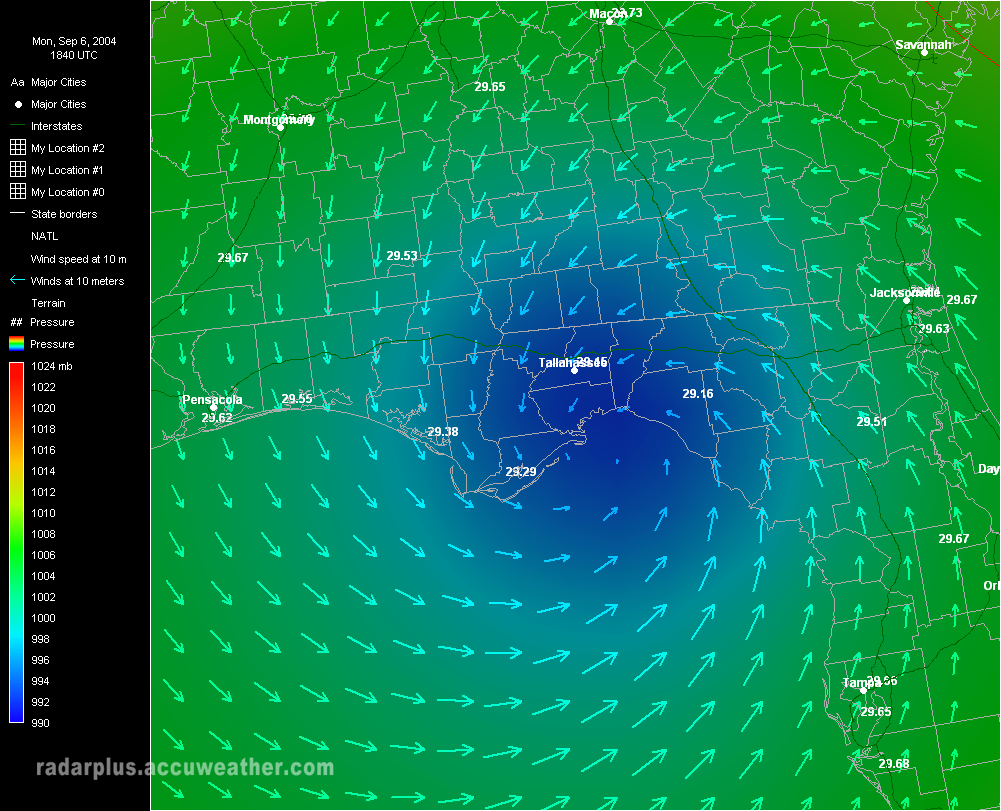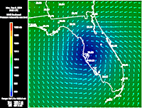 Florida Pressure & Winds - 9:00 PM EDT 9/5 - Hurricane Frances emerges from the Tampa area to move out over the Gulf of Mexico. Arrows indicate wind speed and direction around the area of low pressure, shown as blue on the pressure gradient map.   Tampa Radar - 10:00 AM EDT 9/6 - Hurricane Frances begins to make its second landfall south of Tallahassee, Florida. RadarPlus has now added a radar loop to the pressure gradient and wind arrows shown in the previous image.