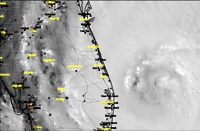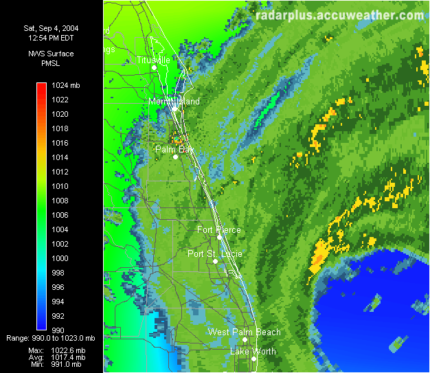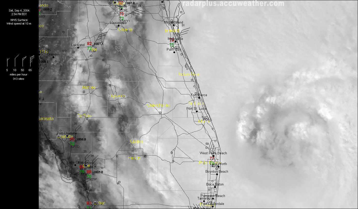 Melbourne Radar, Pressure @ 1:13 PM EDT 9/4 - A closeup shows the huge eye of Frances approaching the east coast of Florida. A color gradient of pressure is shown, with blue representing low pressure.   Melbourne Radar, Visible Satellite @ 1:13 PM EDT 9/4 - RadarPlus shows the visible satellite photo as a backdrop for the Melbourne radar, and surface observations are plotted on top.