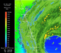 Florida Panhandle Pressure & Winds - 2:40 PM EDT 9/6 - Hurricane Frances is inland south of Tallahassee, Florida. This regional RadarPlus image also has counties overlaid.   Florida Radar MOVIE - Sept. 4 Hurricane Frances approaches the coast on the morning of September 4, 2004.