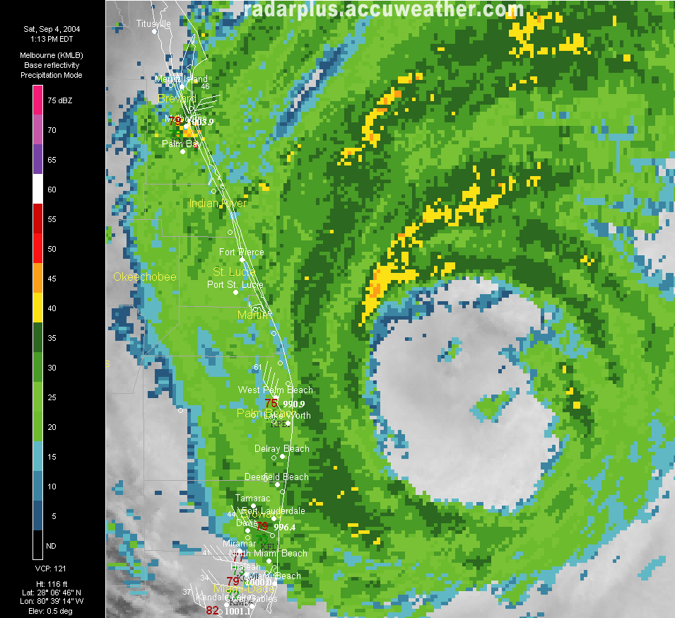 Miami Radar MOVIE - Sept. 4 Hurricane Frances approaches the coast, then pauses during the afternoon, hammering the coast with eyewall rain and wind.   Melbourne Radar MOVIE - Sept. 4 Hurricane Frances moves towards landfall on the eastern Florida coast during the afternoon and evening.